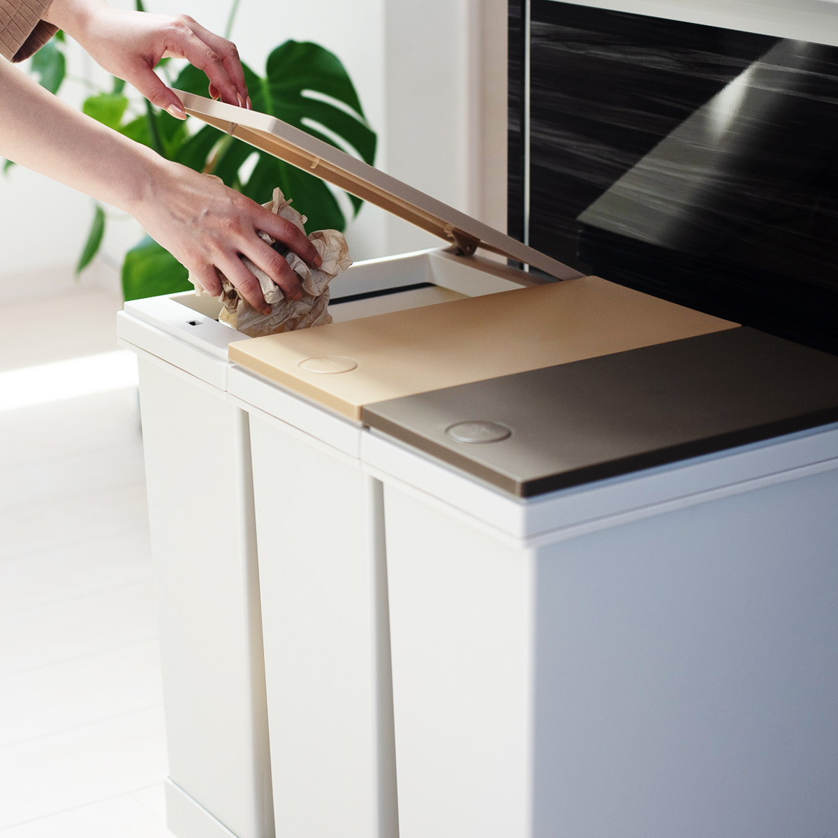 お部屋においても違和感がないよう、シンプルなデザインに仕上げられたダストボックス。インテリアに馴染みやすい落ち着いた色味なのでキッチンと一体化します。
