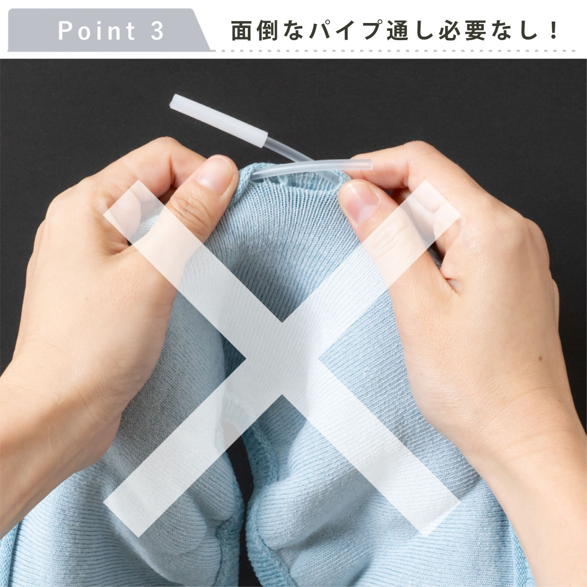 パイプ通しが不要のオリジナル製法で付け外しカンタン。装着時のイライラが解消され、時短にもなります。