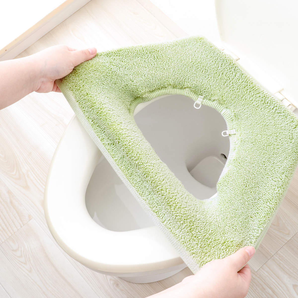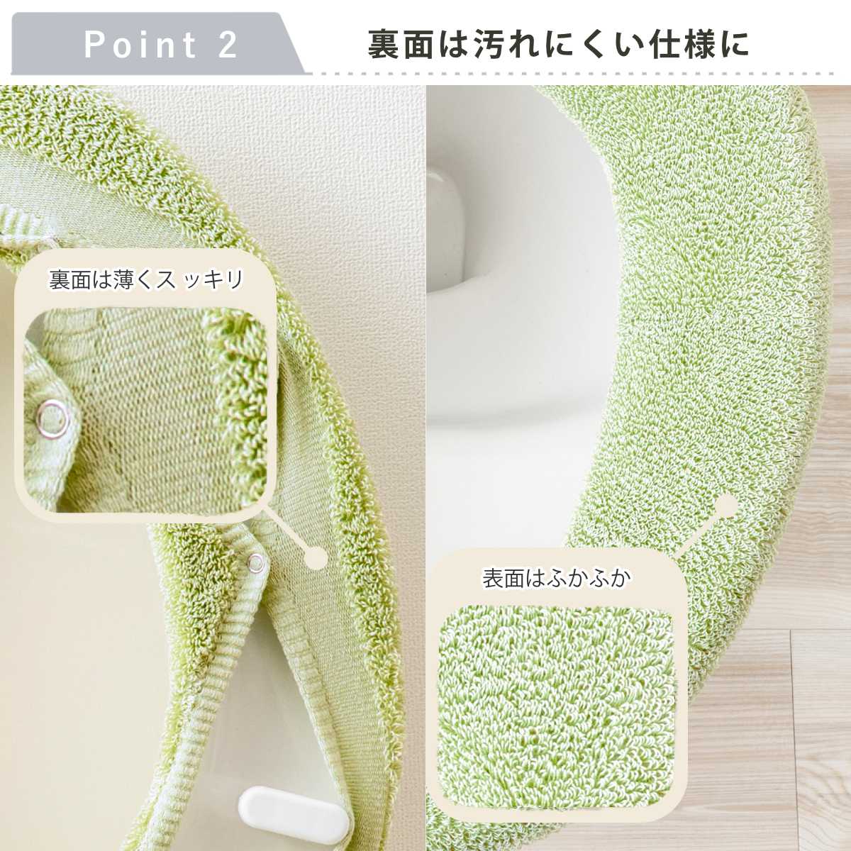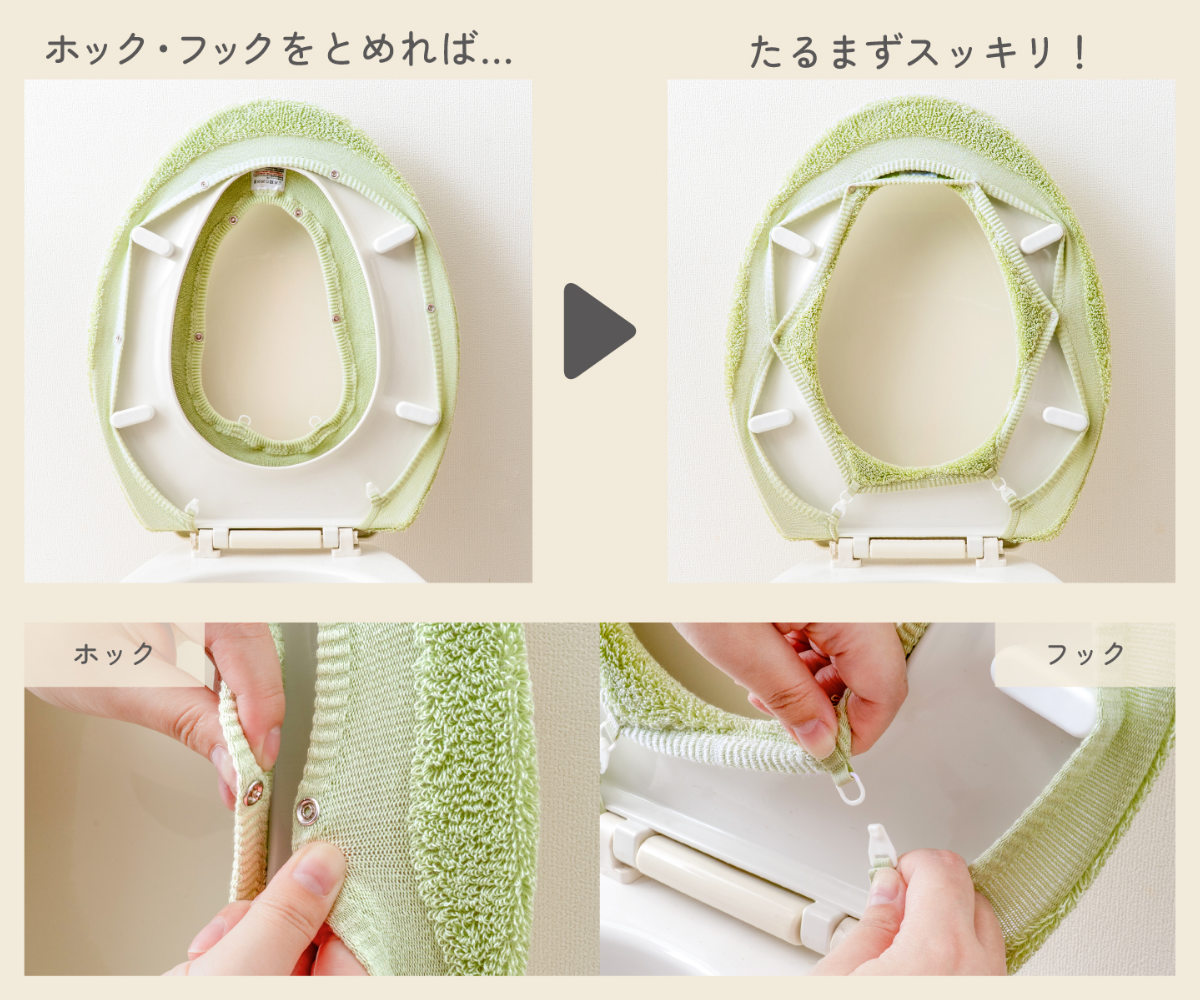 便座の裏面側にホックとゴム付きフックが付いているので、ピタッと装着できます。たるまずスッキリで、見た目も座り心地もバッチリです。