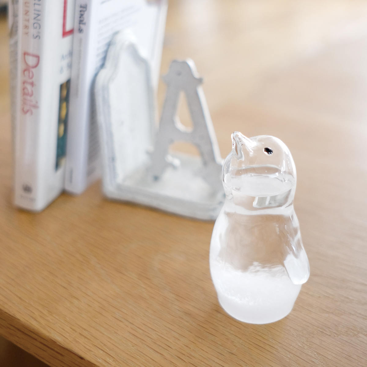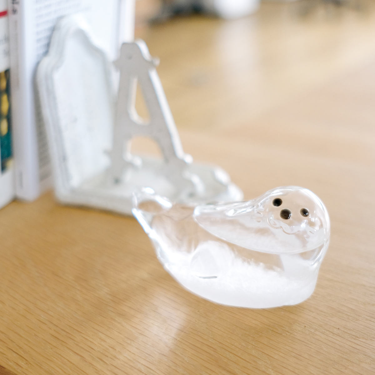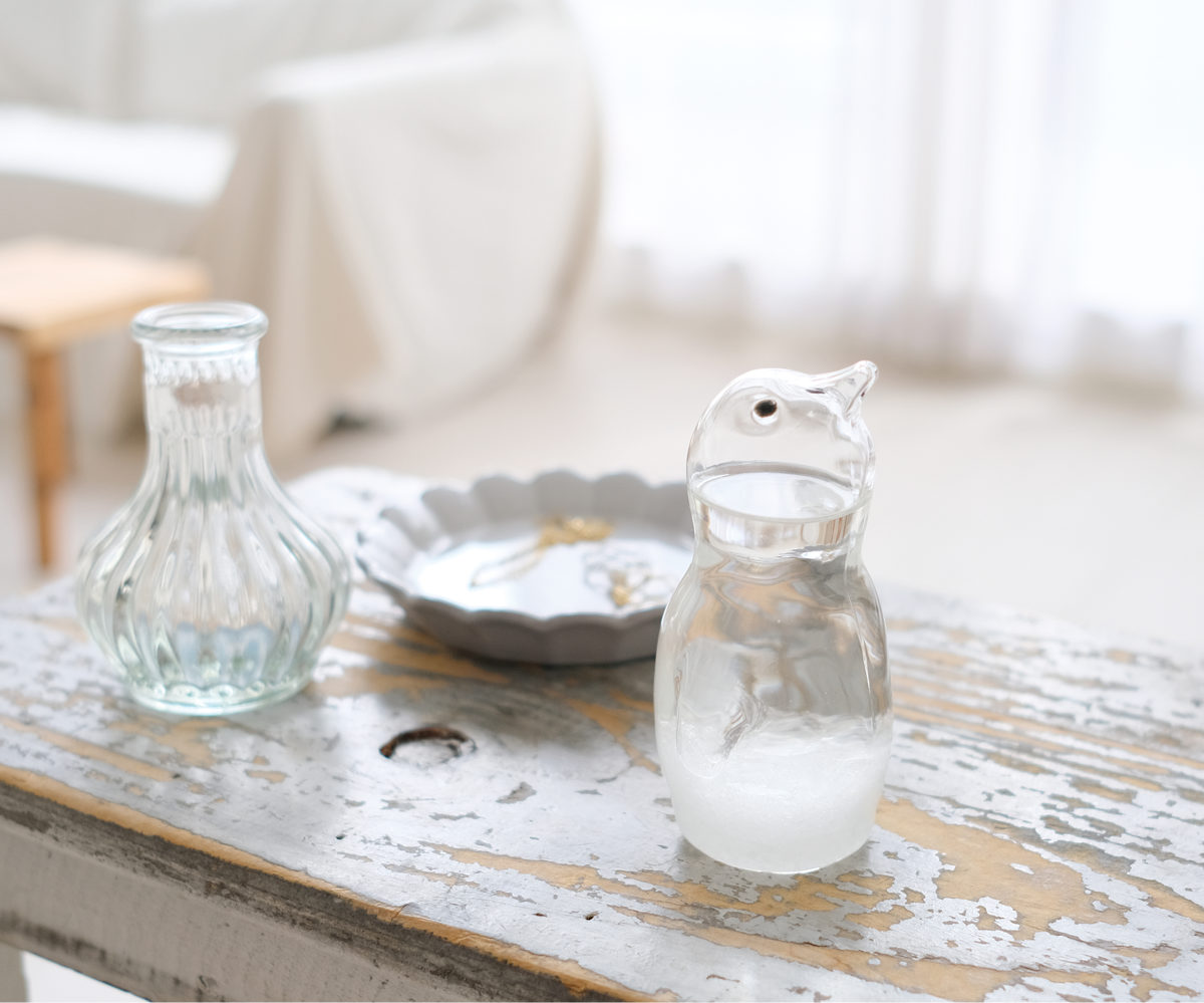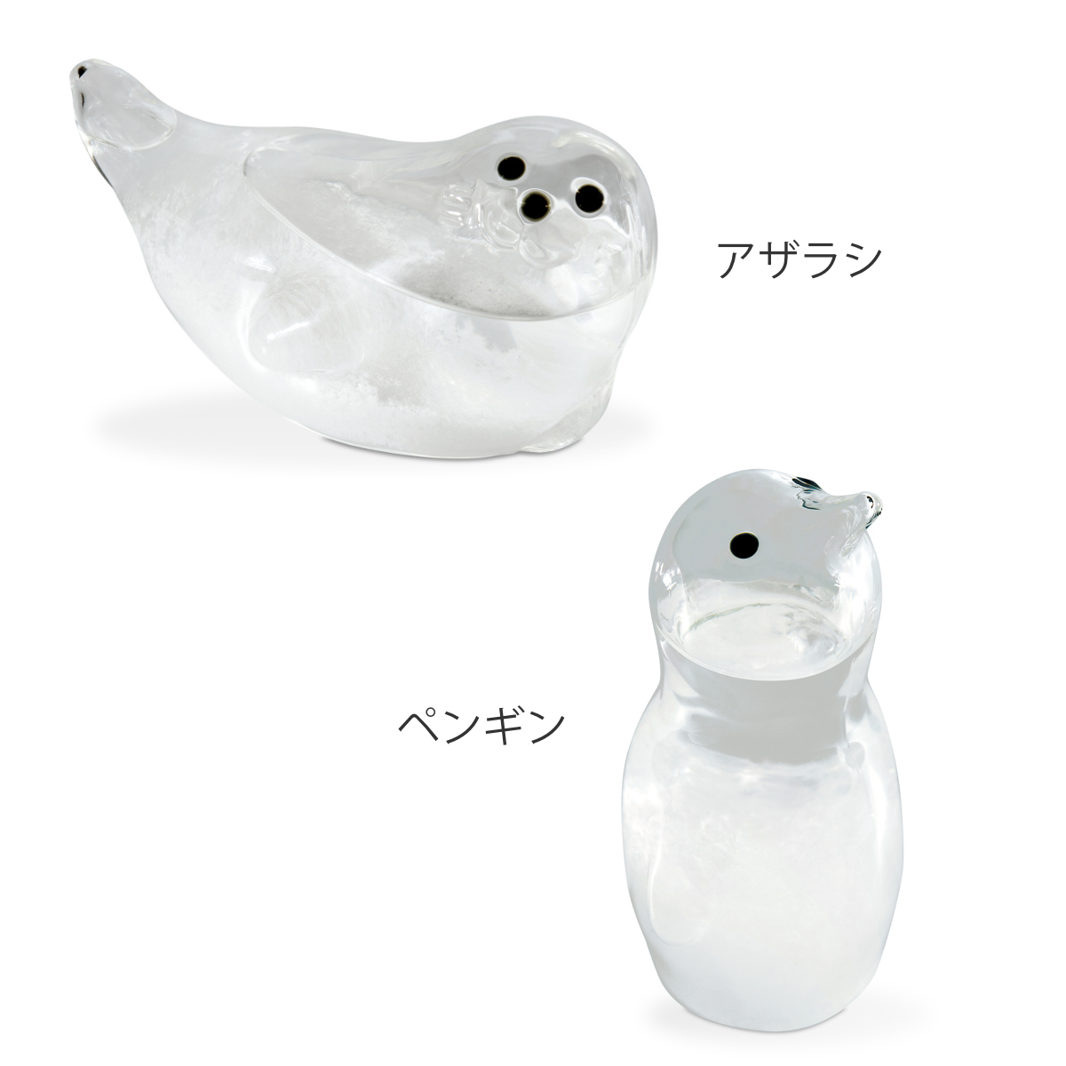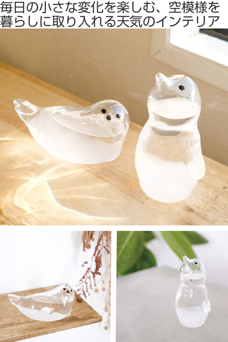 アザラシとペンギンをモチーフにした愛らしいストームグラスは、結晶の変化を眺めながら、ゆったりとした時間を楽しめるインテリアアイテムです。窓辺やデスクに置くだけで、天気や季節の移ろいを感じる、癒しのある暮らしを演出します。
