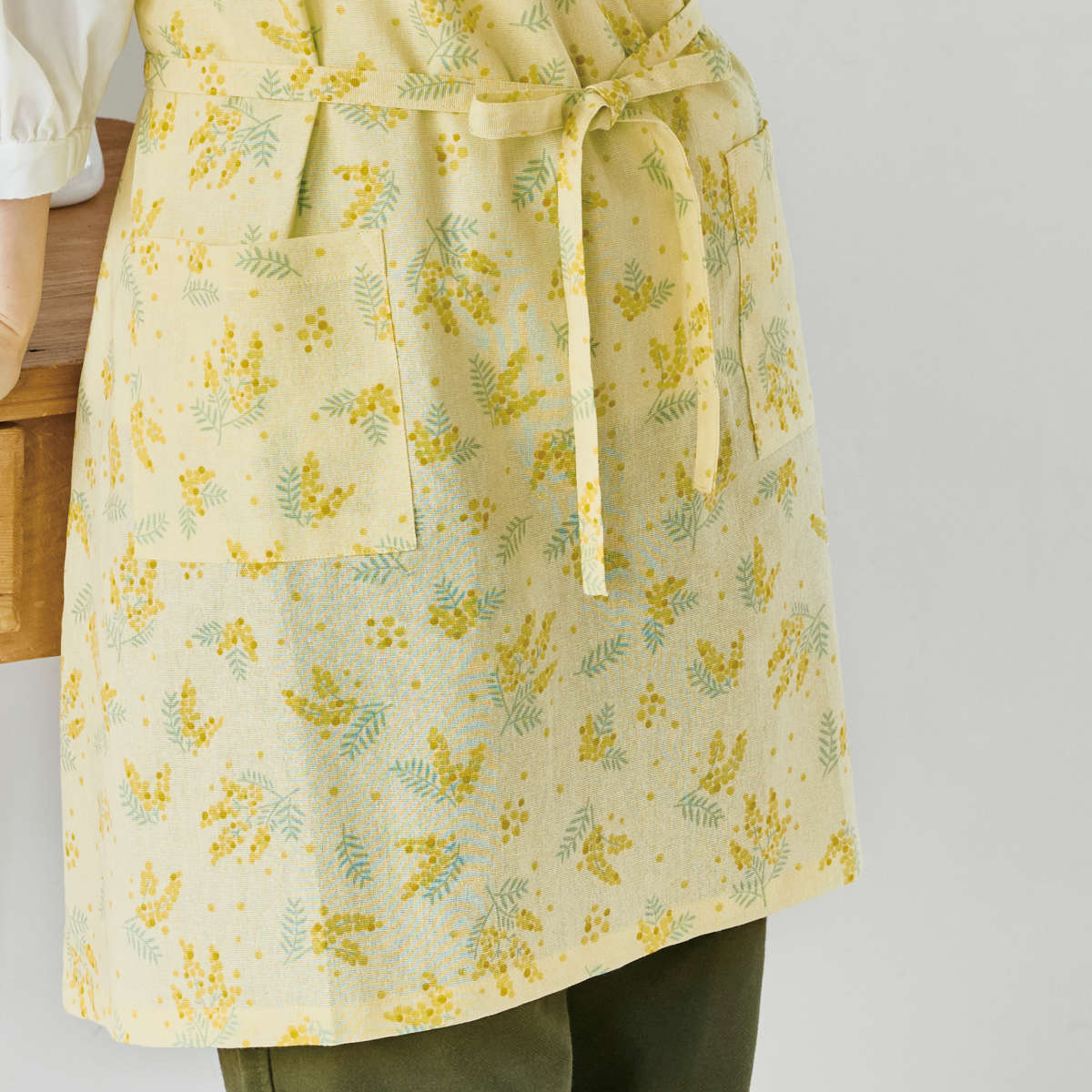 前で結ぶタイプなので体にフィットしやすく、作業中もずれにくいのが特長です。スマホやハンカチ、メモ帳などを入れられる便利なポケットが両サイドに付いており、家事がよりスムーズに行えます。