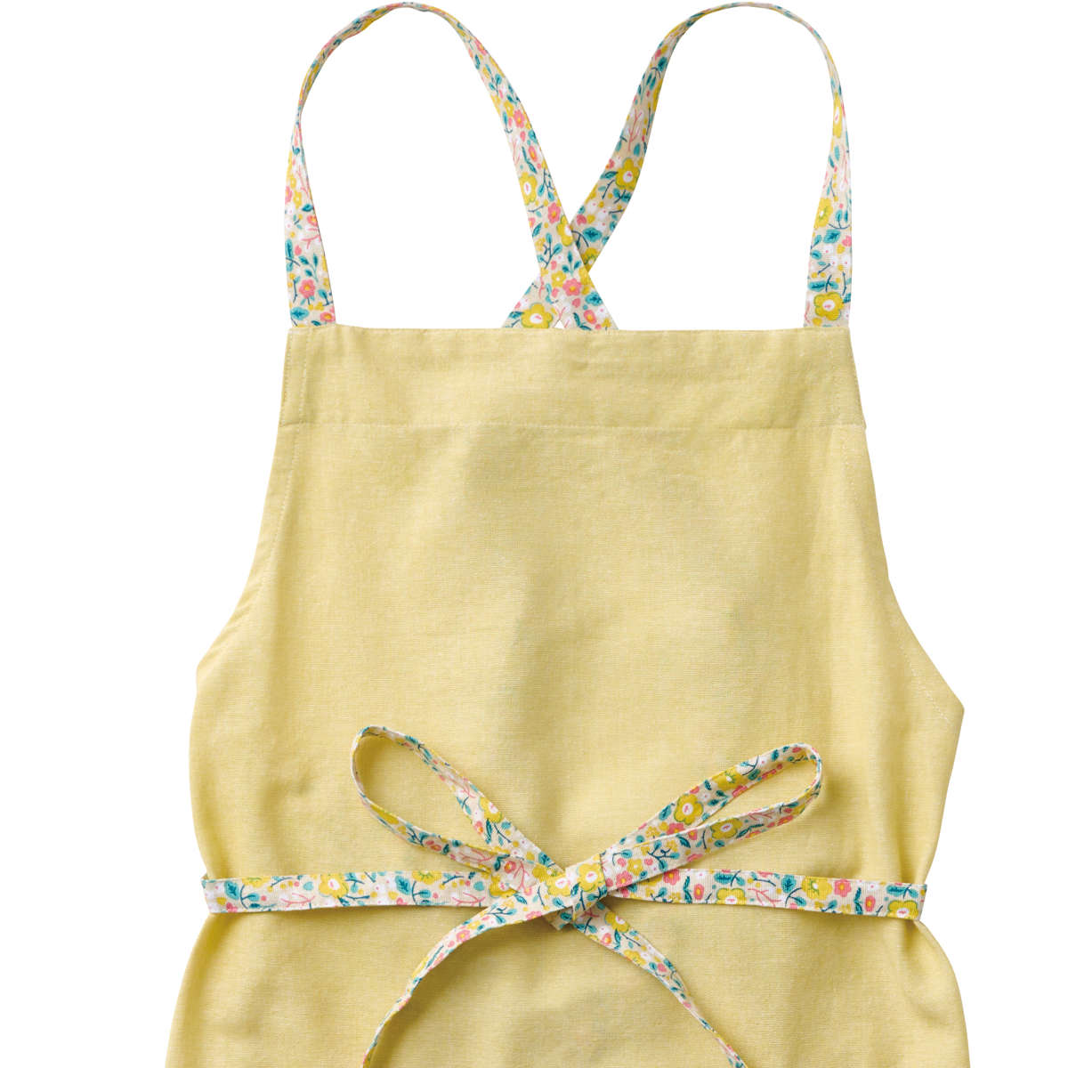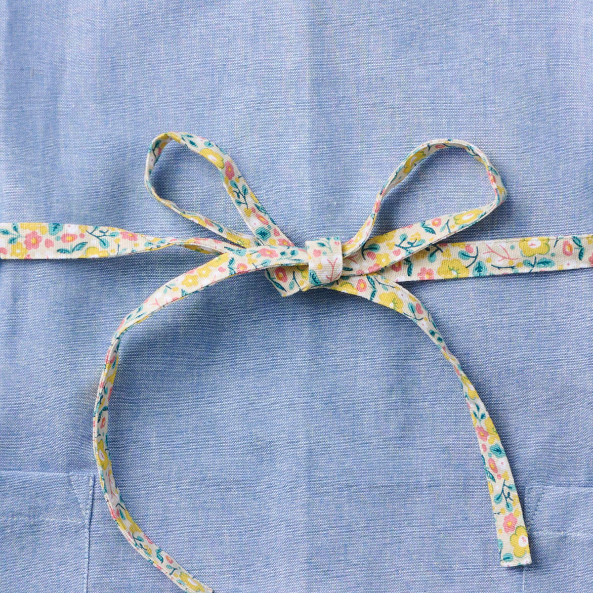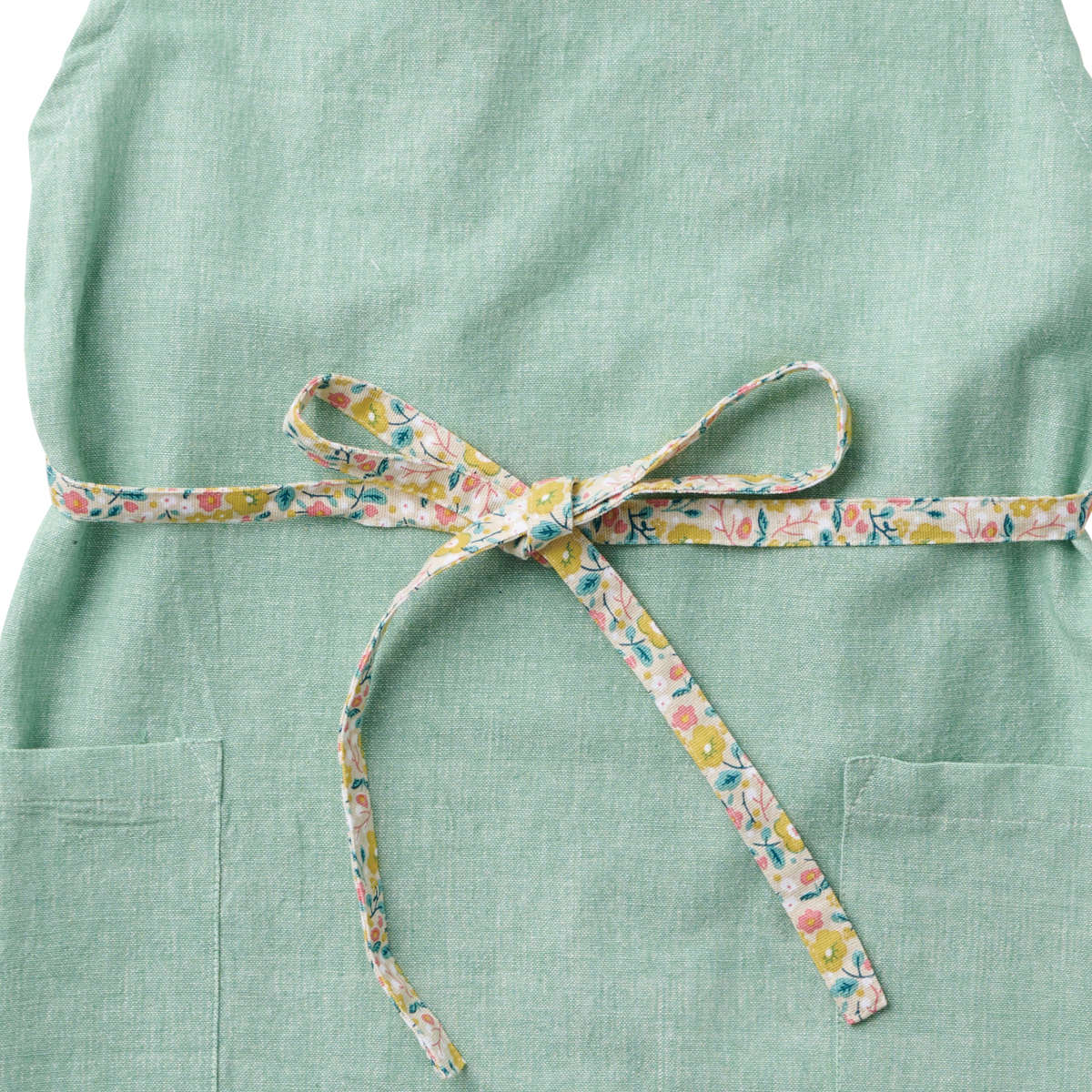 無地に見える生地に映える、花柄アクセントのエプロン