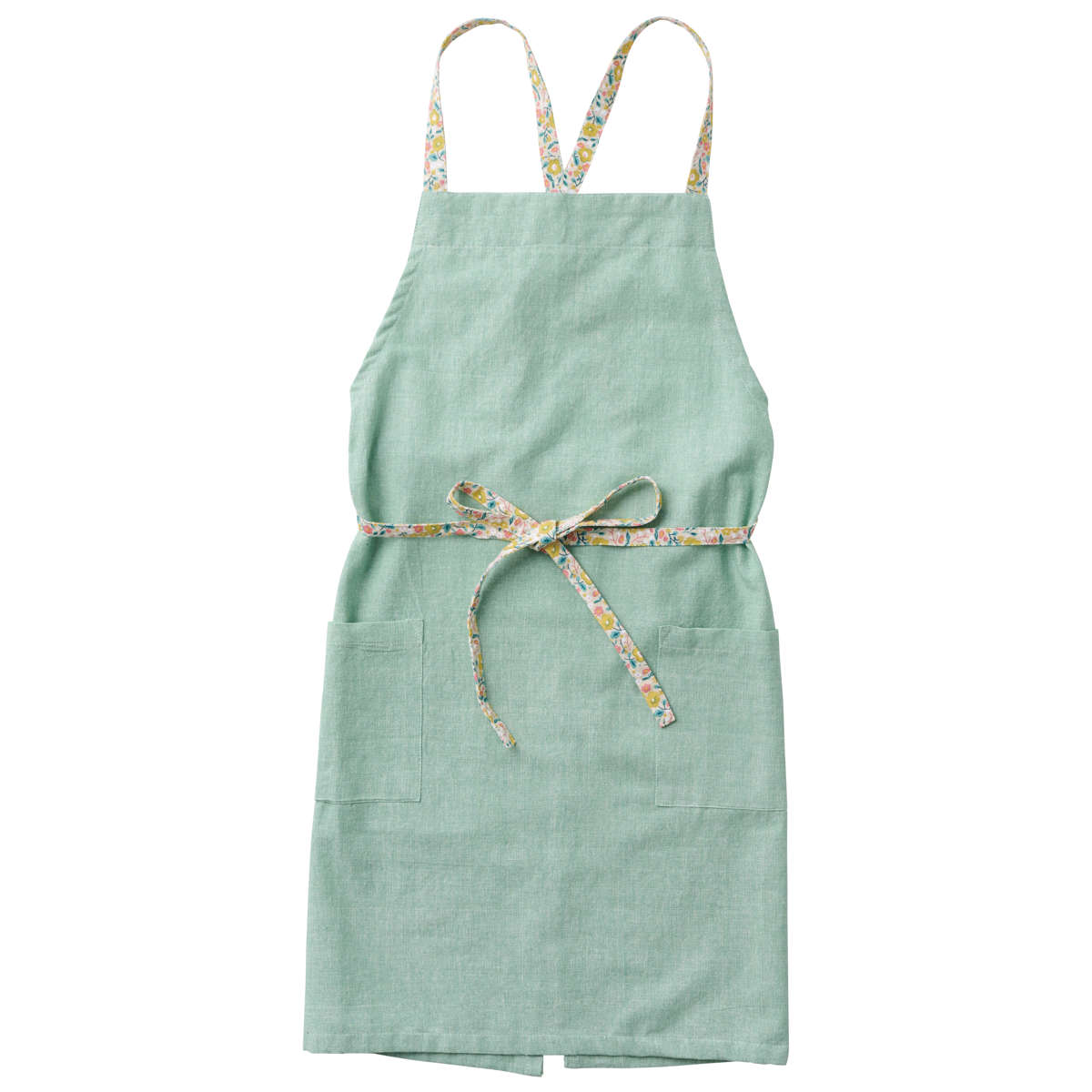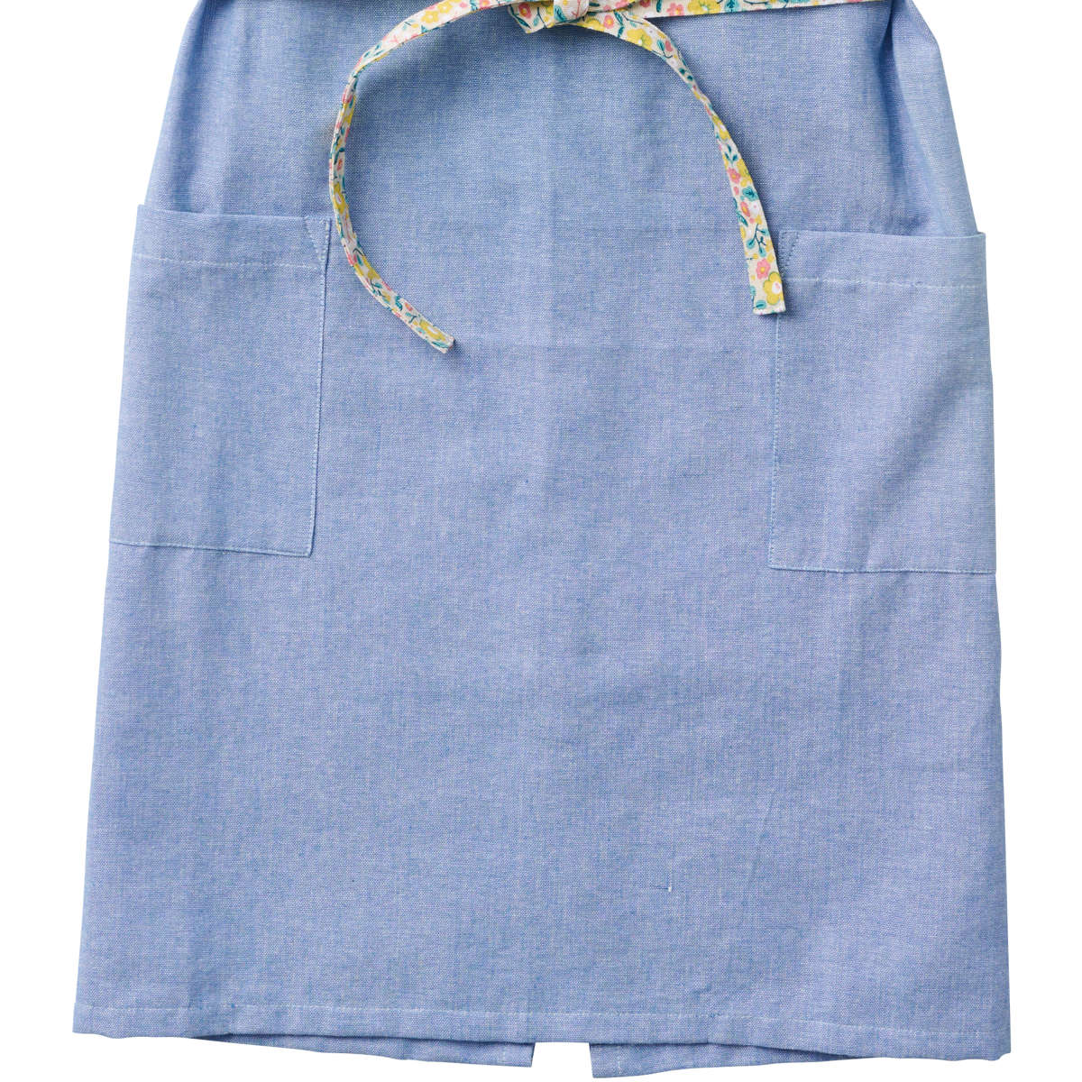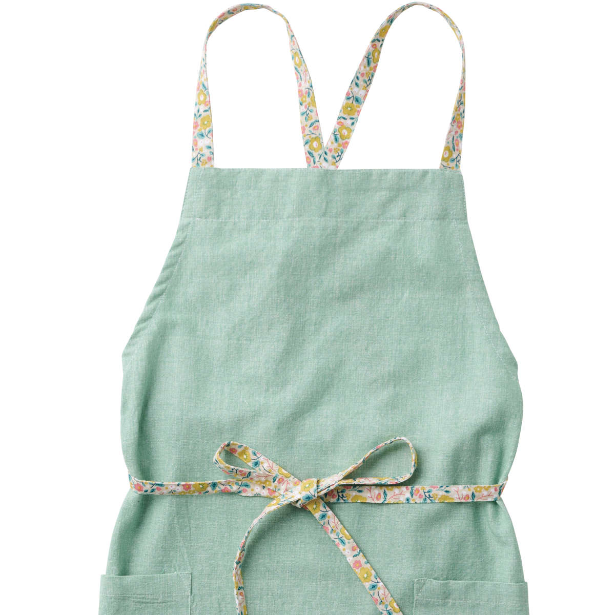 無地に見える生地に映える、花柄アクセントのエプロン