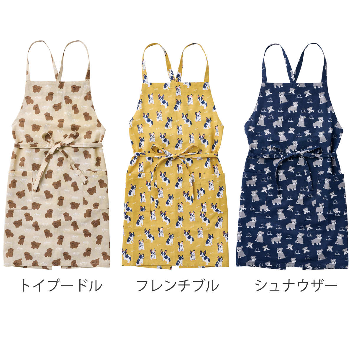 ペットとして人気の高い3種類の犬種を、愛らしいイラストで表現したエプロンです。犬種ごとの名前人気ランキングを参考に、それぞれのワンちゃんに名前を設定し、デザインに取り入れています。