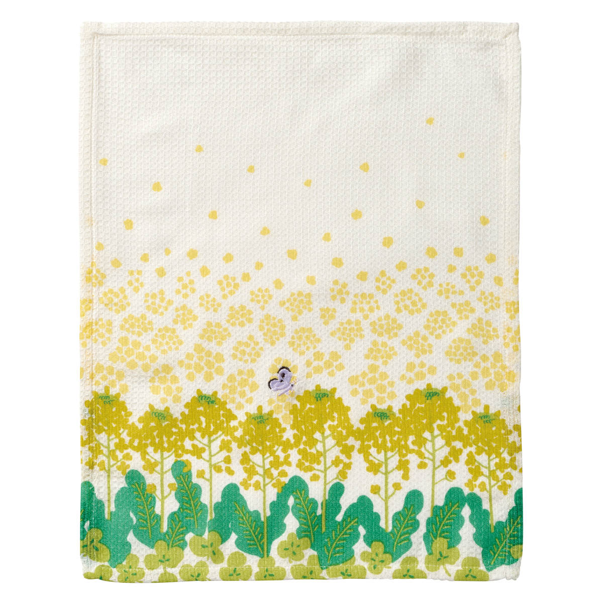 蝶や蜂、てんとう虫の可愛らしい刺しゅうがアクセントの布巾です。広げると1枚の絵に見え、干した時も華やかさのある布巾です。