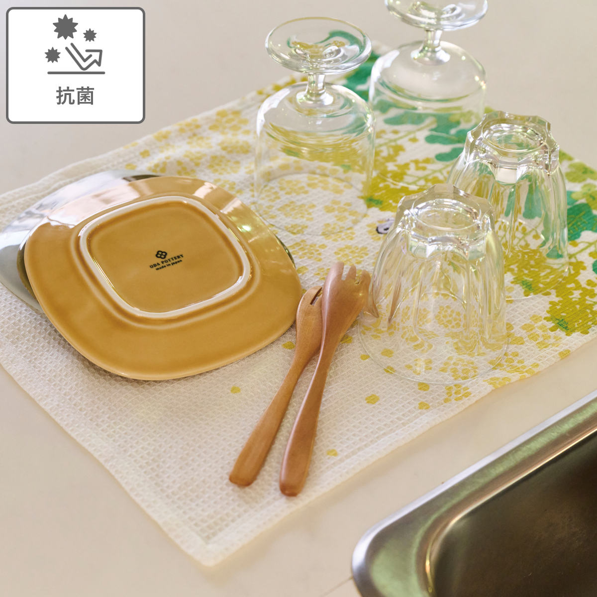 サッと水を拭き取るだけで、あっという間に食器が乾く吸水性の良さが特長です。布巾自体も薄く、乾きやすいため衛生的に使えます。