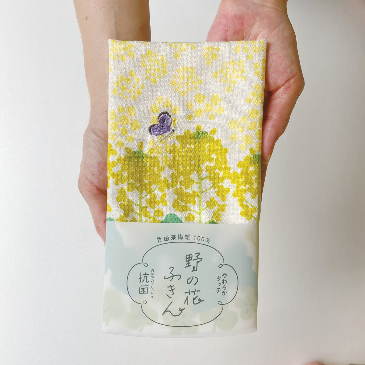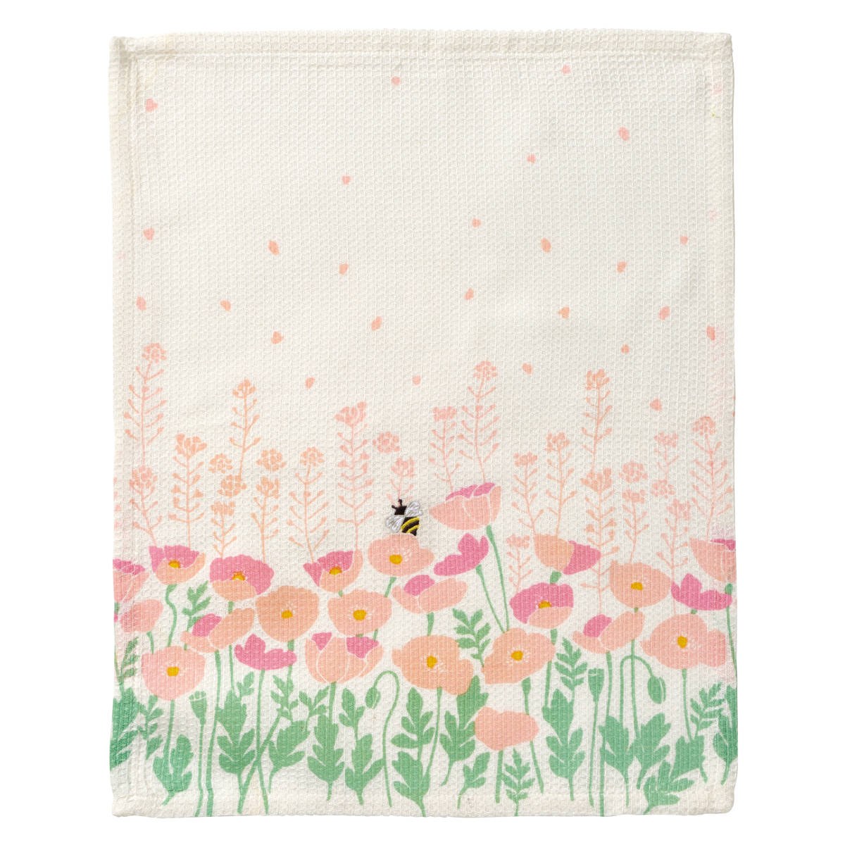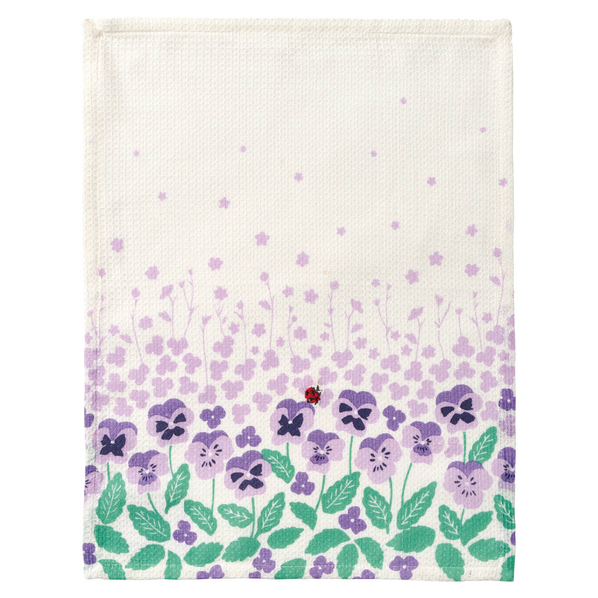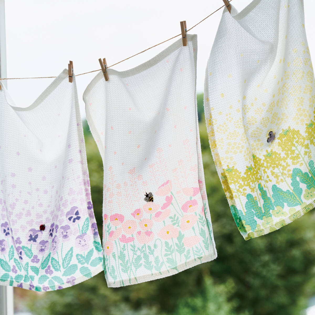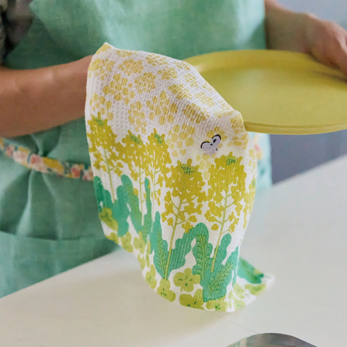 蝶や蜂、てんとう虫の可愛らしい刺しゅうがアクセントの布巾です。広げると1枚の絵に見え、干した時も華やかさのある布巾です。