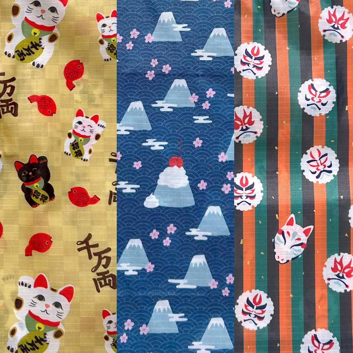 招き猫×市松(繁栄)、富士×青海波(幸運)、隈取×雪花(豊作)など、縁起の良い柄を組み合わせたデザインです。外国の方へのギフトやお土産にもおすすめです。柄の中には、それぞれにちなんだユニークなモチーフが所々にあしらわれています。じっくり観察して、ぜひ見つけてみてください。