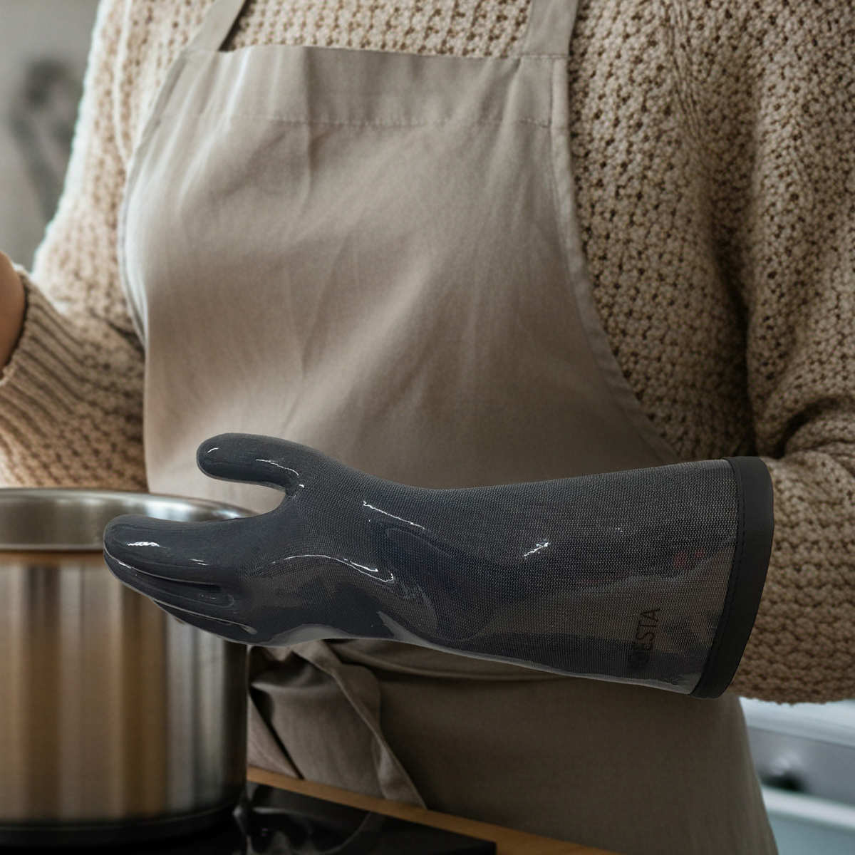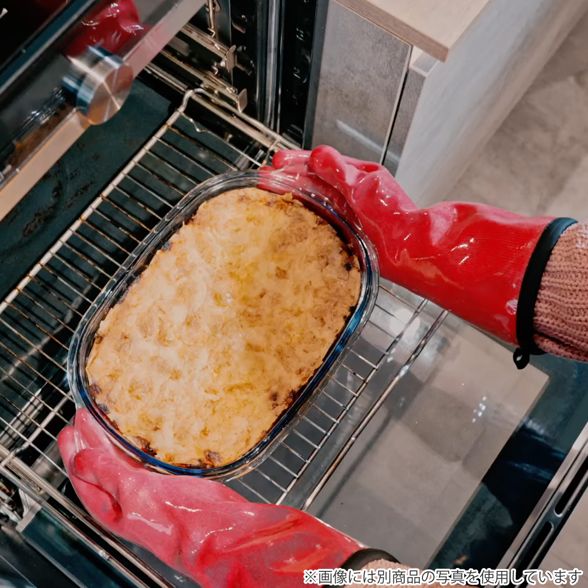 肘下までしっかり守るロングタイプです。250度に耐える高機能で、高温のオーブンや電子レンジの出し入れも安心して使えます。