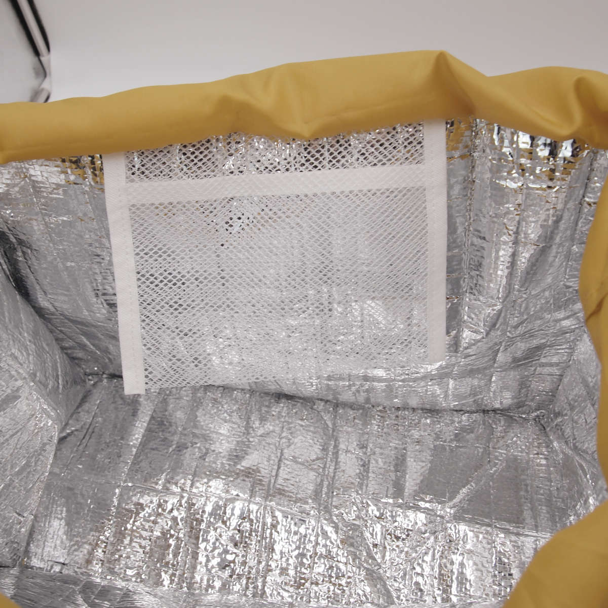 保冷剤を入れられるポケットと内側アルミシート付きで、冷たい状態をしっかりキープし、食品の鮮度を守ります。
