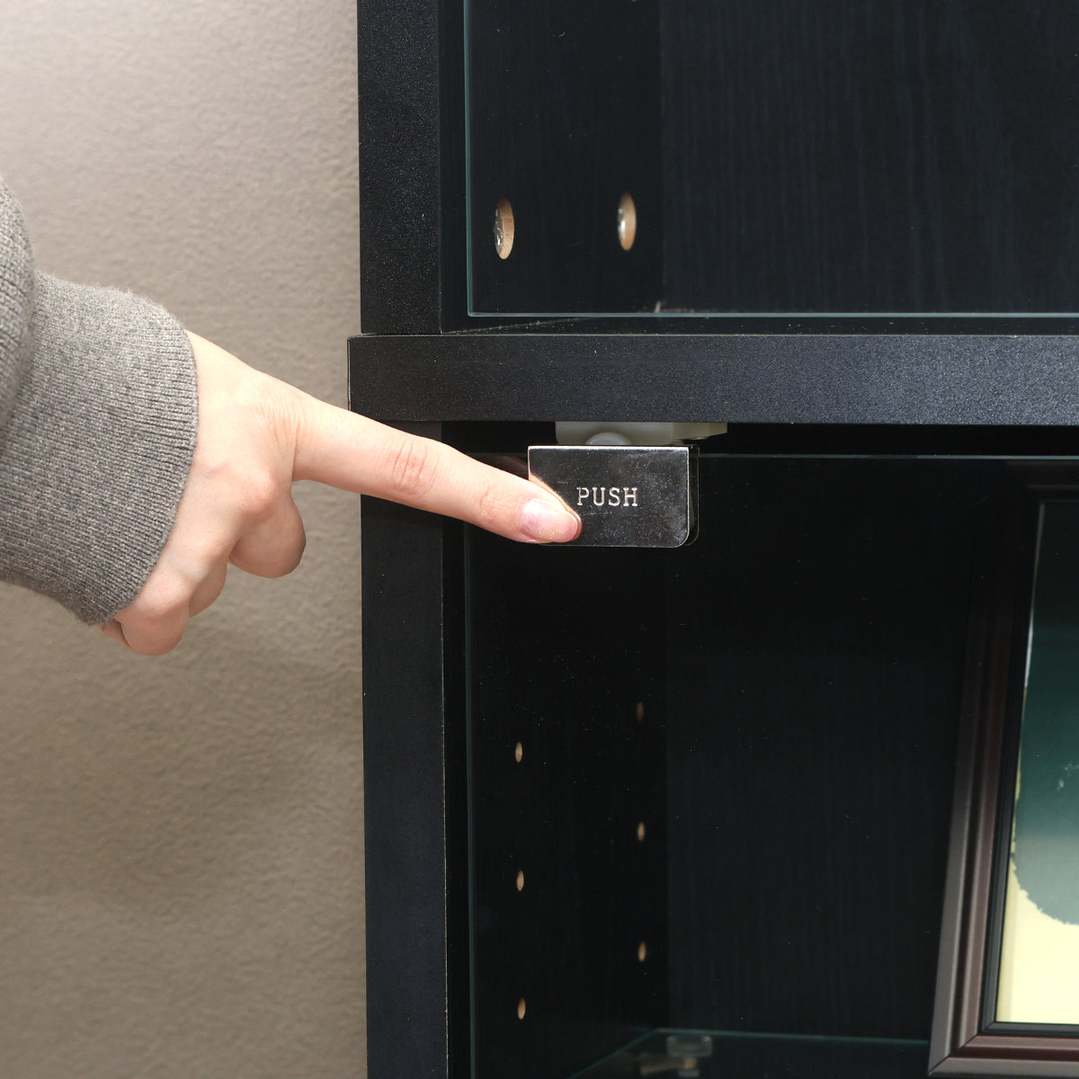 片手でもラクに開閉できるプッシュ式ドアで、シンプルなデザインを保ちながらコレクションを守れます。