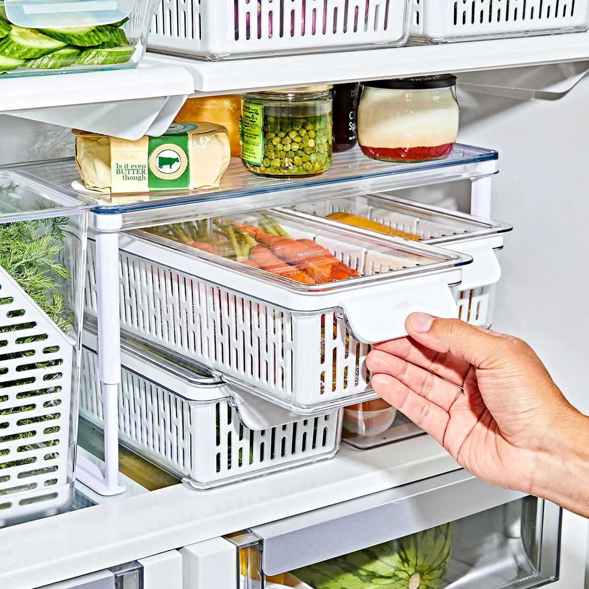 サイズ違いのコンテナと組み合わせれば、冷蔵庫内に統一感が出て、スッキリ整理できます。