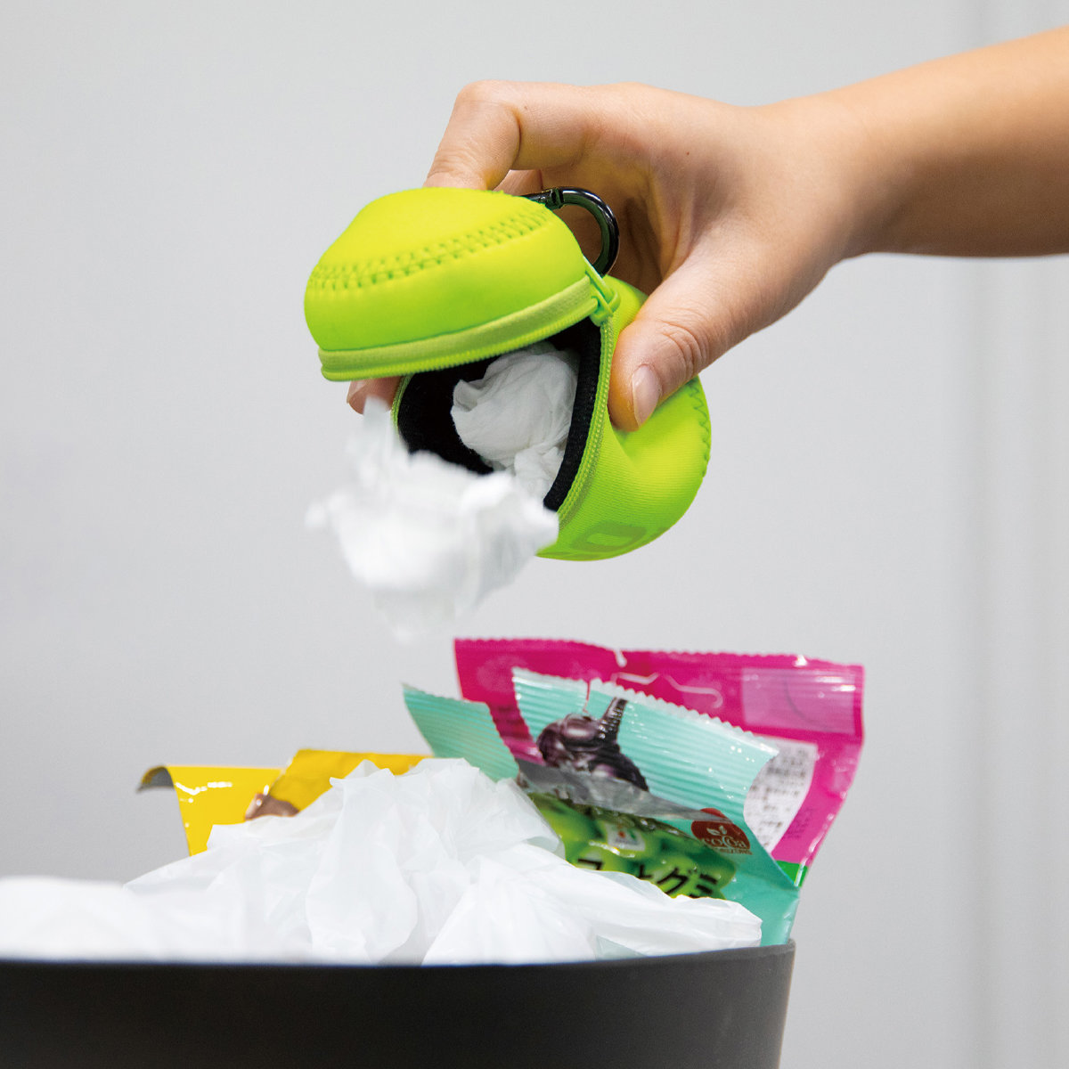 使用済みのティッシュ、お菓子の包み紙、不要なレシートなど、お出かけ中に発生するちょっとしたゴミをサッと捨てられる携帯ゴミ箱です。