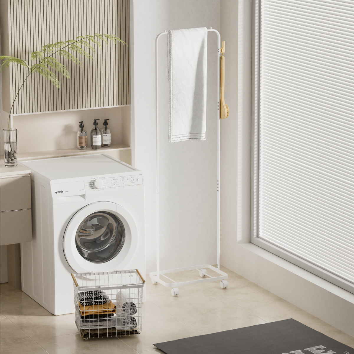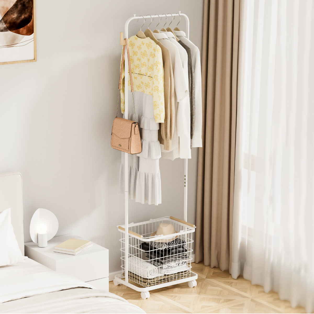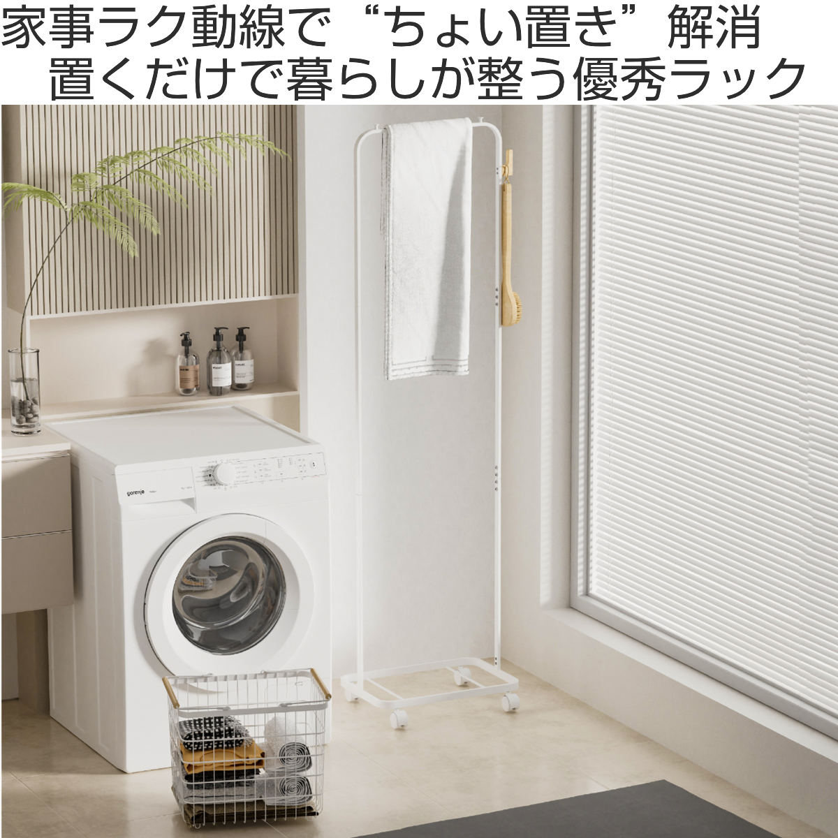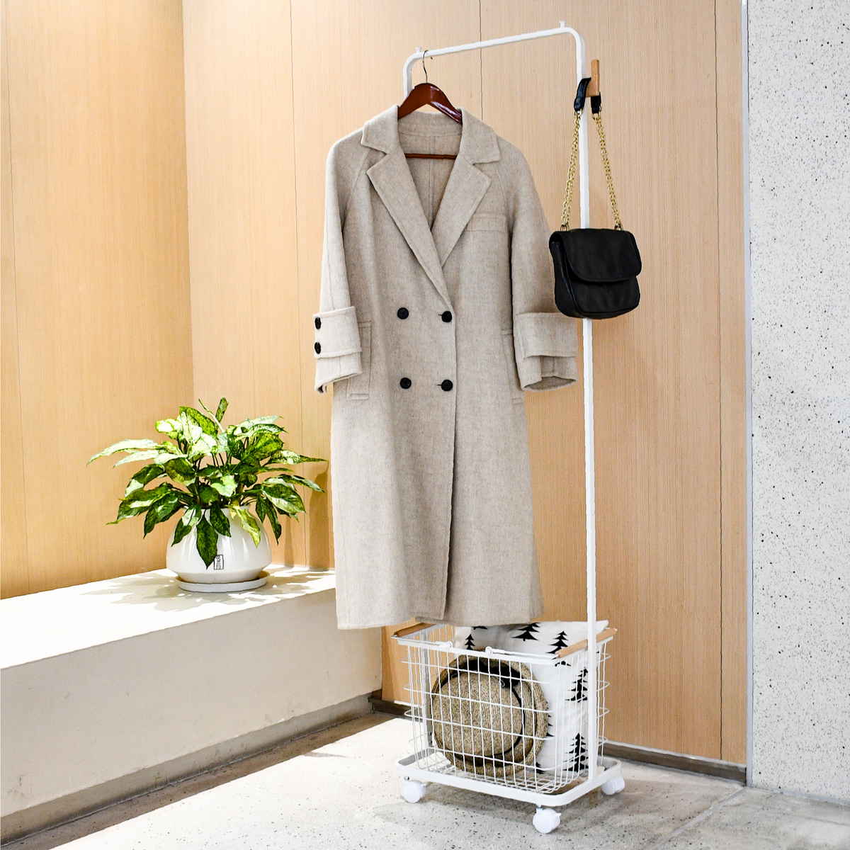 毎日の「とりあえず置き」がスッキリ片付く、かご付きハンガーラックです。洗濯前後の一時置き、翌日のコーデ準備、玄関のアウター掛けまで、家中の散らかりポイントをこの1台で解消します。うれしいスリム設計で場所を取らず、片付けや家事が驚くほどスムーズになります。