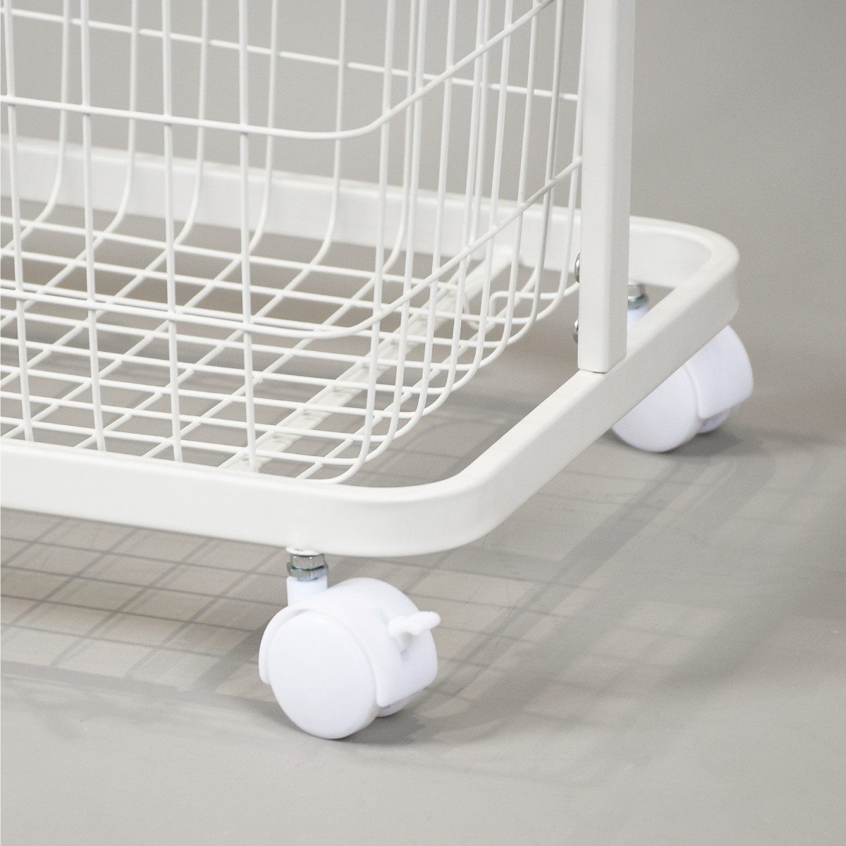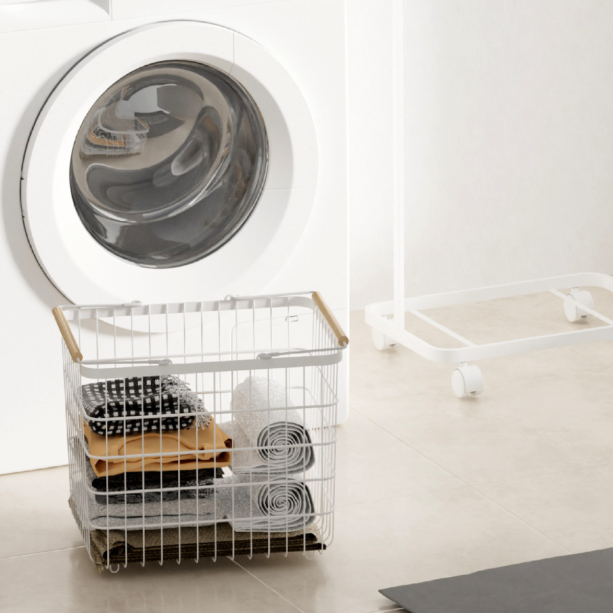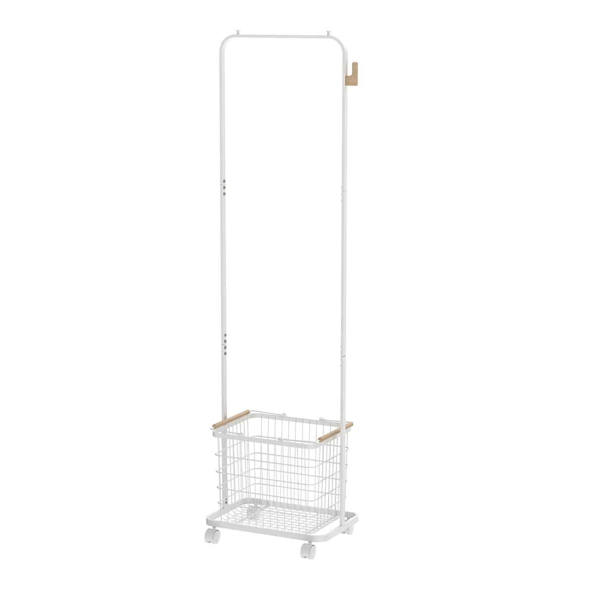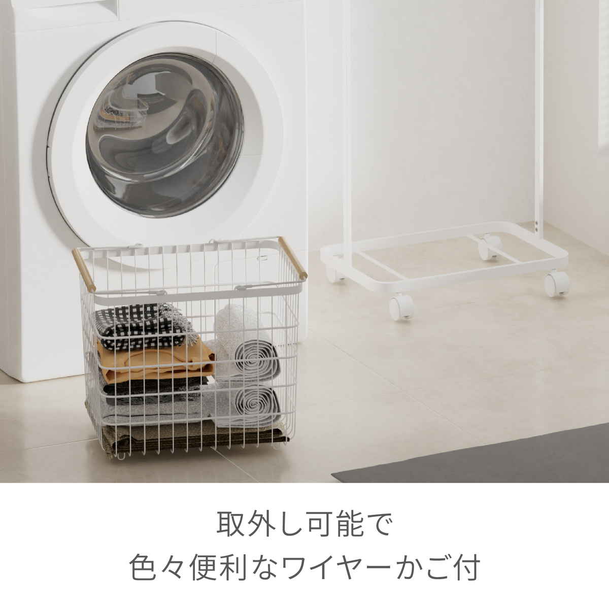 付属のワイヤーかごは取り外しができます。脱衣所でランドリーバスケットとしてや、畳んだ洗濯物を各部屋へ運んだり、玄関ではカバンや帽子入れにもできます。温かみのある木製のハンドルがインテリアのアクセントになります。