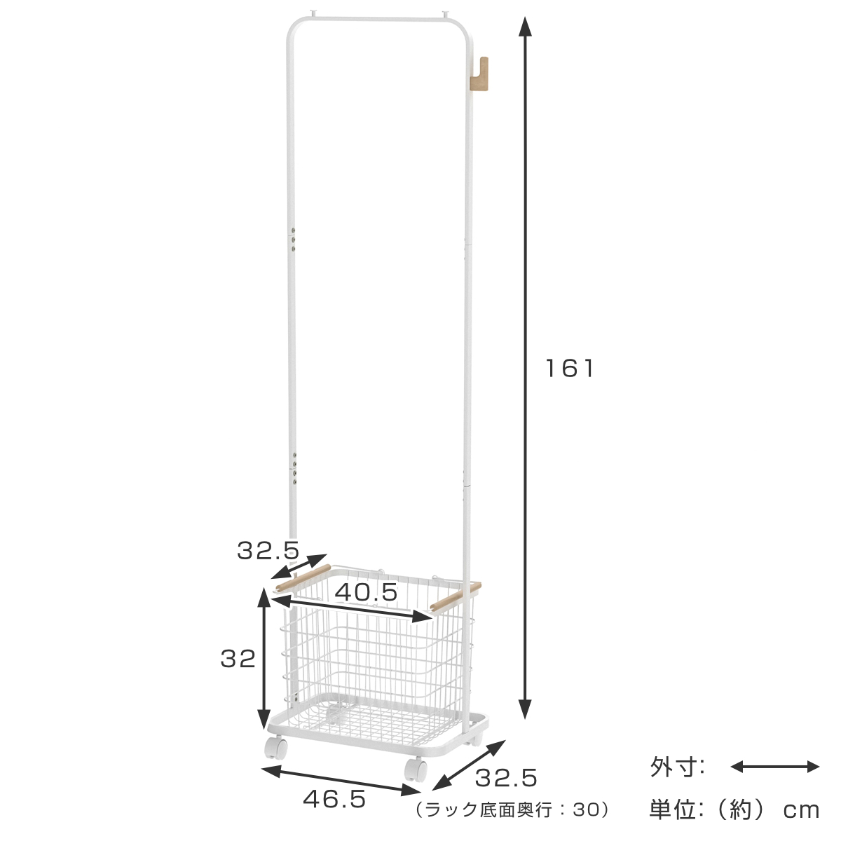 | サイズ | 本体:約 幅46.5×奥行32.5×高さ161(cm) ※ラック底面奥行:32.5cm ワイヤーかご:約 幅40.5×奥行32.5×高さ32(cm) |