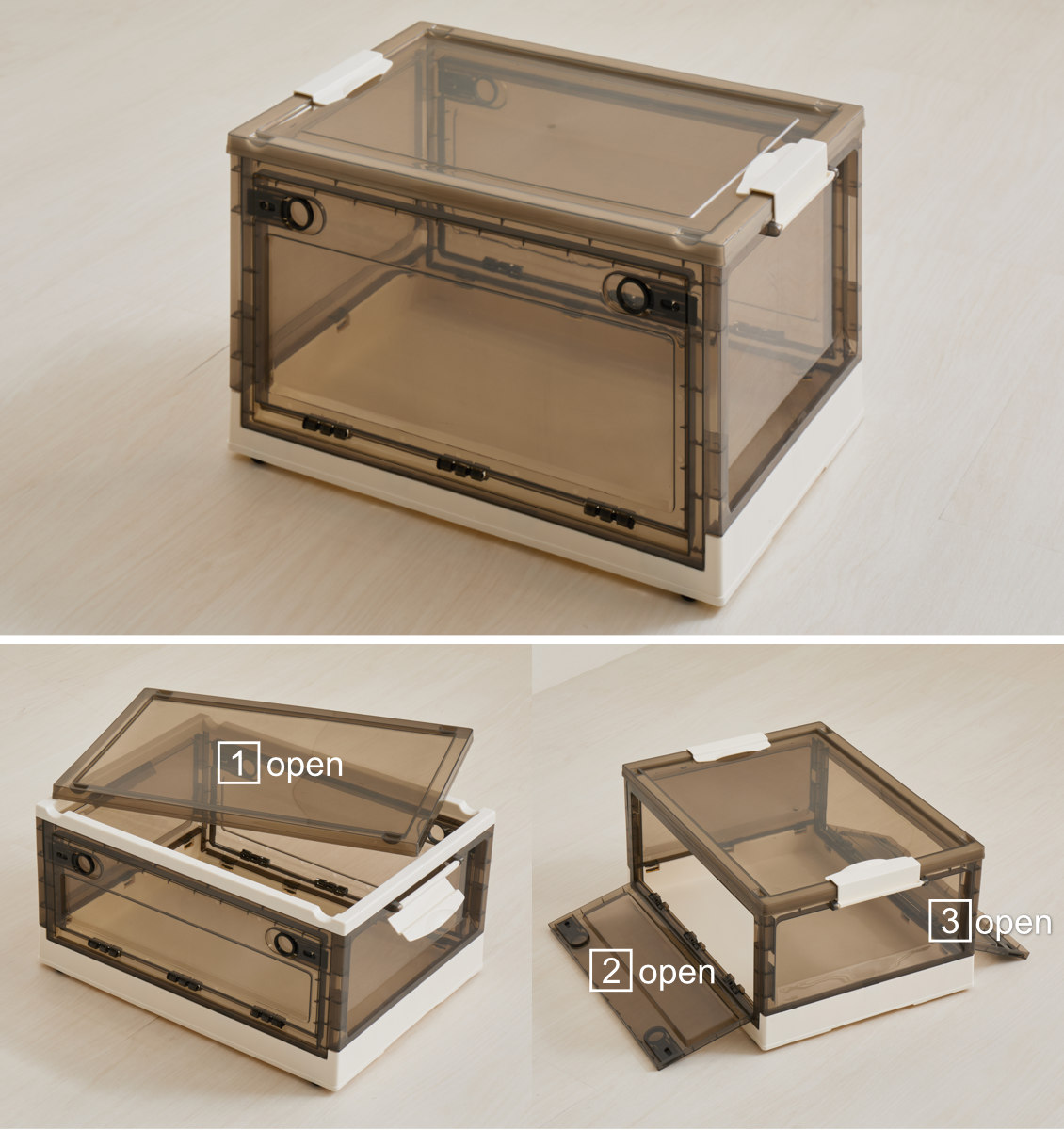 3面オープン式の積み重ねできる折りたたみ収納ケース