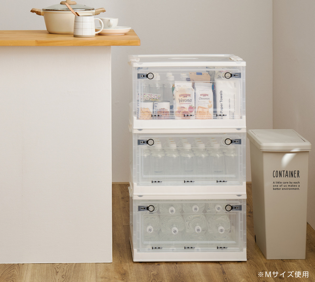 Lサイズは、ペットボトルや缶詰などのストックや、日用品のまとめ買い収納に便利なサイズです。リビングやキッチンでの収納におすすめです。