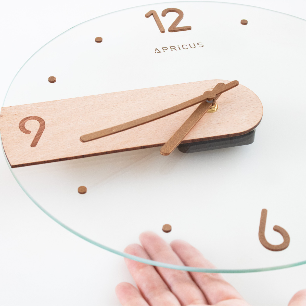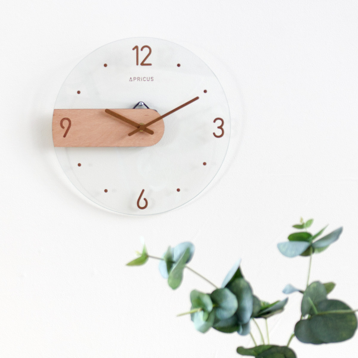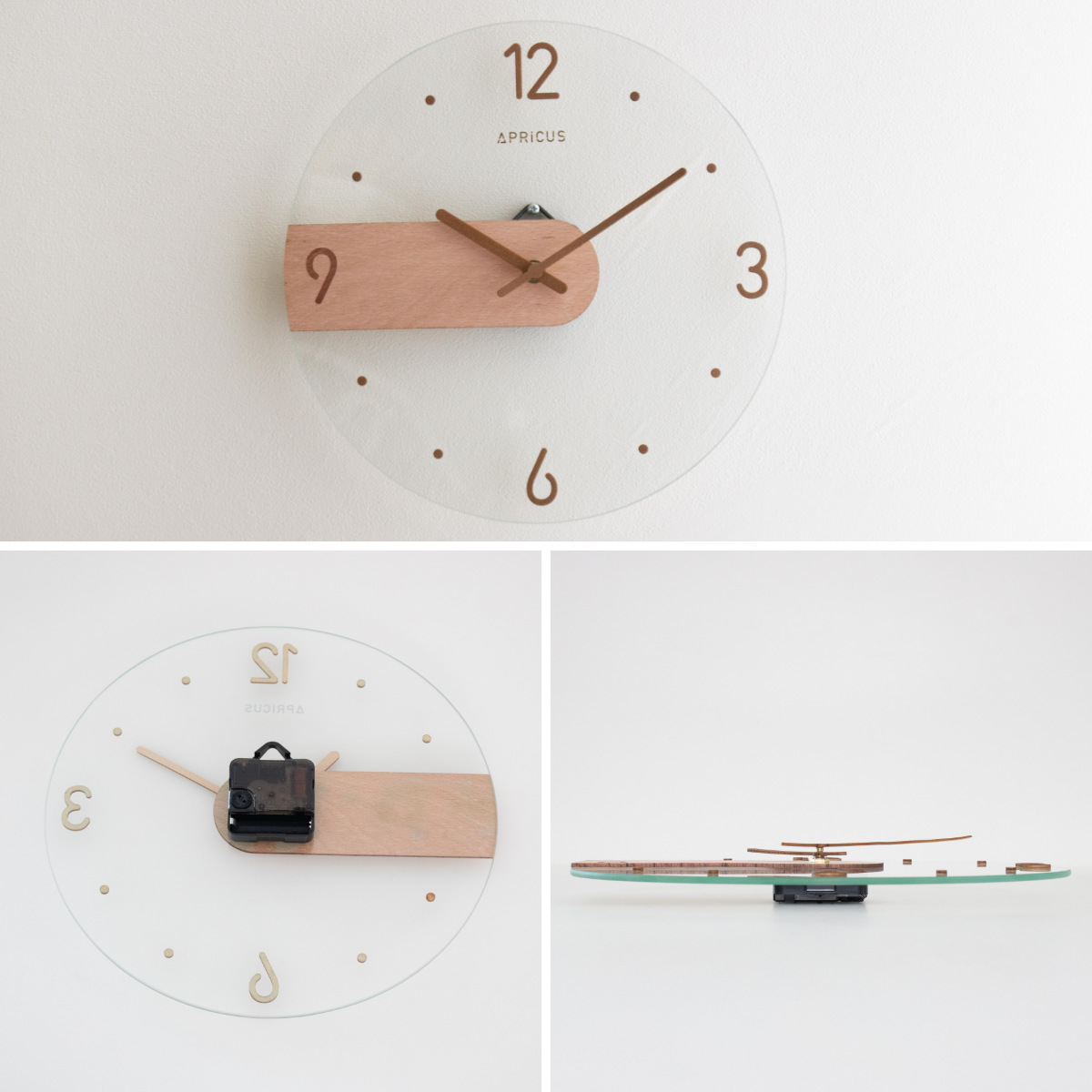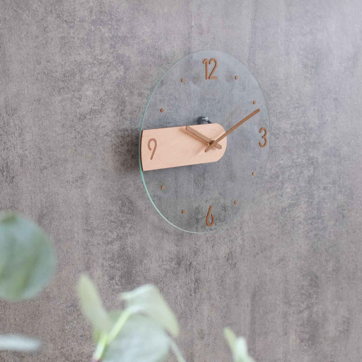 光の反射が美しいガラス面に、マットで温かみのあるMDF素材のパーツを組み合わせたデザイン時計。質感の異なる素材のコントラストが引き立ち、装飾を抑えた佇まいが現代的な印象を演出します。