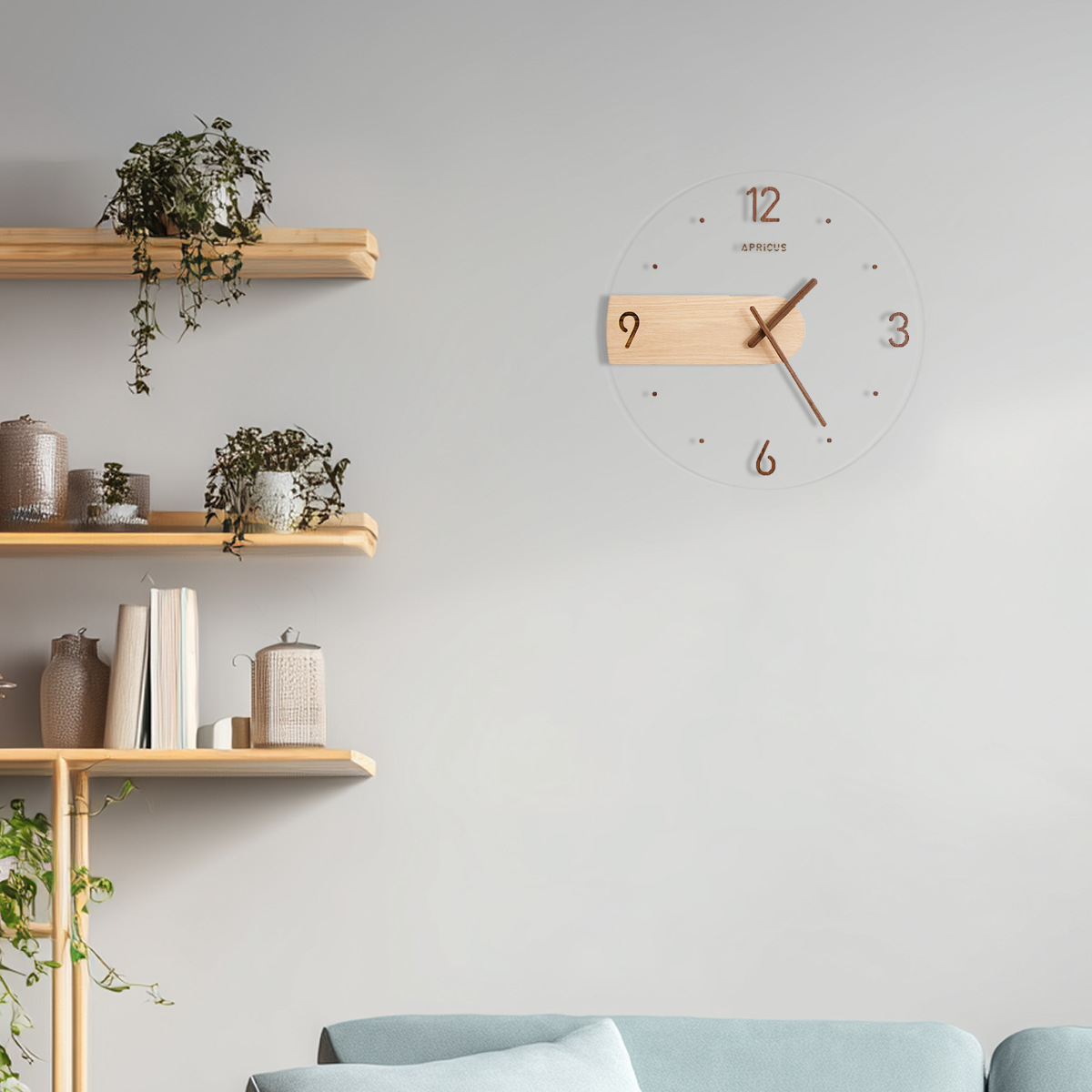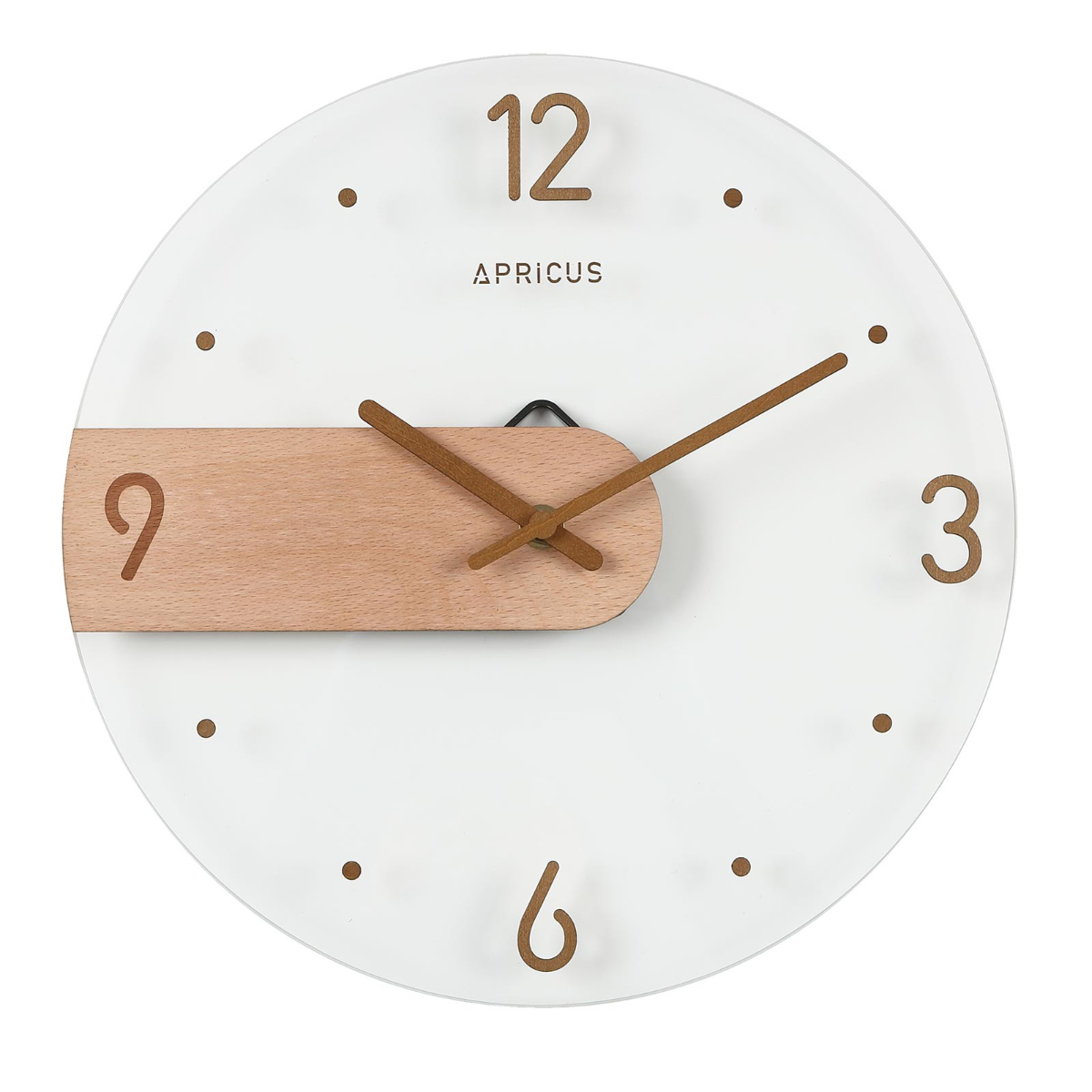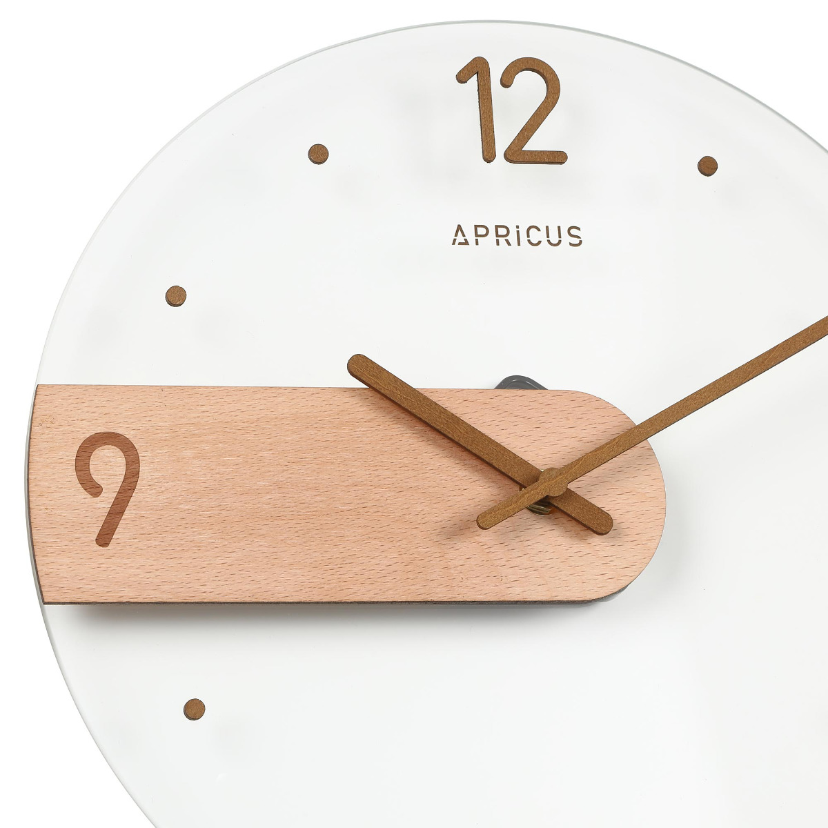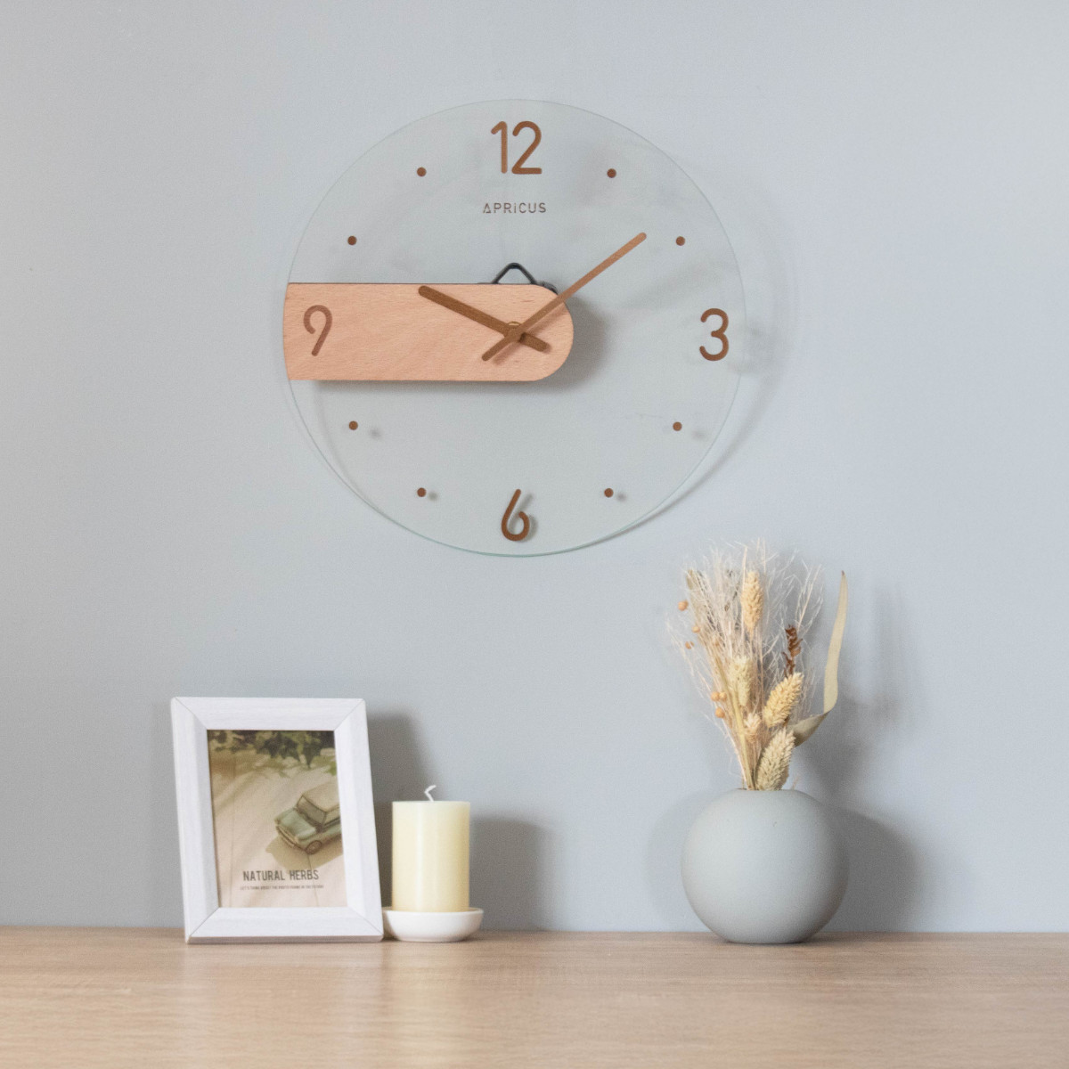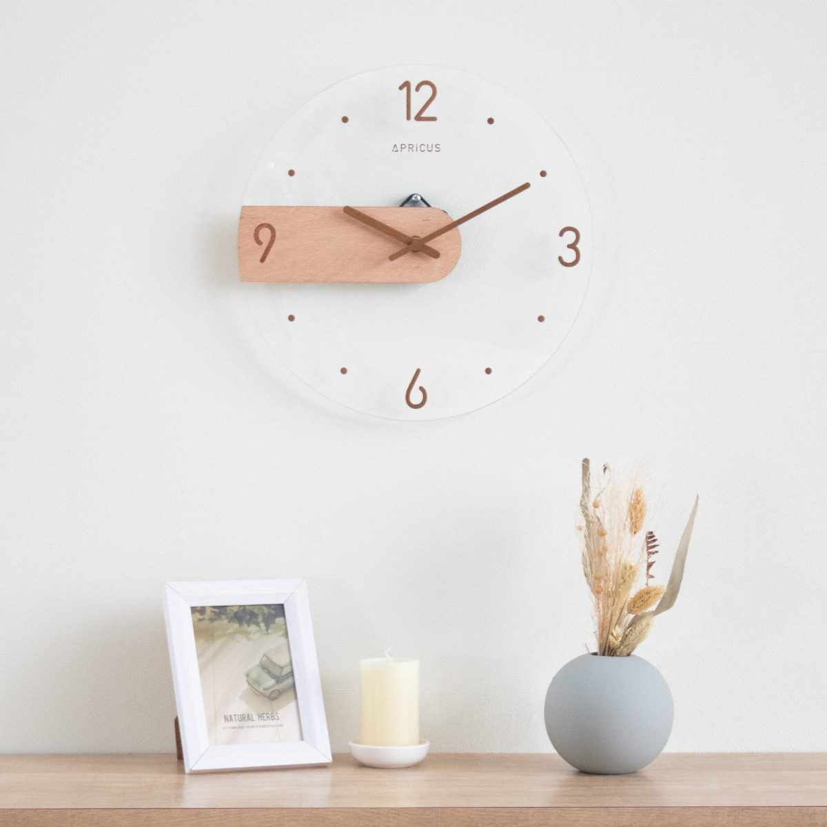 光の反射が美しいガラス面に、マットで温かみのあるMDF素材のパーツを組み合わせたデザイン時計。質感の異なる素材のコントラストが引き立ち、装飾を抑えた佇まいが現代的な印象を演出します。
