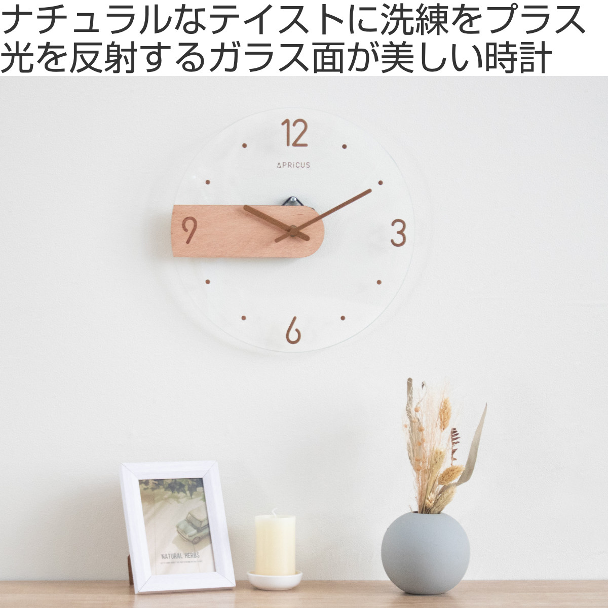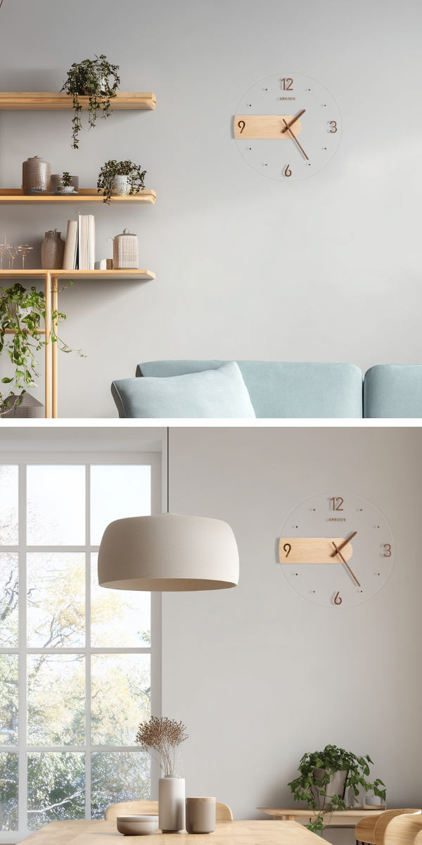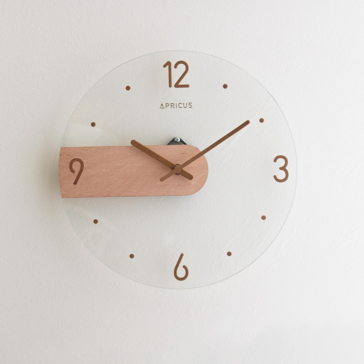 光を反射するクリアなガラス文字盤は、見る角度によってさまざまな表情を見せてくれます。壁に掛けることで、文字盤上の数字や針が浮かび上がるように映え、壁面をやさしく彩ります。