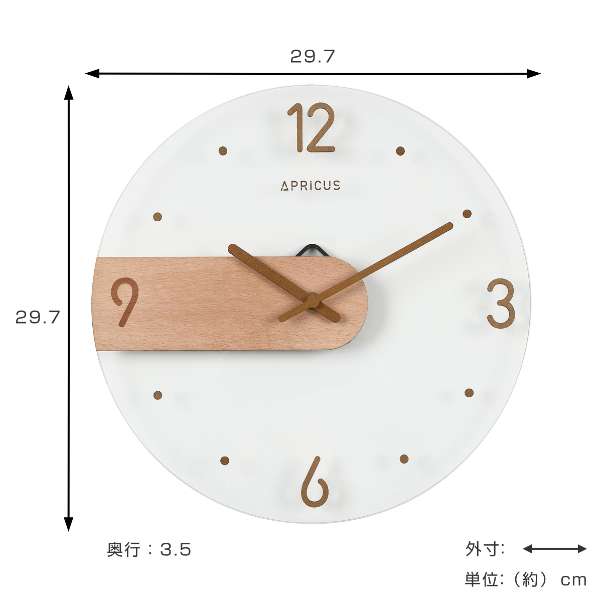 直径約29.7cmの、一般的な掛け時計として使いやすいサイズ感で、リビングや寝室、ワークスペースなど幅広い場所になじみます。存在感がありながら主張しすぎず、空間のバランスを取りやすい大きさです。