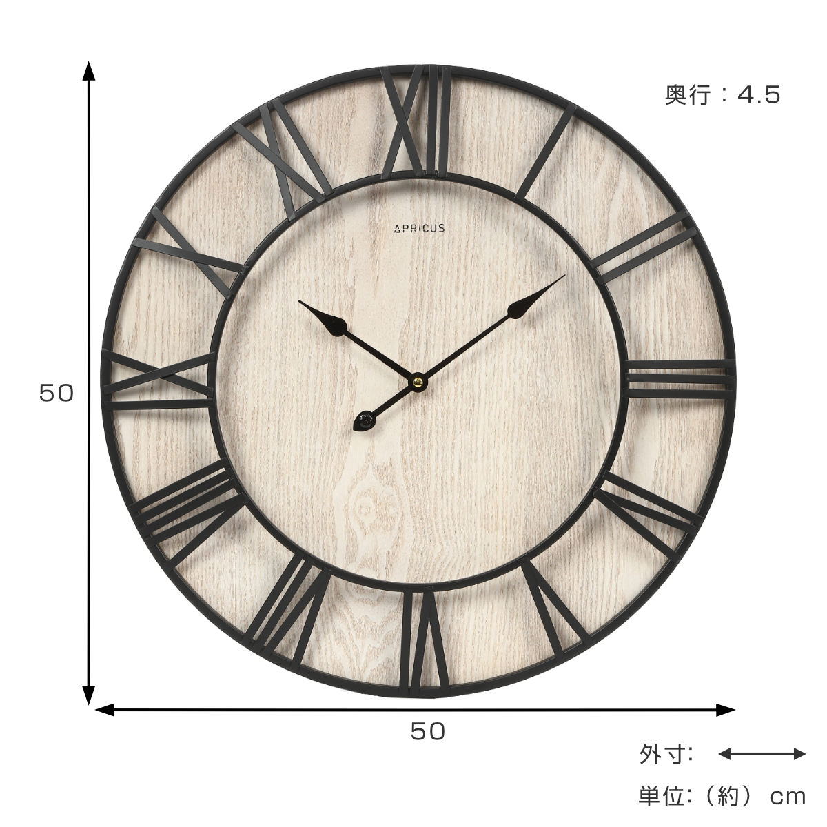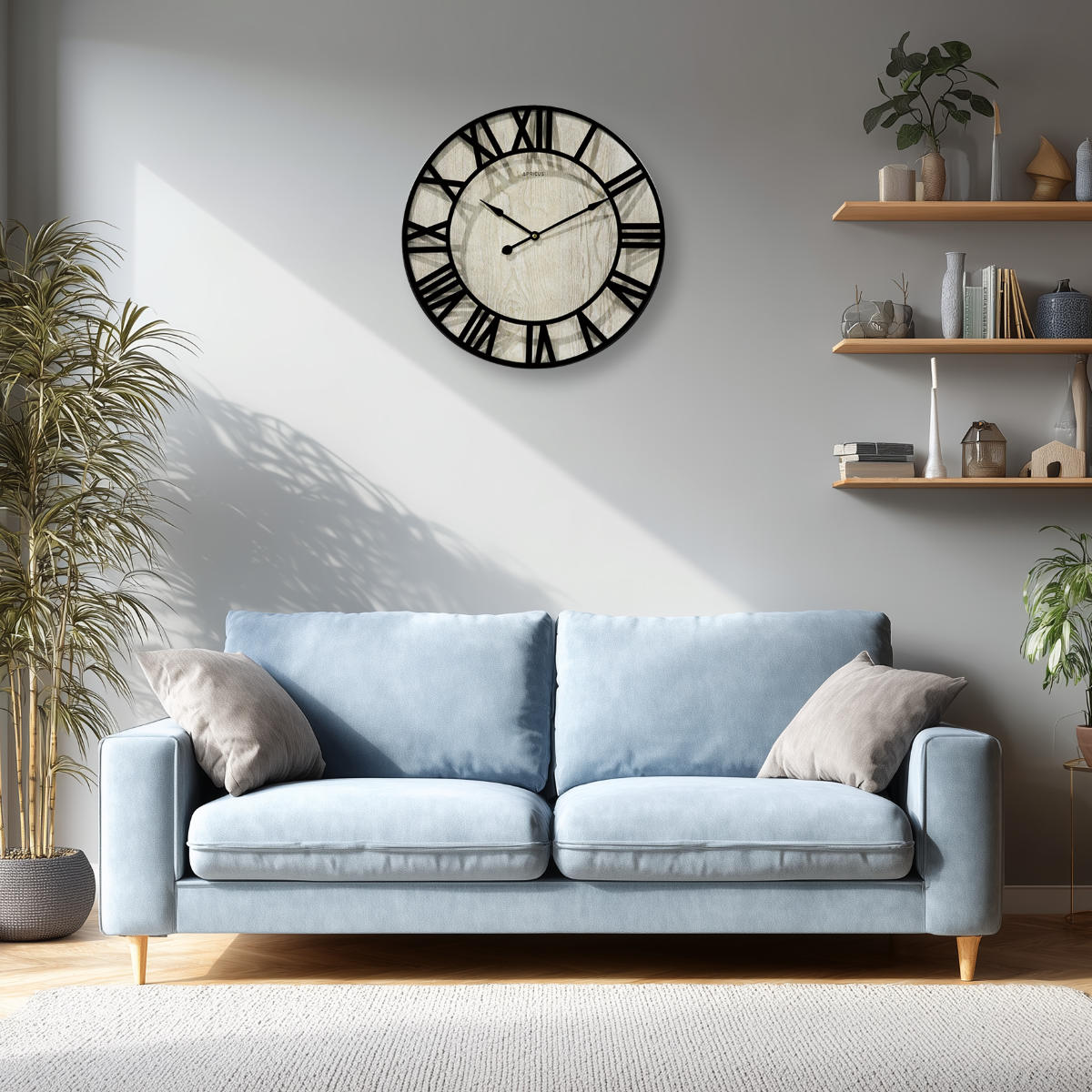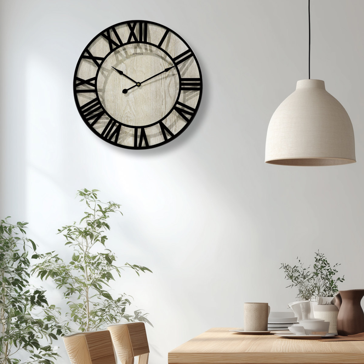 木目調の文字盤にローマ数字を組み合わせた、クラシックな雰囲気の掛け時計です。外周に配された数字がデザインのアクセントとなり、落ち着きのある中にも存在感があり、壁面を上品に演出します。
