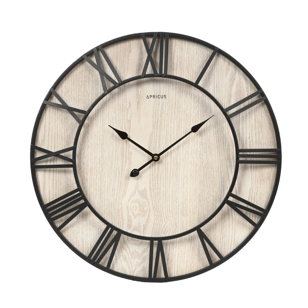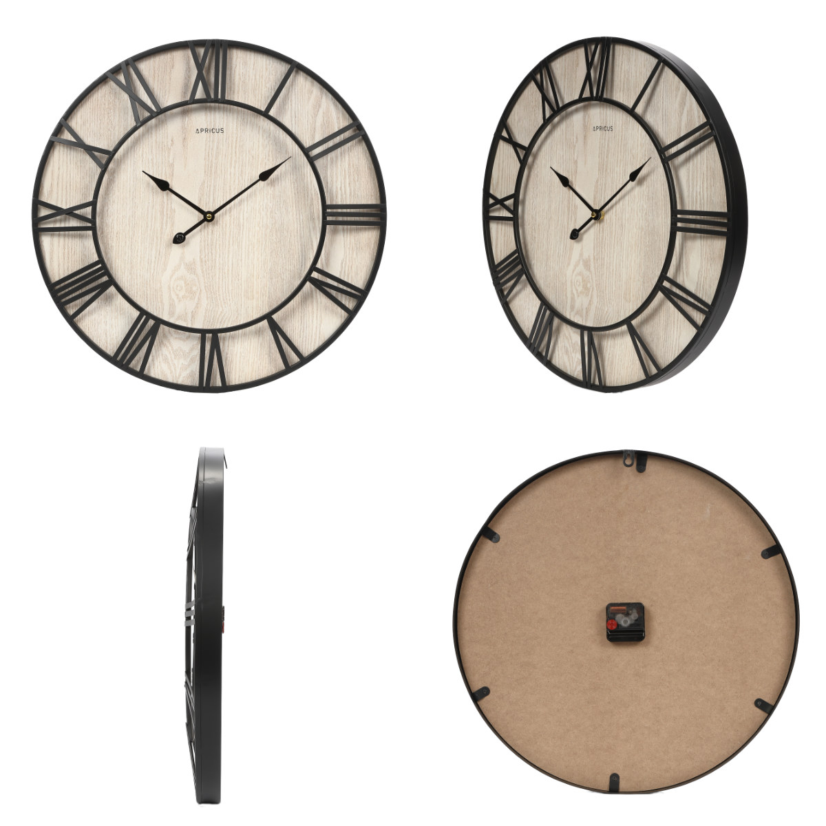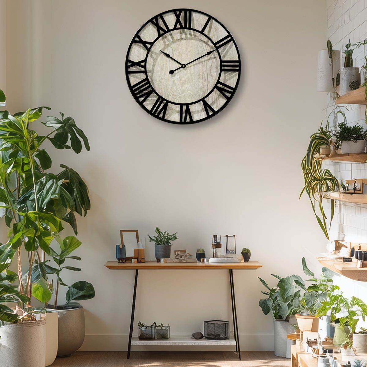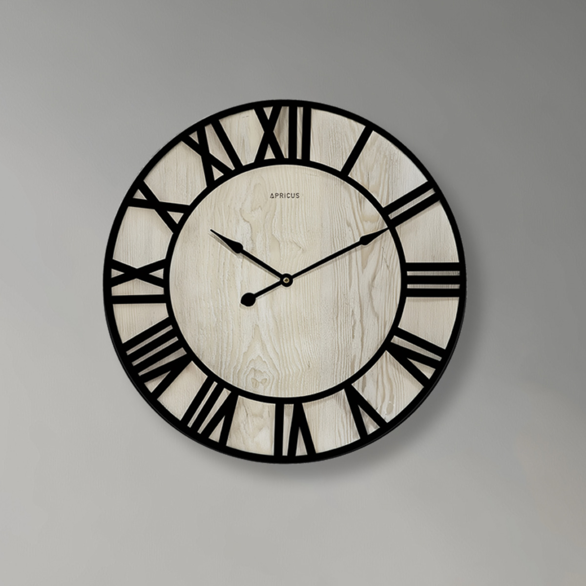 木目調の文字盤にローマ数字を組み合わせた、クラシックな雰囲気の掛け時計です。外周に配された数字がデザインのアクセントとなり、落ち着きのある中にも存在感があり、壁面を上品に演出します。