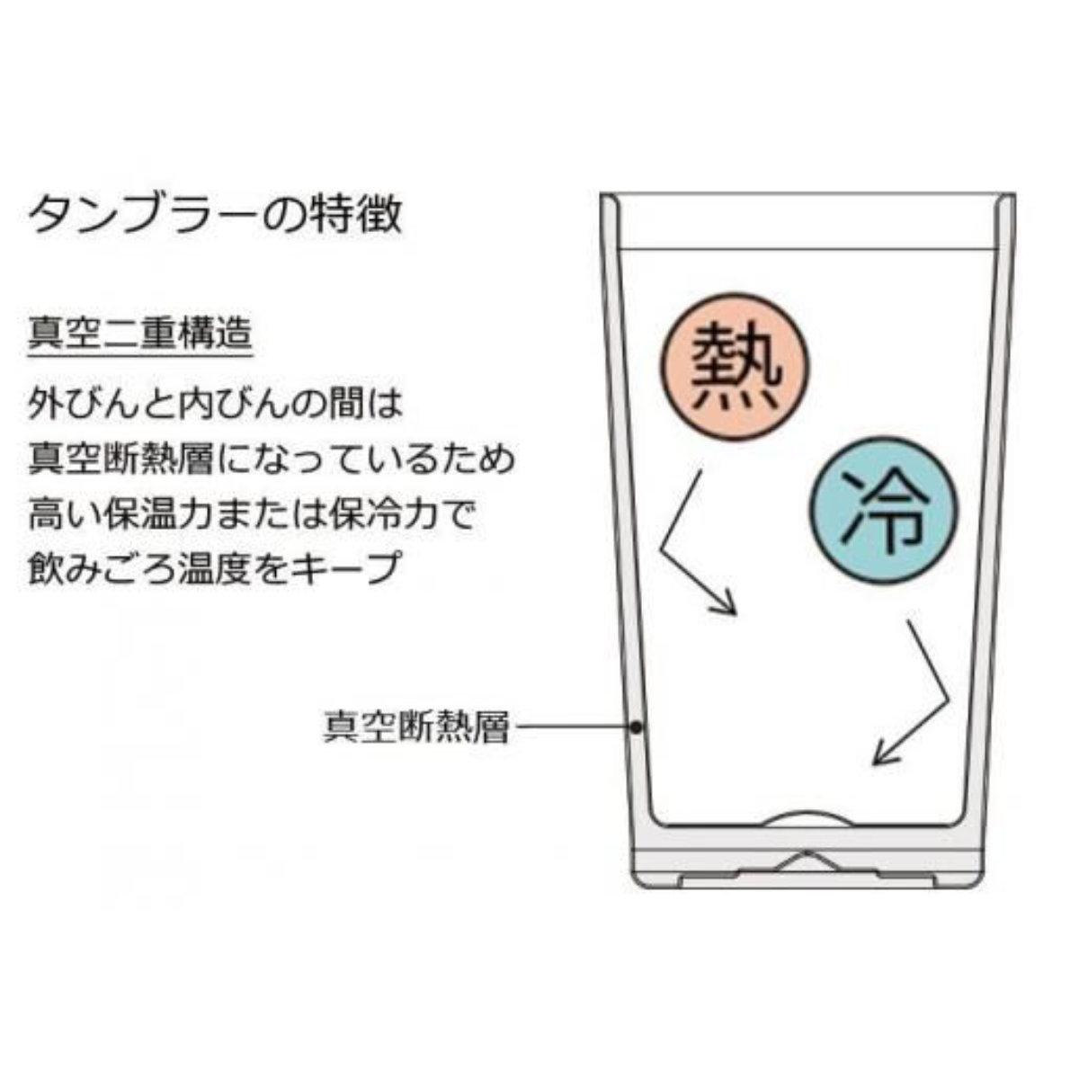 ●真空ステンレス構造で冷たい飲み物は冷たく温かい飲み物は温かくキープします。