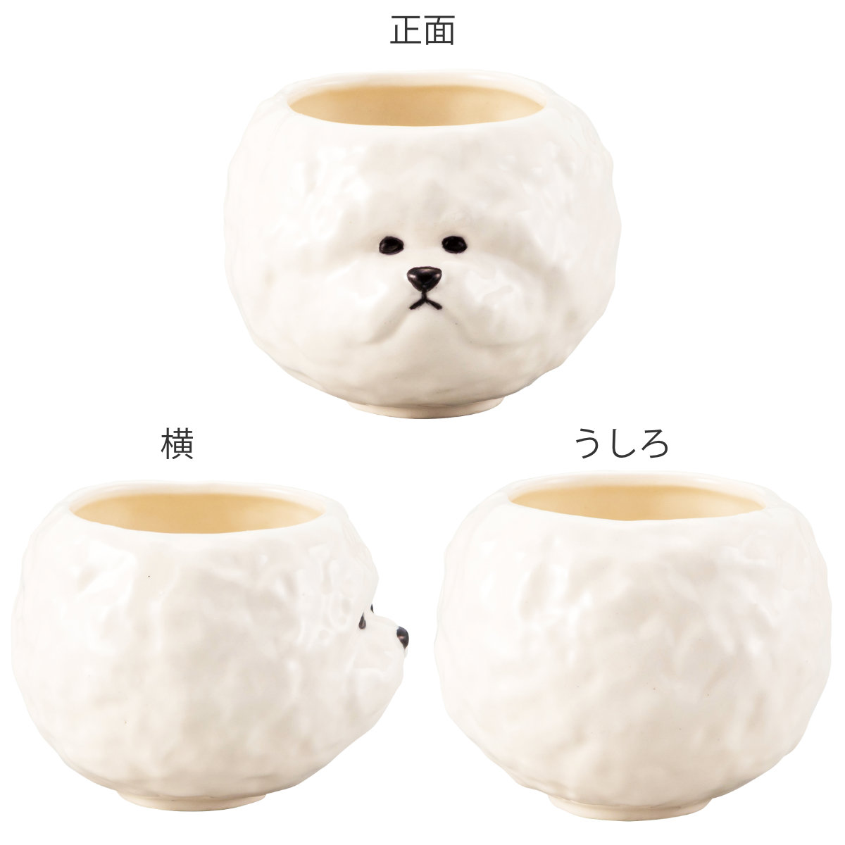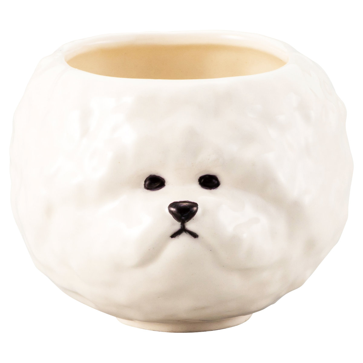 ビションフリーゼの愛らしい表情をそのまま形にしたお茶椀です。ご飯をよそえば、頭の部分がふんわりこんもりと盛り上がり、まるでビションフリーゼのふわふわの毛並みに。テーブルに置くだけで可愛さ満点、毎日の食事が楽しくなります。