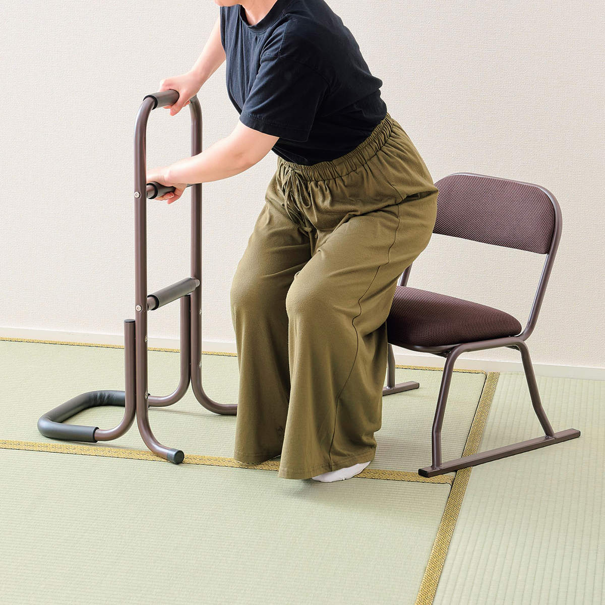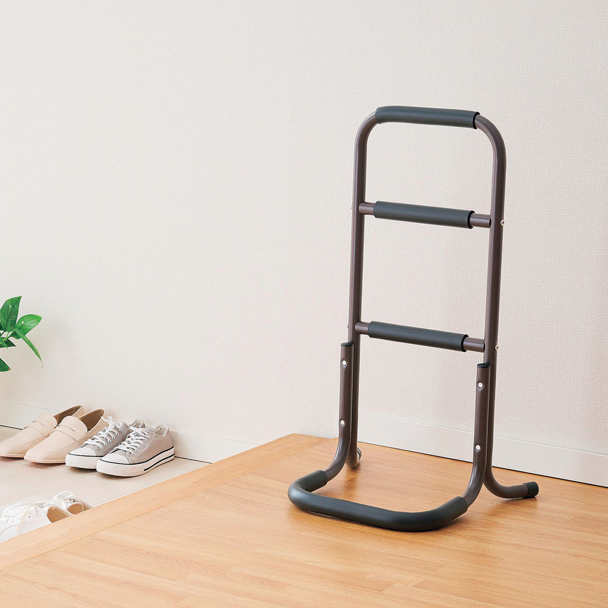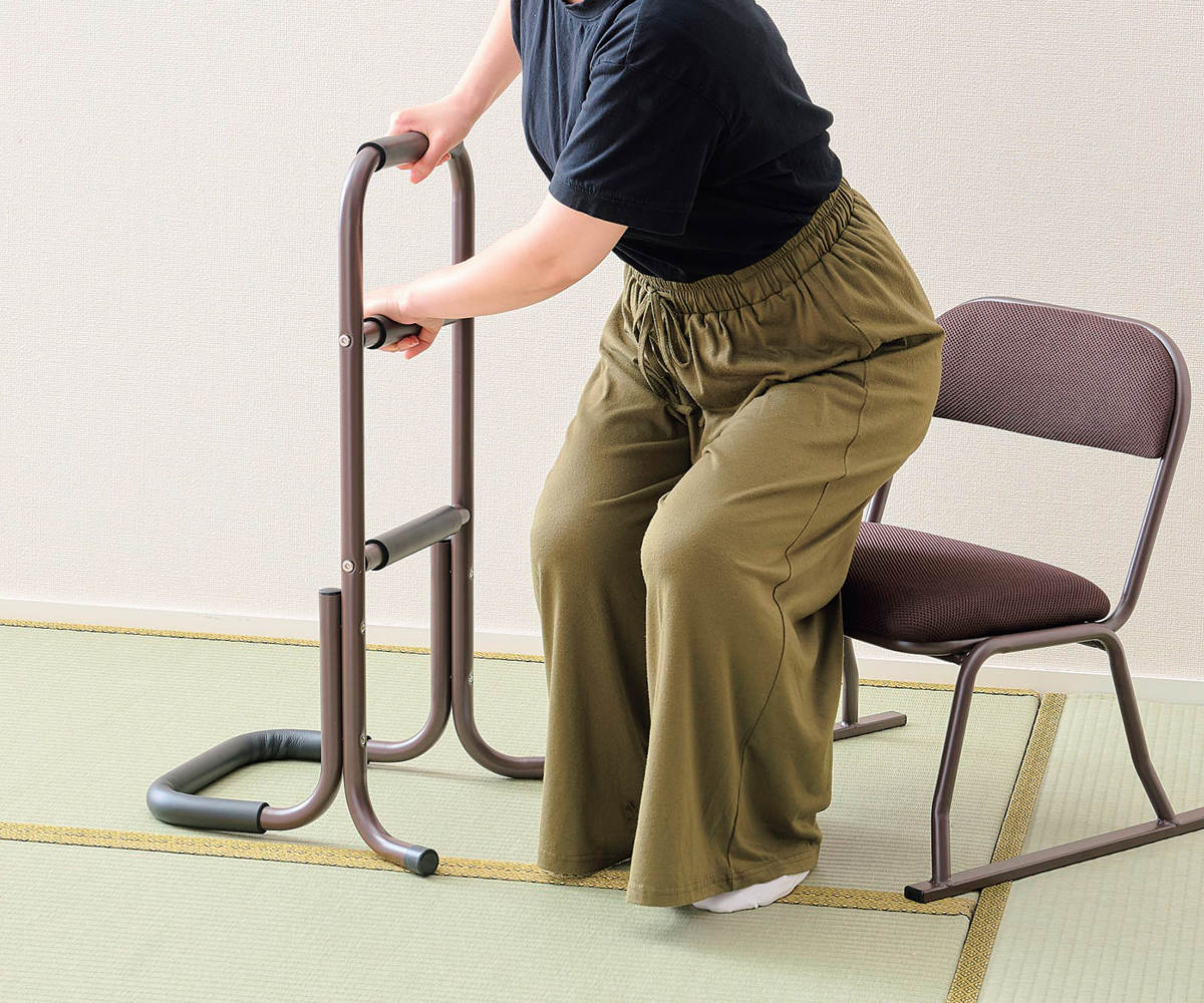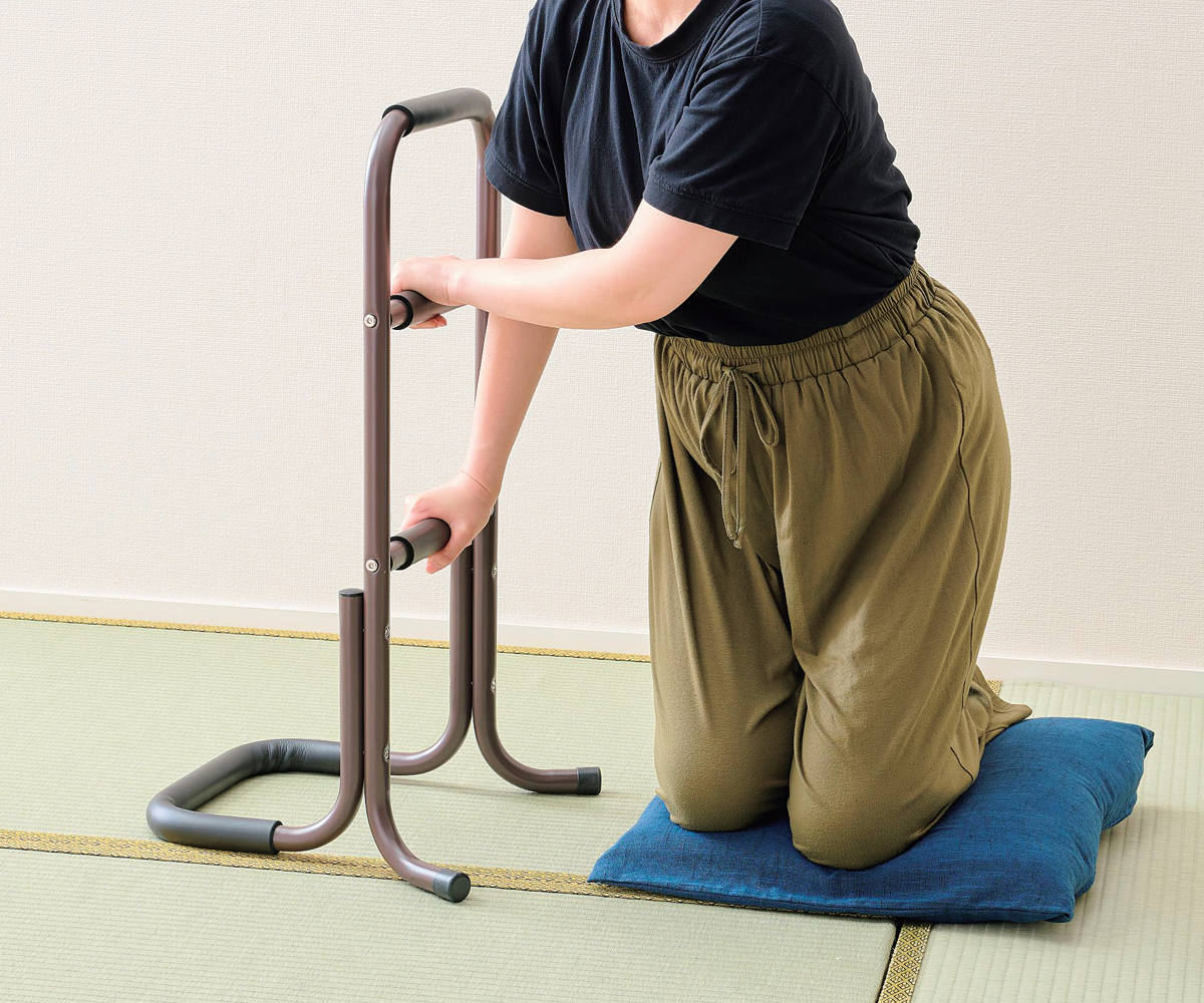 握りやすく滑りにくいグリップで立ち上がりをサポートします。掴むところが3箇所あるので、座椅子からの立ち上がりも、床に座った姿勢・横になった姿勢など低い位置からの立ち上がりも楽に行えます。