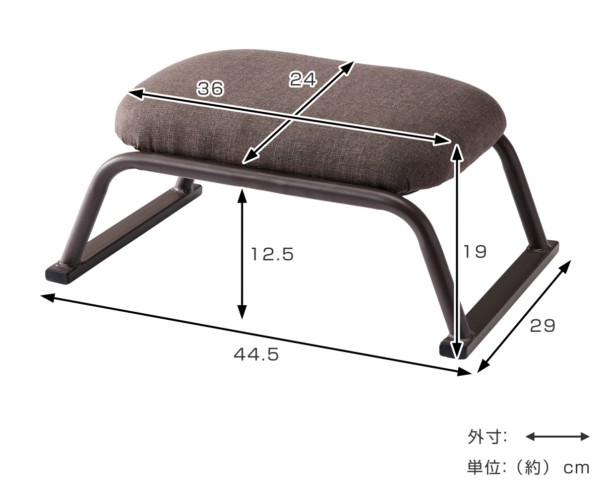 | サイズ | 約 幅44.5×奥行29×高さ19(cm) 床面~座面下まで:約 12.5cm 座面クッション厚:約 4cm 座面サイズ:約 幅36×奥行24(cm) |