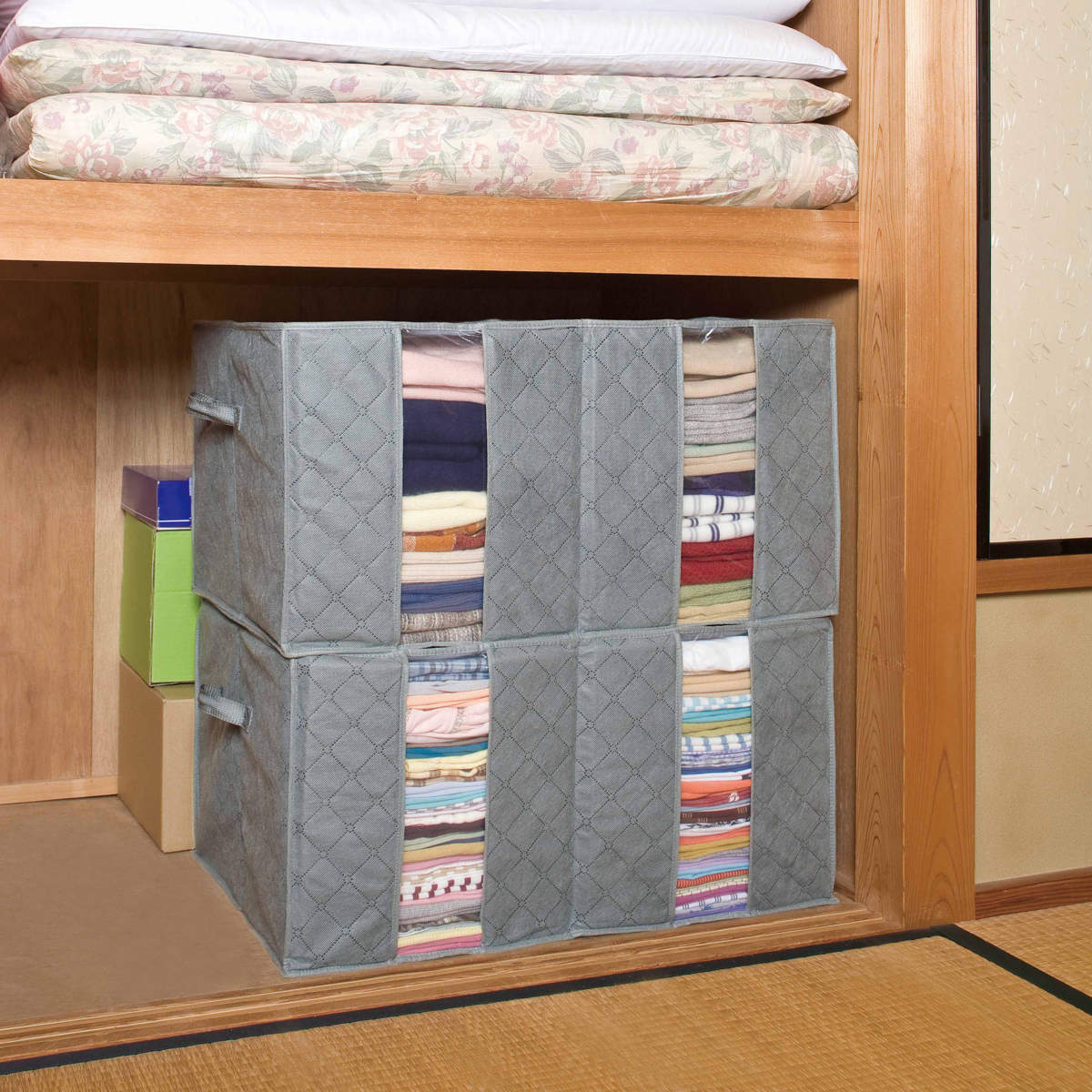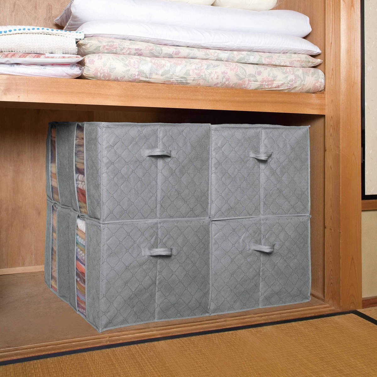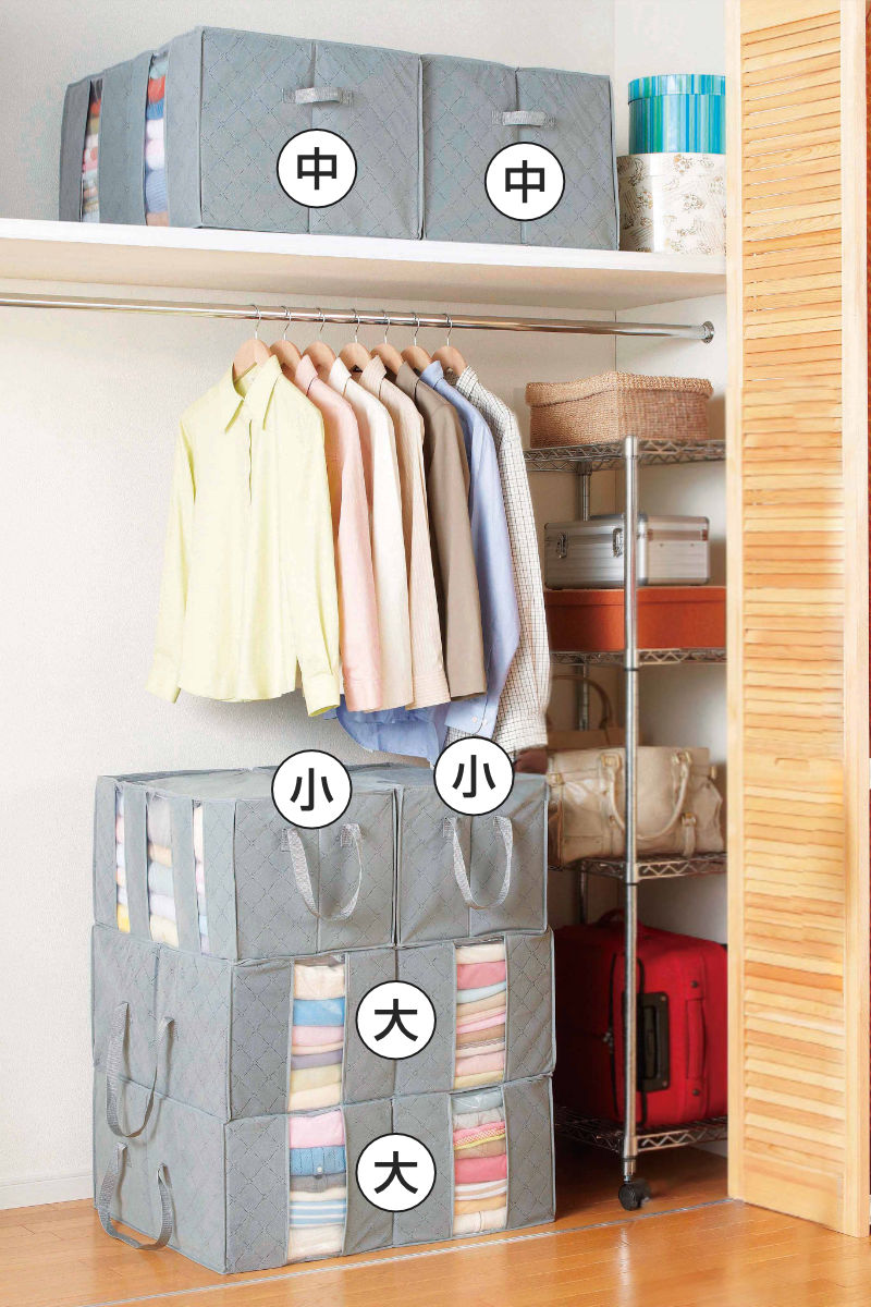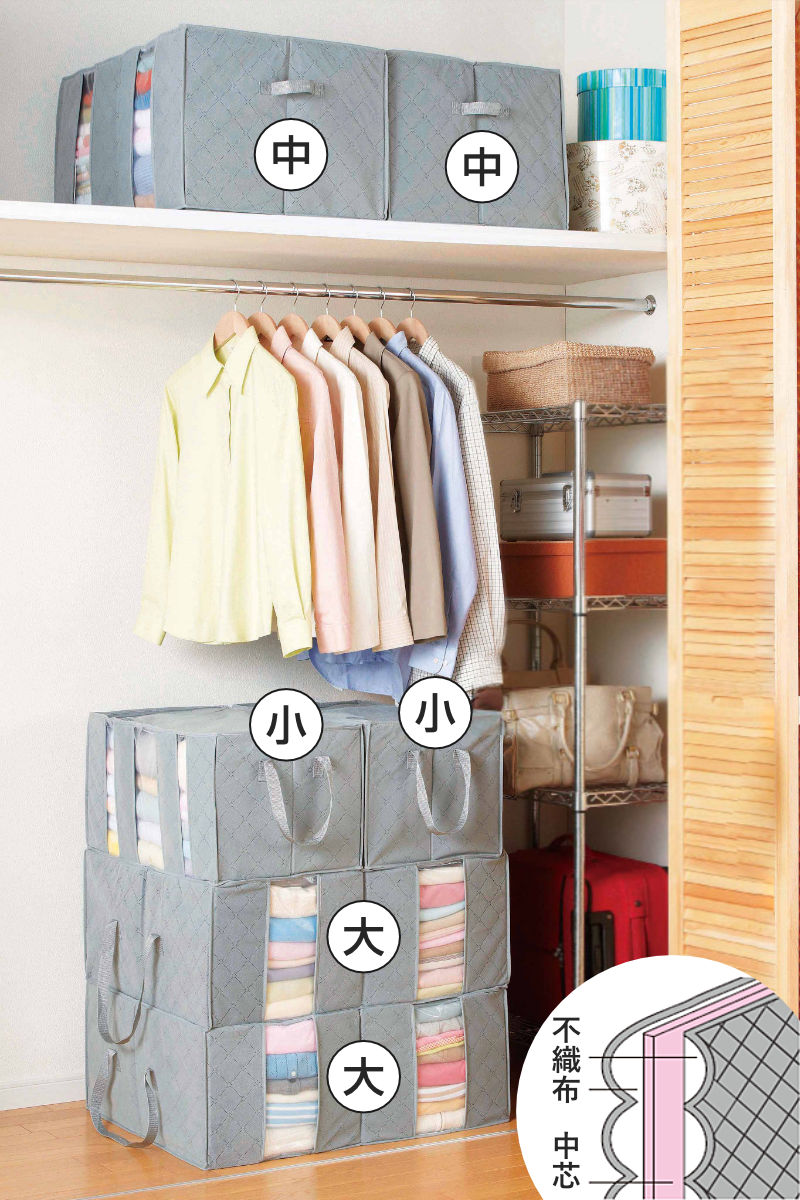 外側の不織布に中芯を挟んだ3層構造を採用。しっかりとしたつくりで、積み重ねて収納することができます。大・中・小の3種類の積み重ねも可能なので、クローゼットや押入れの空間を無駄なく活用できます。