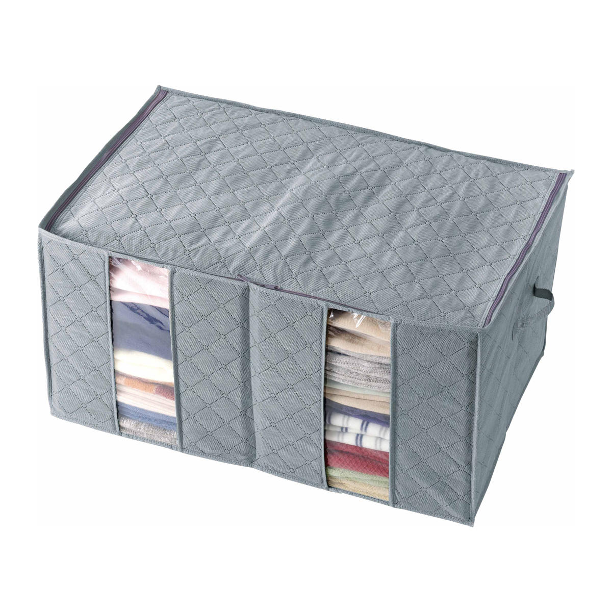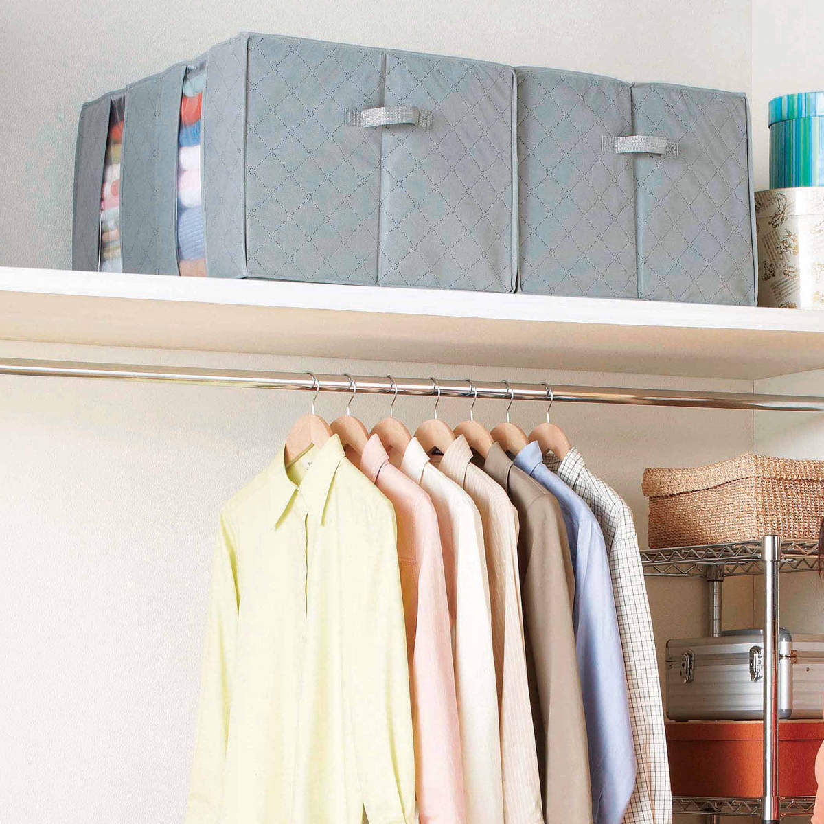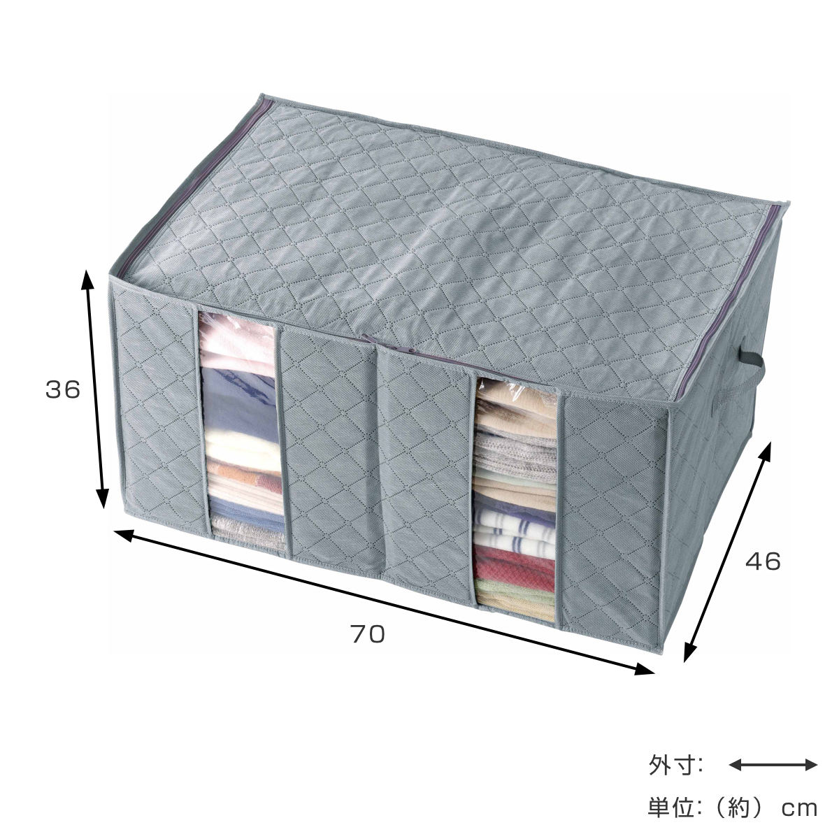 ファスナーでしっかり閉まる大きなフタで、収納物をホコリから守ります。衣類以外にもバッグなどの収納にも最適です。