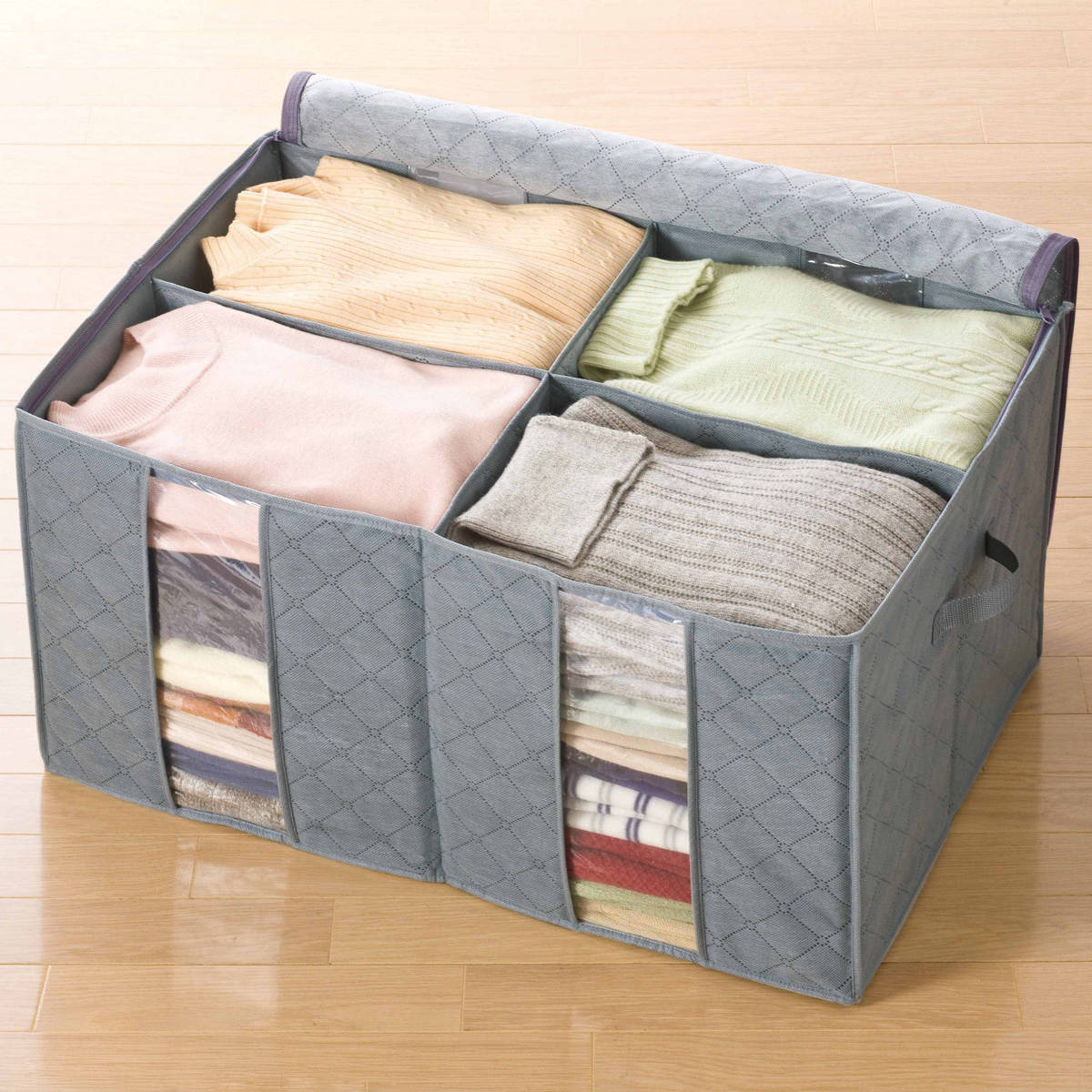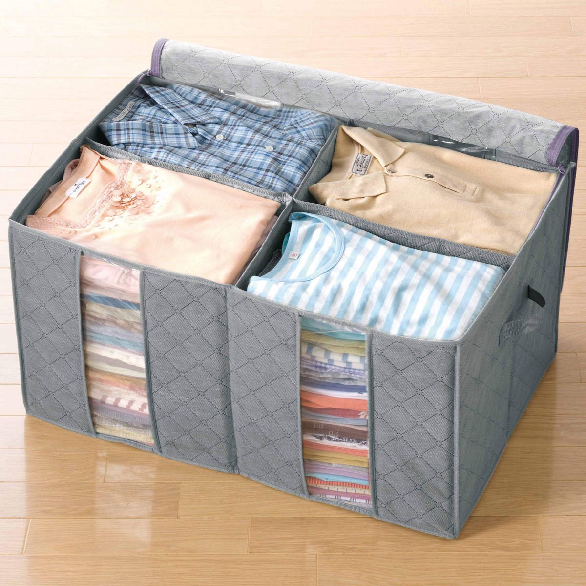 色々な衣類をすっきり収納できる、間仕切り付きの衣類整理袋です。収納物が倒れにくく、種類ごとに分けて整理できるため、衣替えや日常収納に便利です。