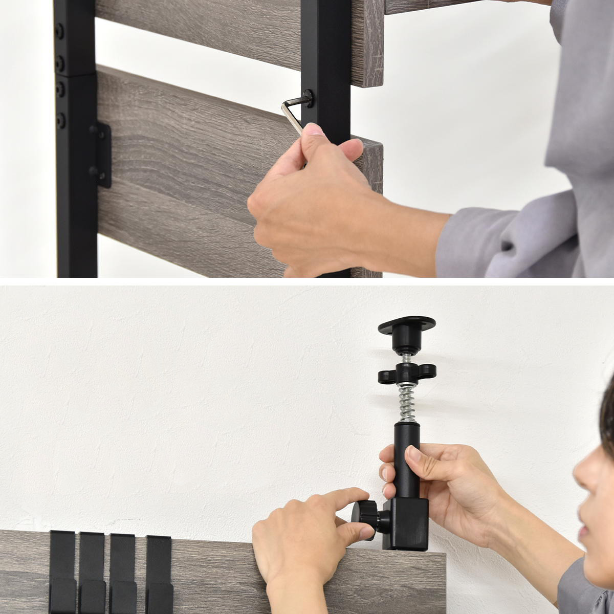 付属の工具でボルトを留めるだけで完成する簡単組み立て。設置もネジを回して突っ張り棒を調節するだけ。