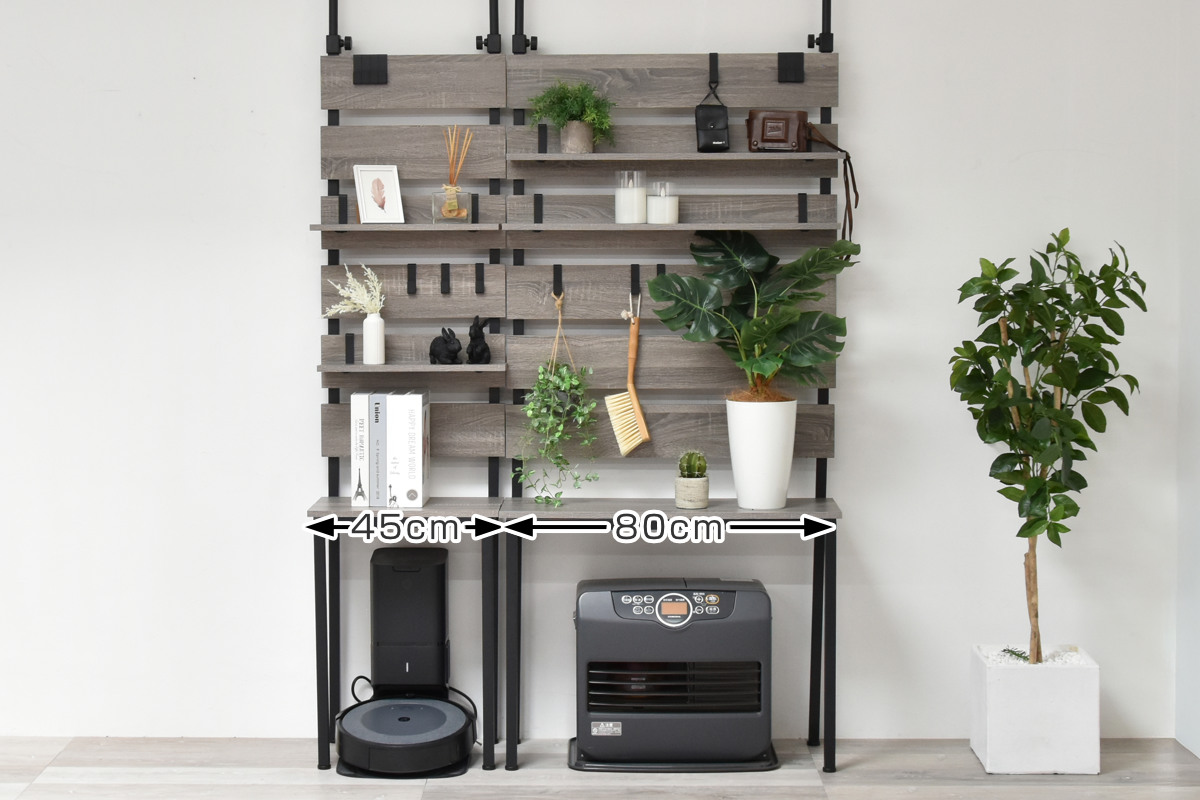 お掃除ロボやヒーターなどの上は、物が置けずデッドスペースになりがちです。そんなスペースを有効活用して、おしゃれに壁面収納が可能になるラックです。本や小物、グリーンなどをバランスよく配置でき、見せる収納としても活躍します。