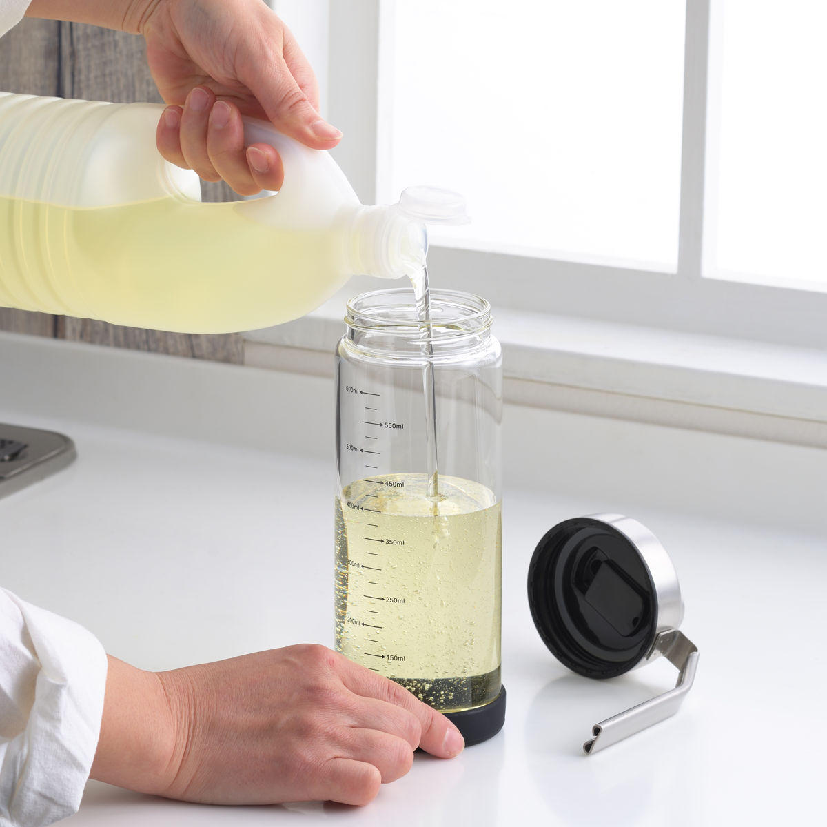 口部が広く、ガラス製で中身が見えるため、油の残量を確認しながらスムーズに詰め替えできます。