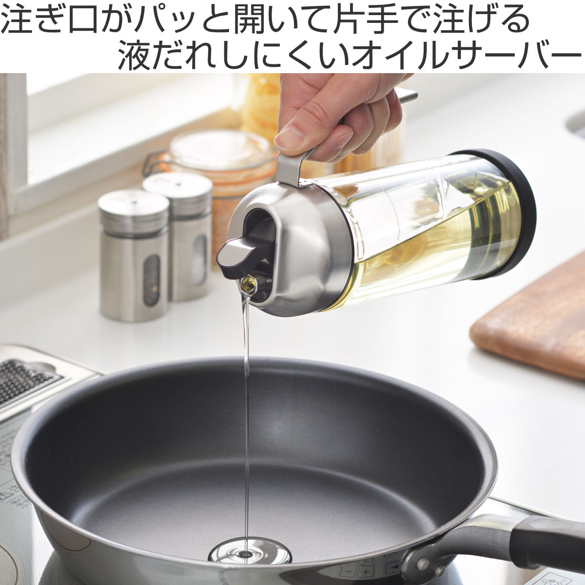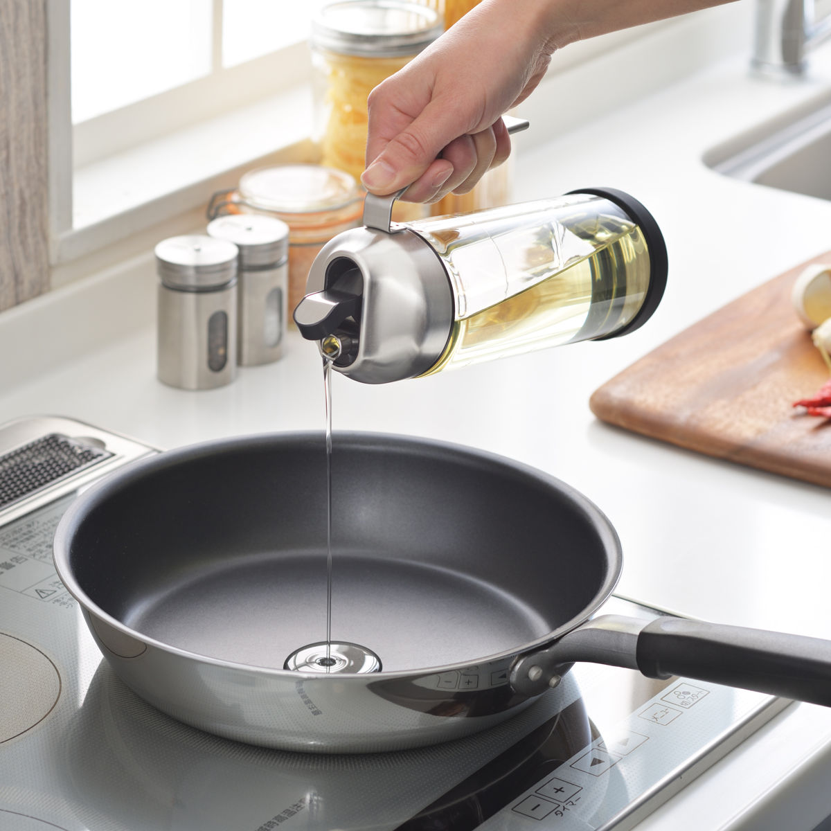 ハンドルを握って傾ければ、フタが自然に開いて注げます。調理中でも片手で油を注げるため、作業の流れを止めずに使えます。