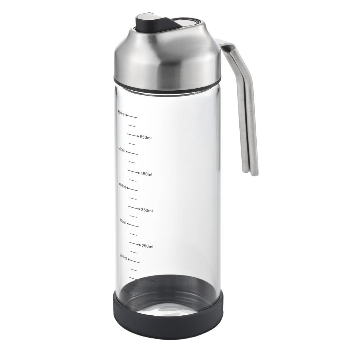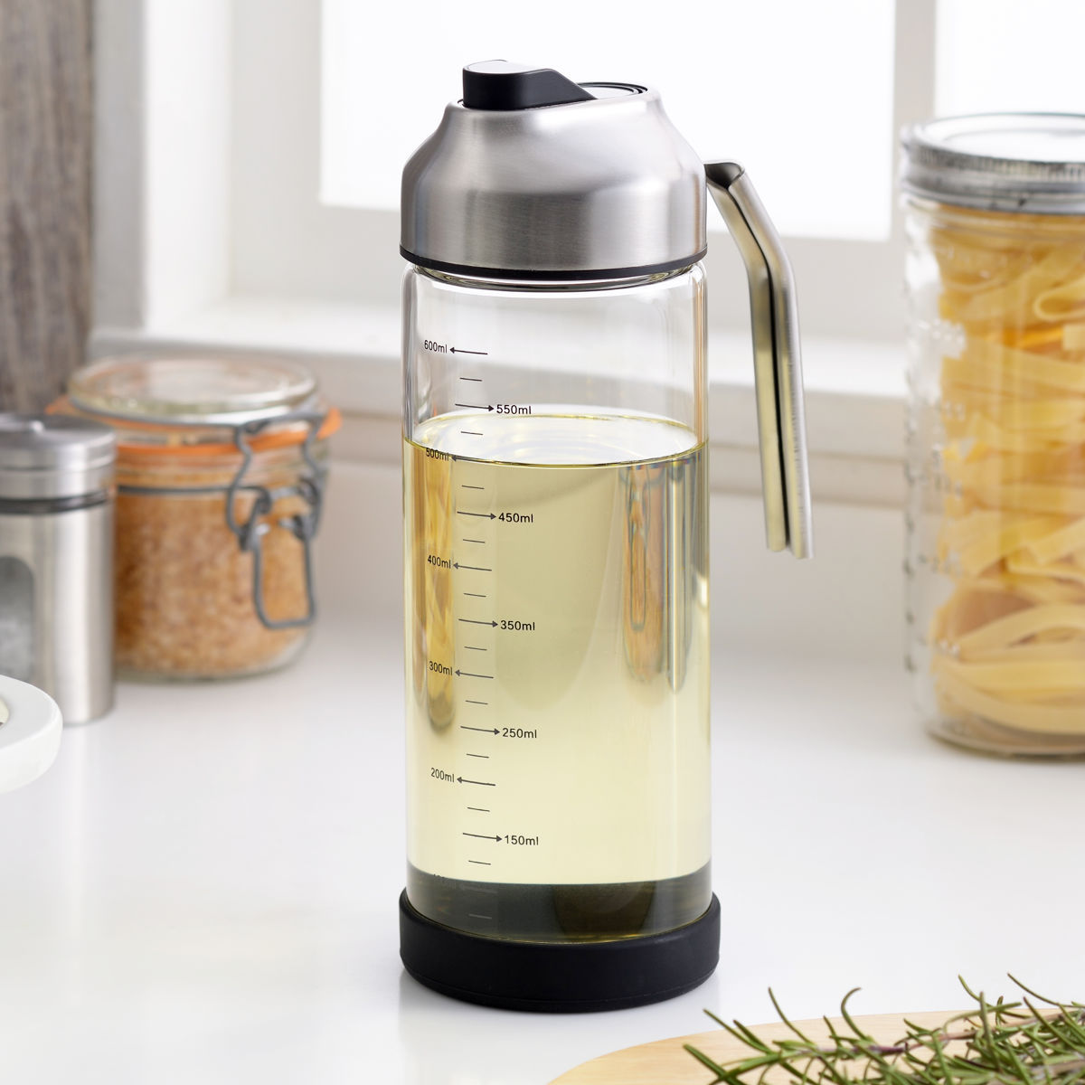 油の保存・注ぎが快適になる、耐熱ガラス製のオイルサーバーです。パッキン付きで液漏れにしにくく、キッチンが汚れるのを防ぎます。滑り止めが付いているため倒れにくく、安定感があり安心です。シンプルなデザインなので、卓上でも使えます。