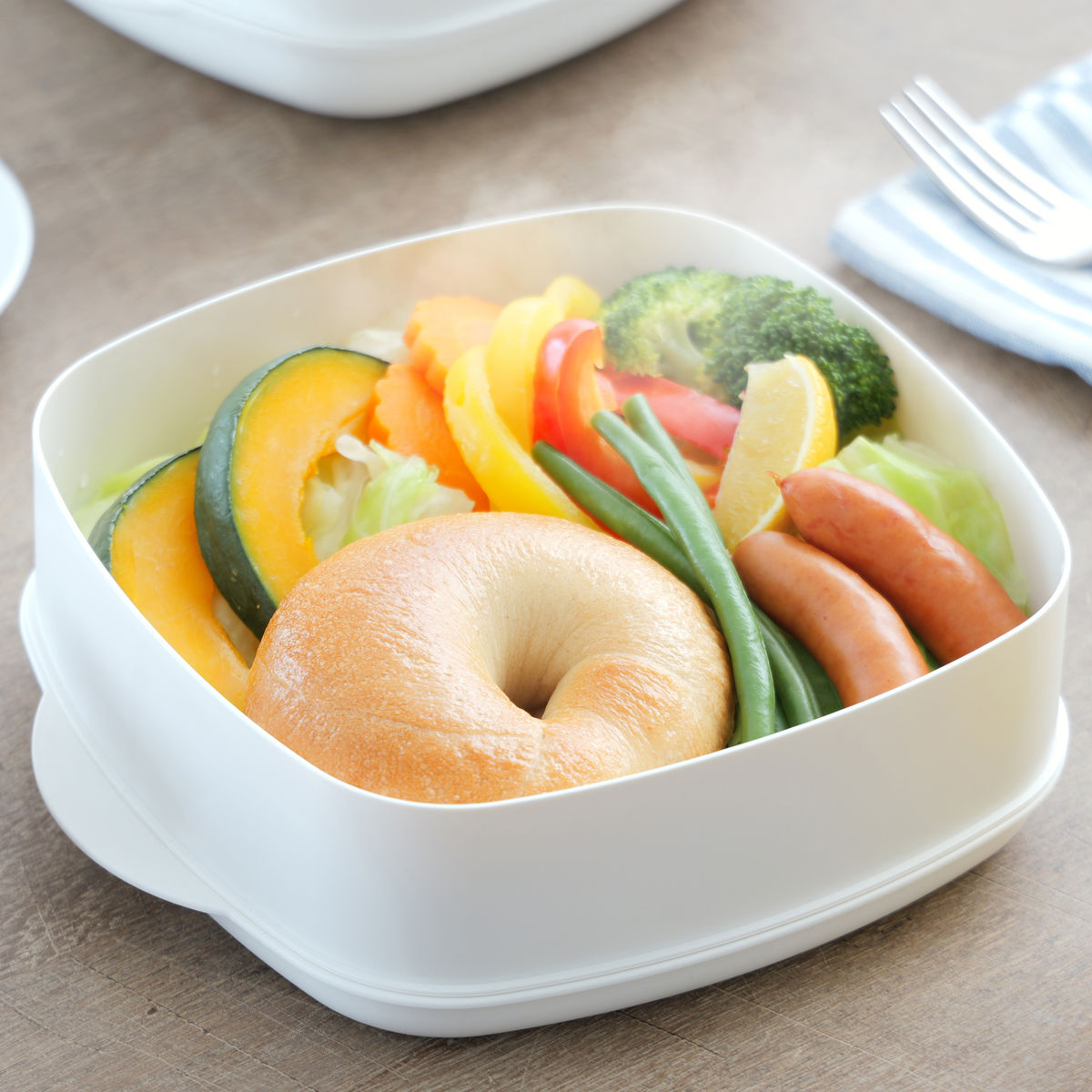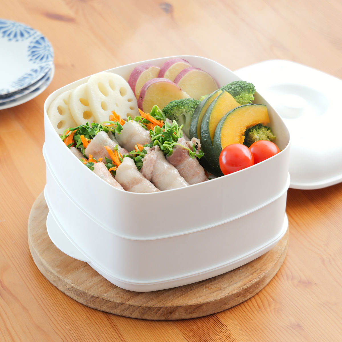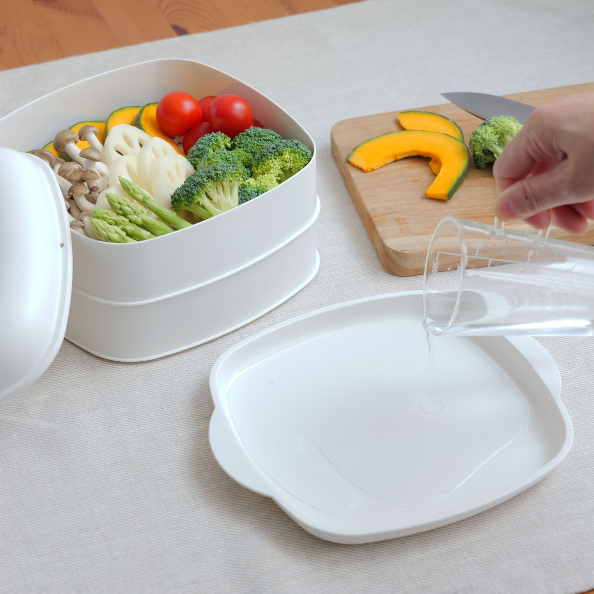 セイロをザルとして使えるため、野菜を洗ってそのまま電子レンジで加熱するだけで、簡単に蒸し野菜が作れます。