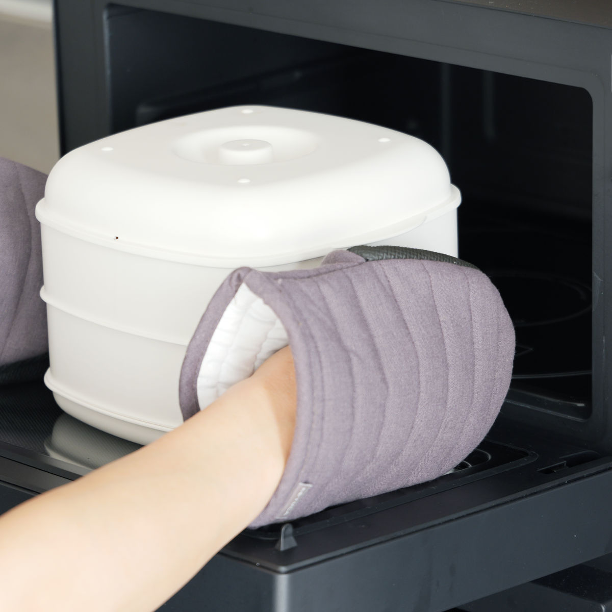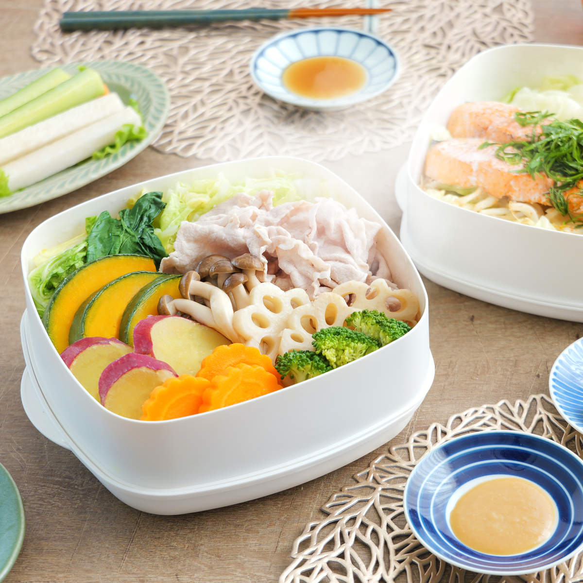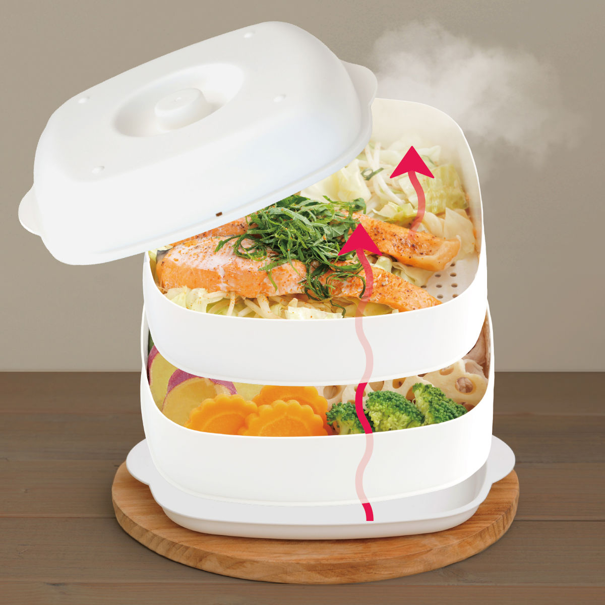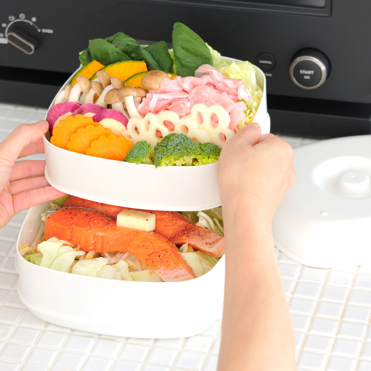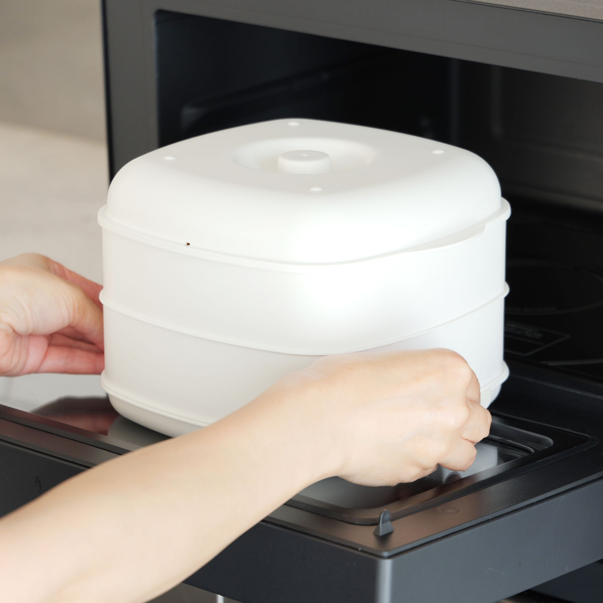 電子レンジで手軽に蒸し料理が作れる調理器です。ファミリー向け大容量サイズで、ワンプレート料理や肉まんなどの大きめ食材にも対応。レンジで温めるだけなので、他の調理と同時進行でき、忙しい毎日の調理を効率よくサポートします。