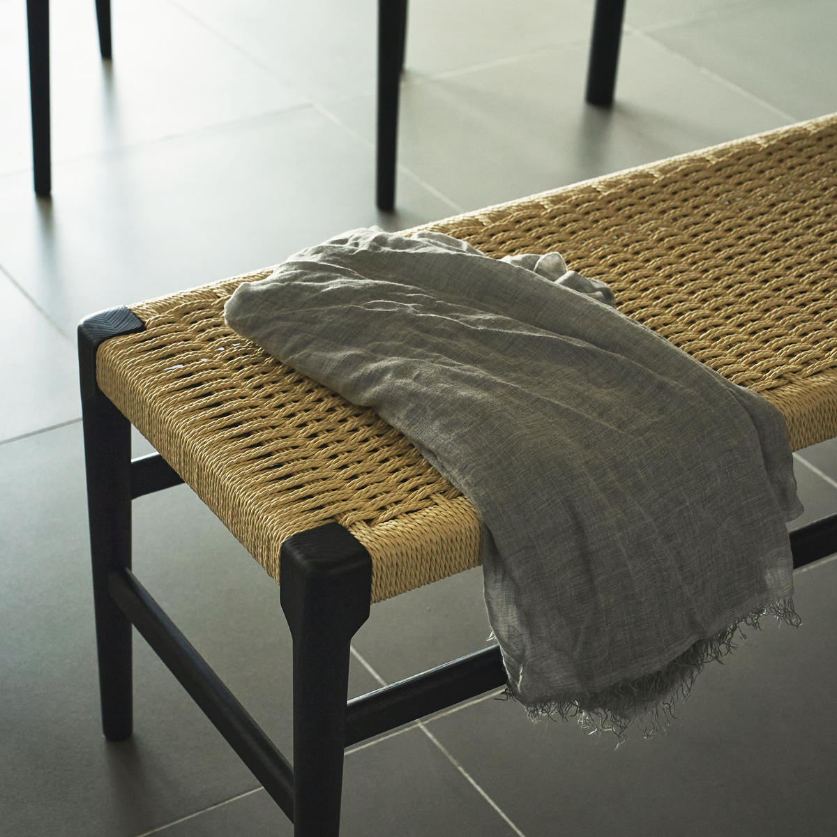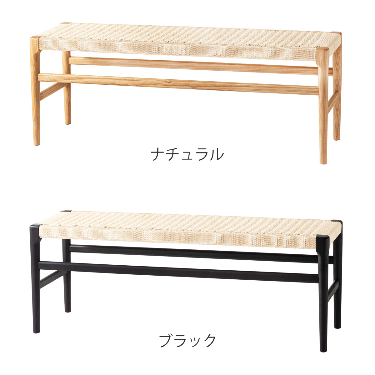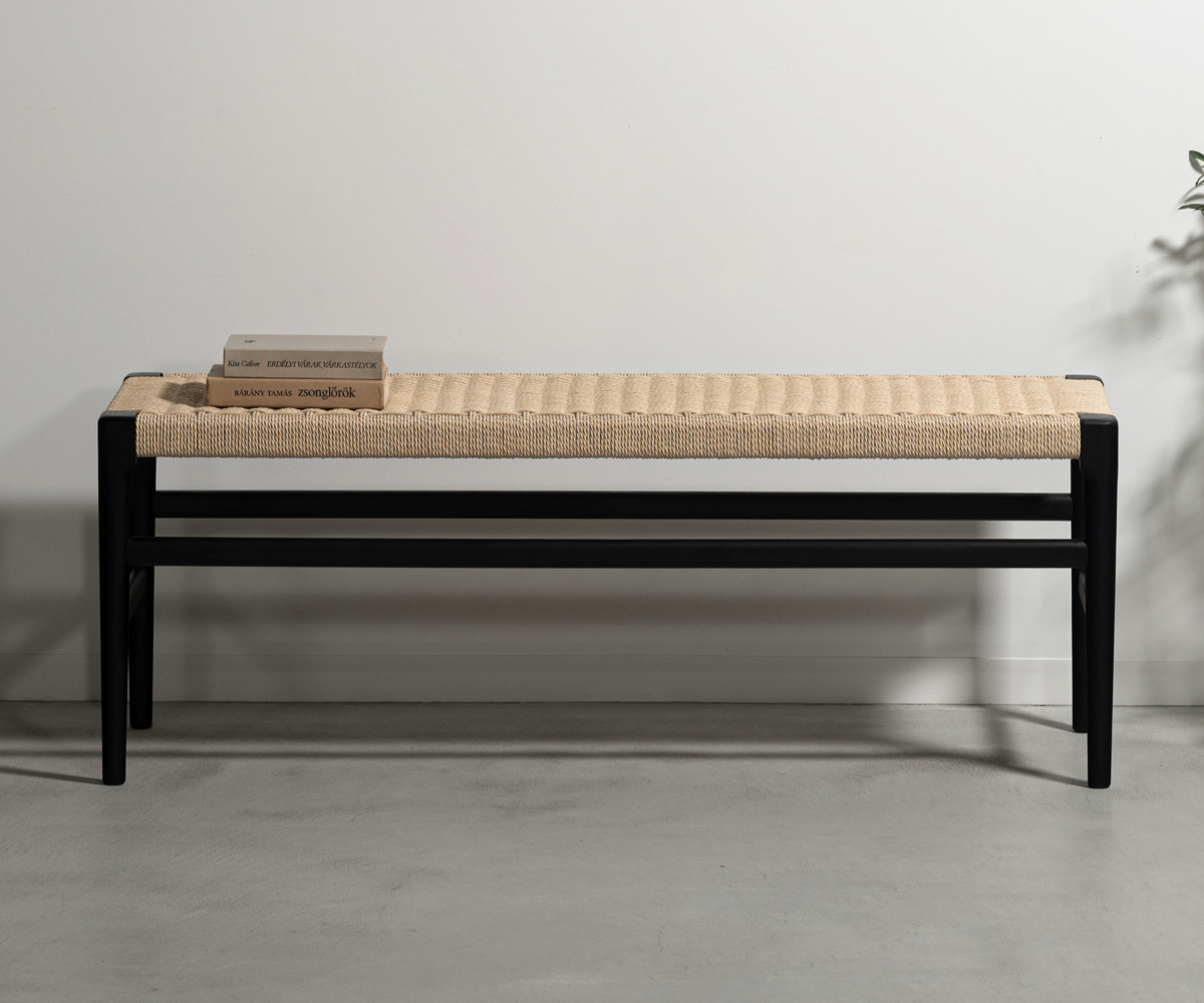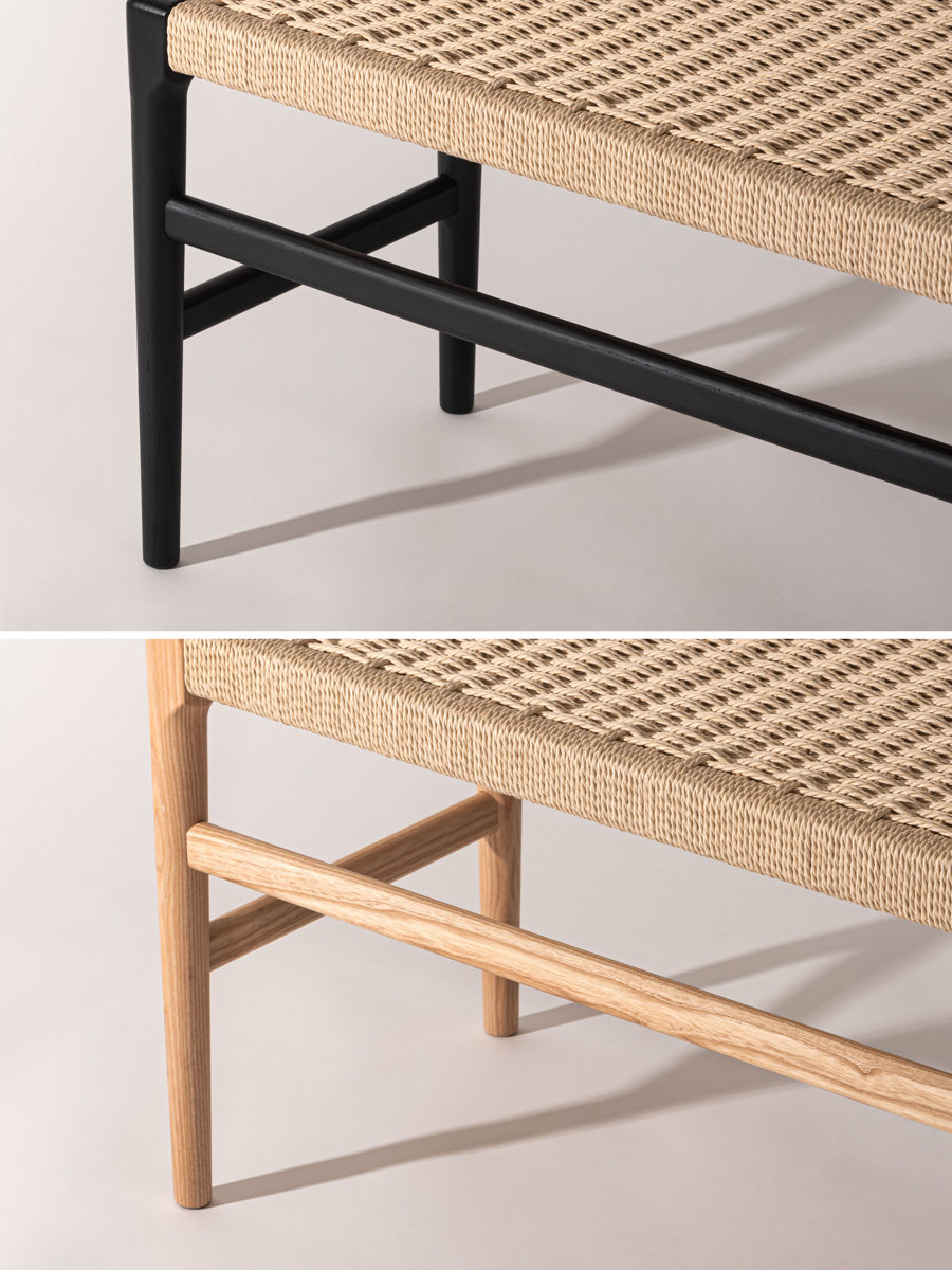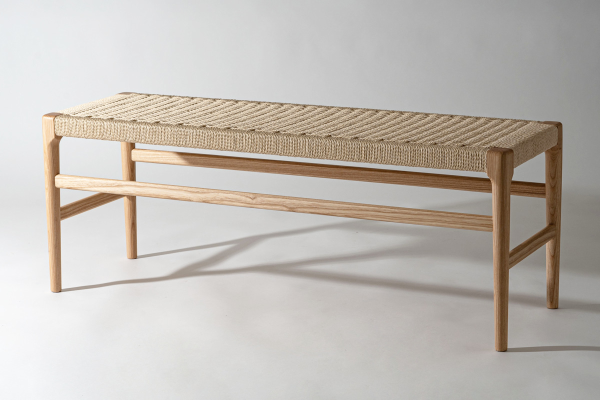 座面にぺーパーコードを使用したベンチです。ぺーパーコードは樹脂を含ませてねじった紙紐のことで、長く使うほどにお尻にフィットしてくる座り心地の良さが魅力です。革やファブリックとは一味違った、自然で軽やかな風合いをお楽しみいただけます。