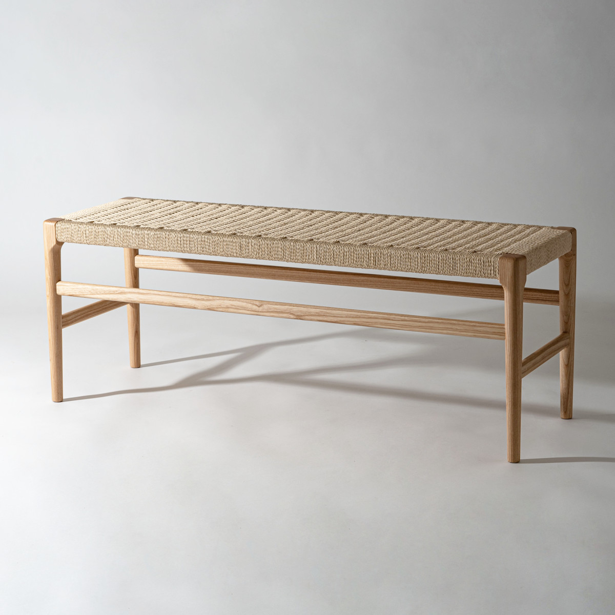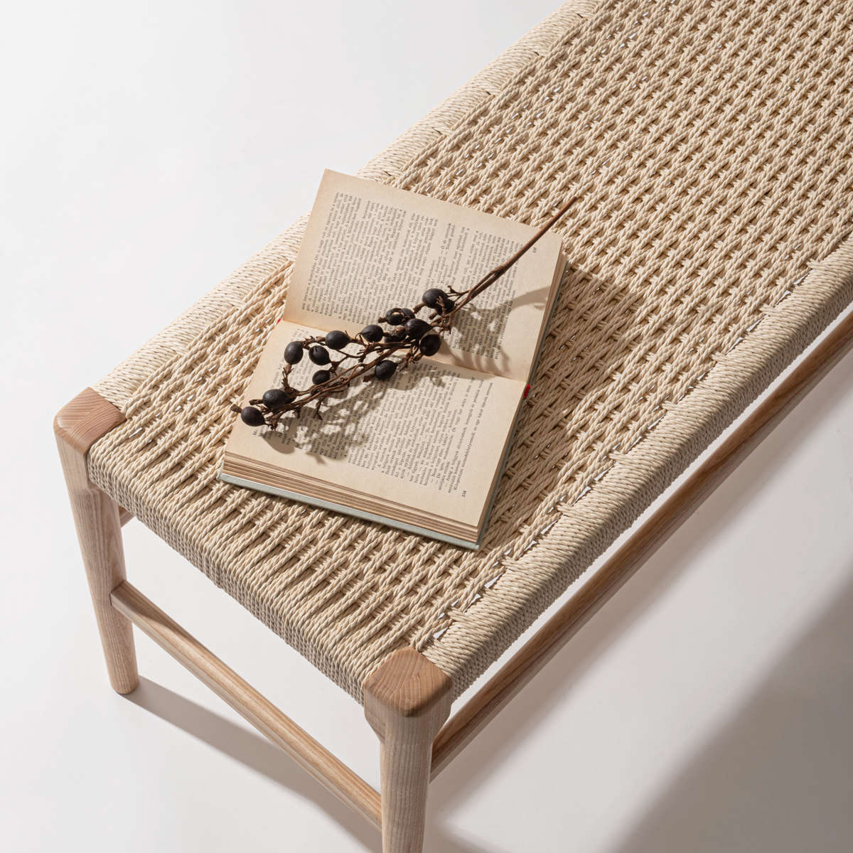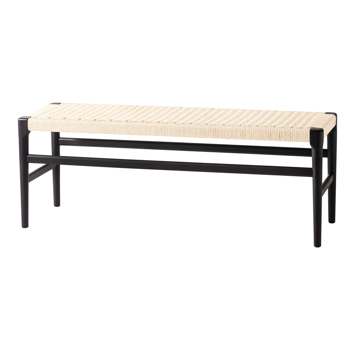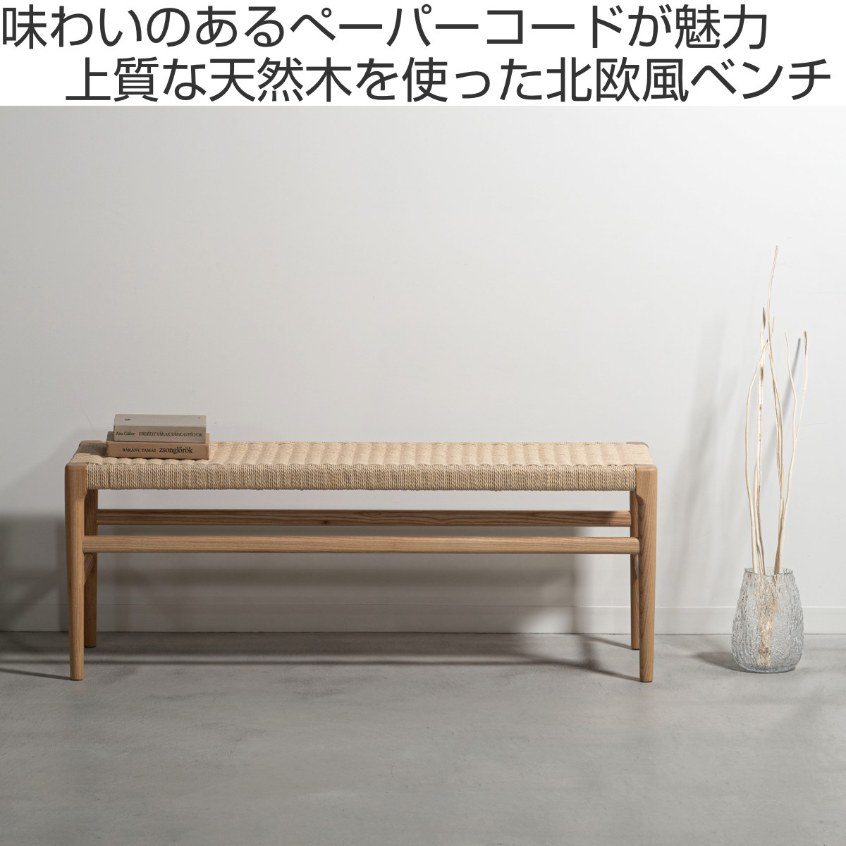 座面にぺーパーコードを使用したベンチです。ぺーパーコードは樹脂を含ませてねじった紙紐のことで、長く使うほどにお尻にフィットしてくる座り心地の良さが魅力です。革やファブリックとは一味違った、自然で軽やかな風合いをお楽しみいただけます。