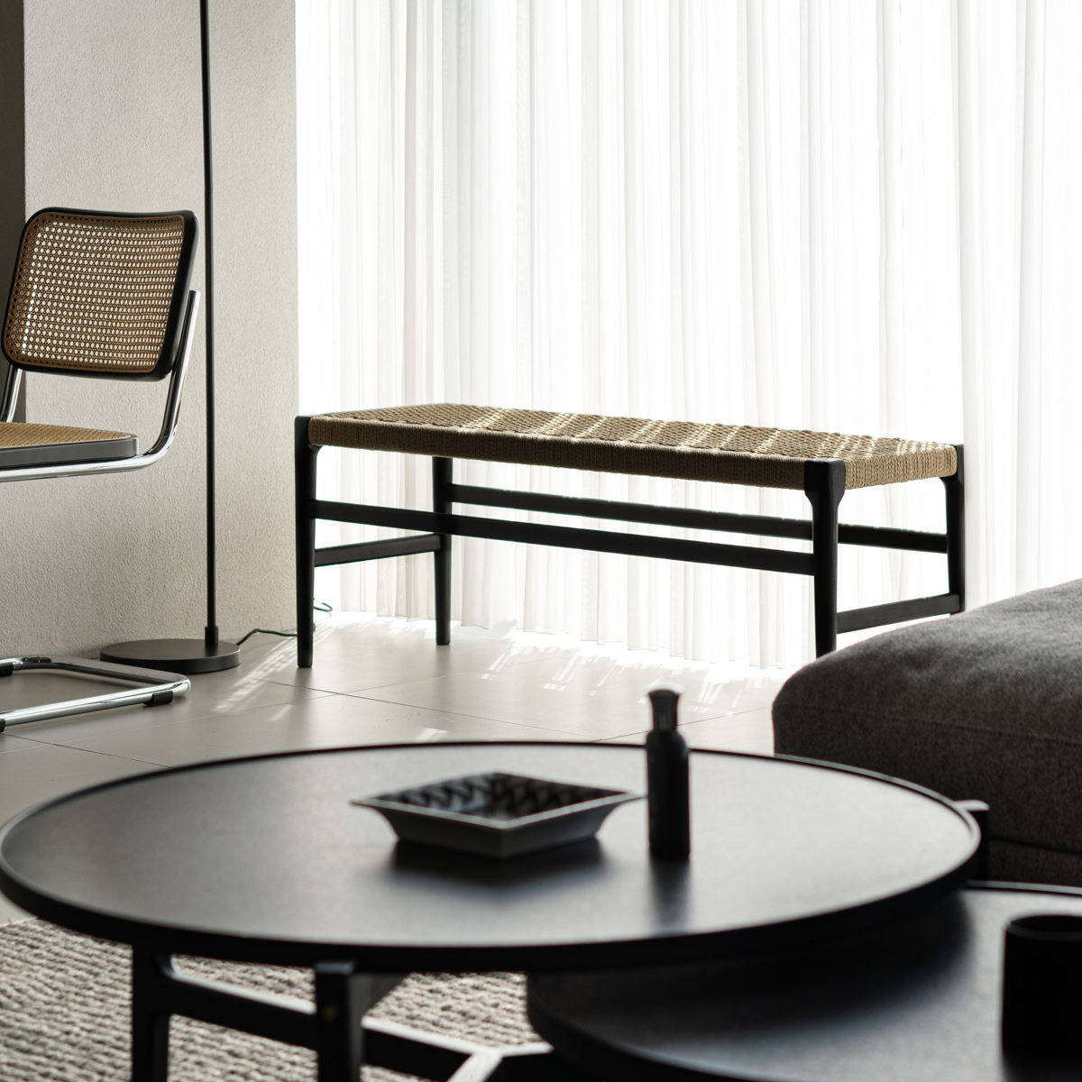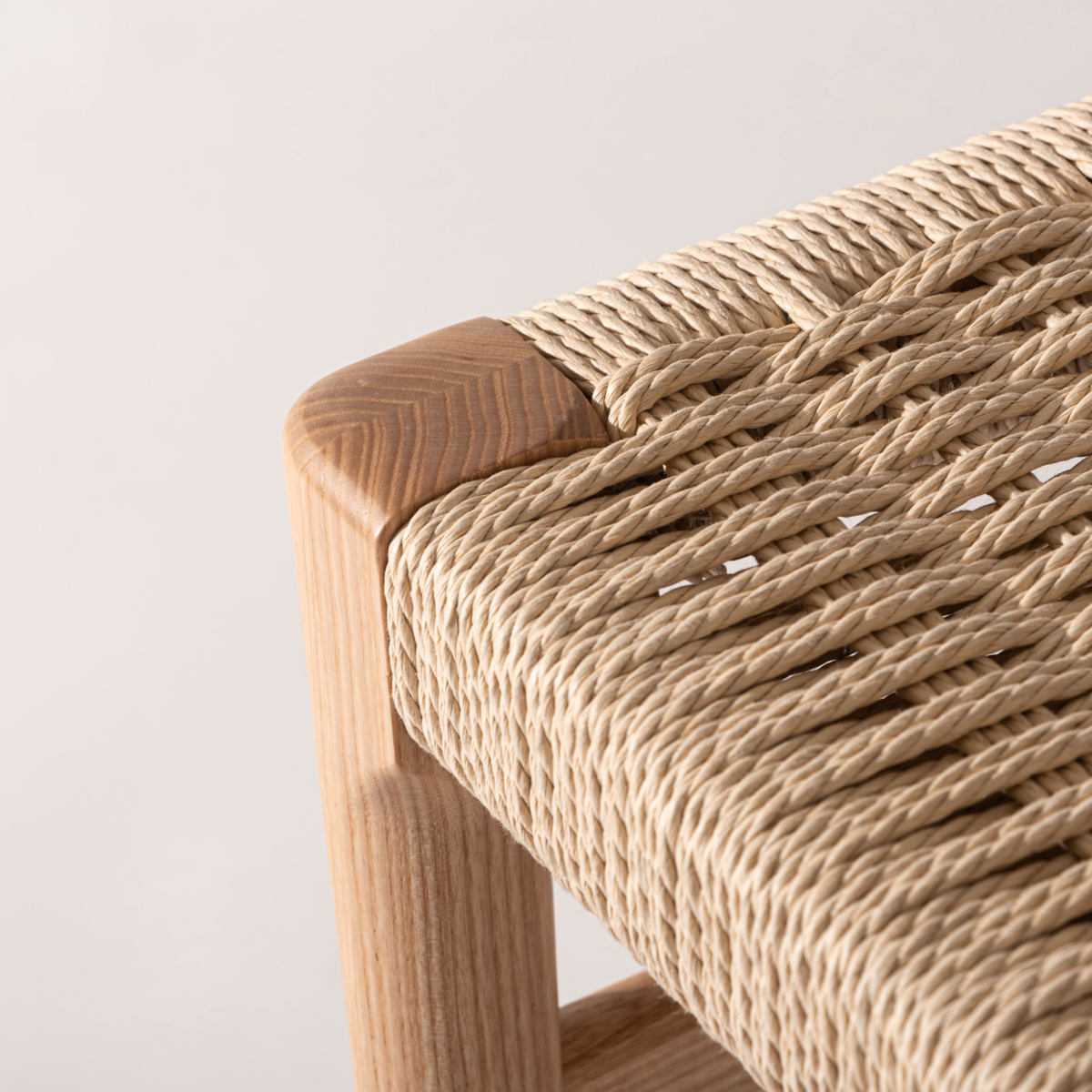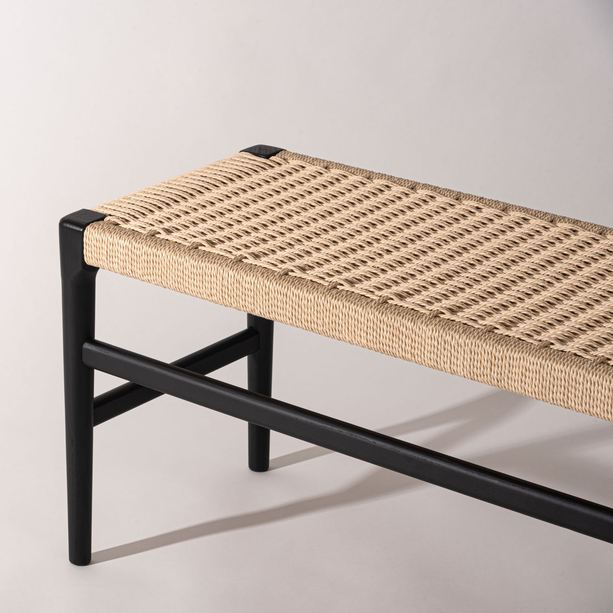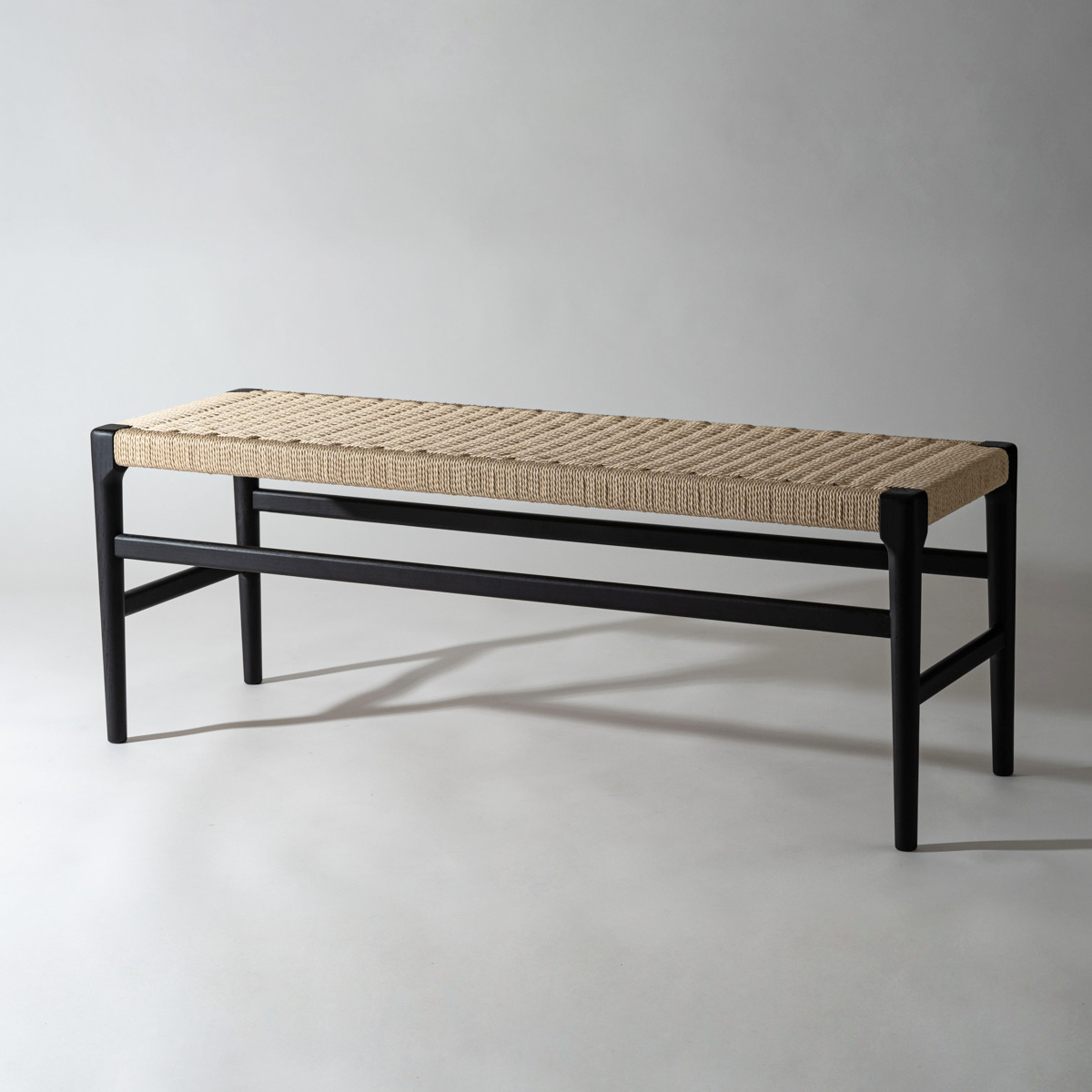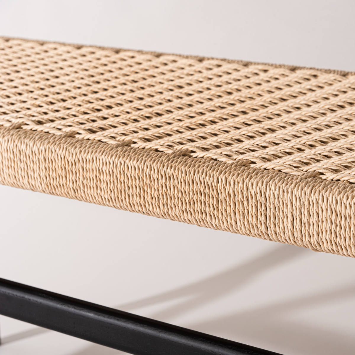 座面にぺーパーコードを使用したベンチです。ぺーパーコードは樹脂を含ませてねじった紙紐のことで、長く使うほどにお尻にフィットしてくる座り心地の良さが魅力です。革やファブリックとは一味違った、自然で軽やかな風合いをお楽しみいただけます。