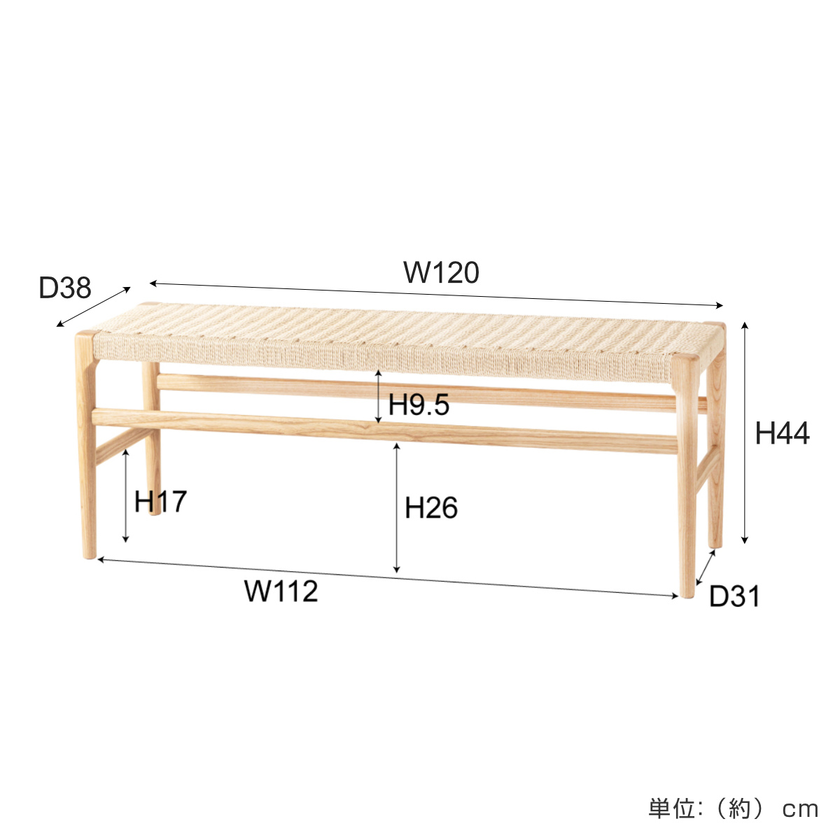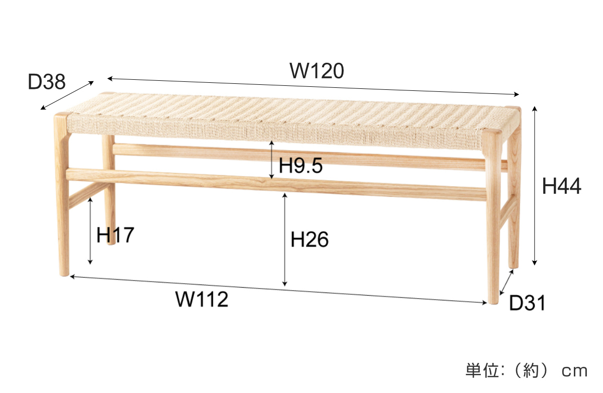 - 約幅120×奥行38×高さ44cm