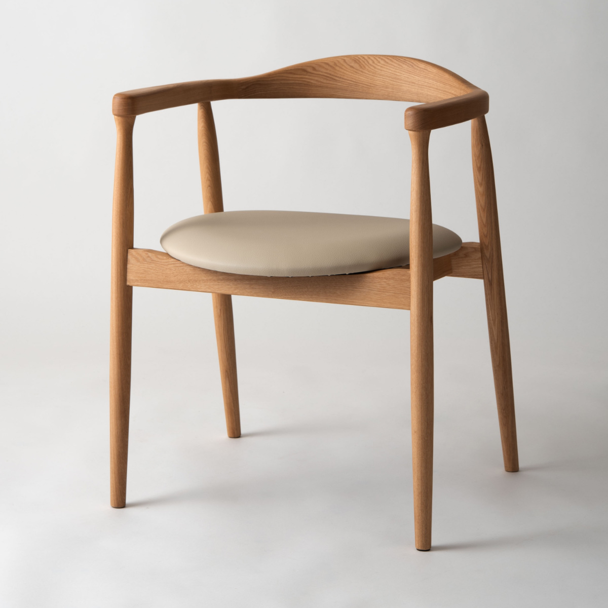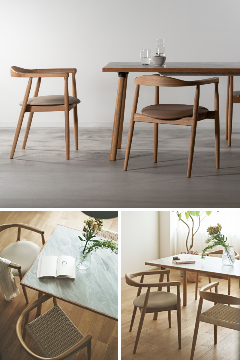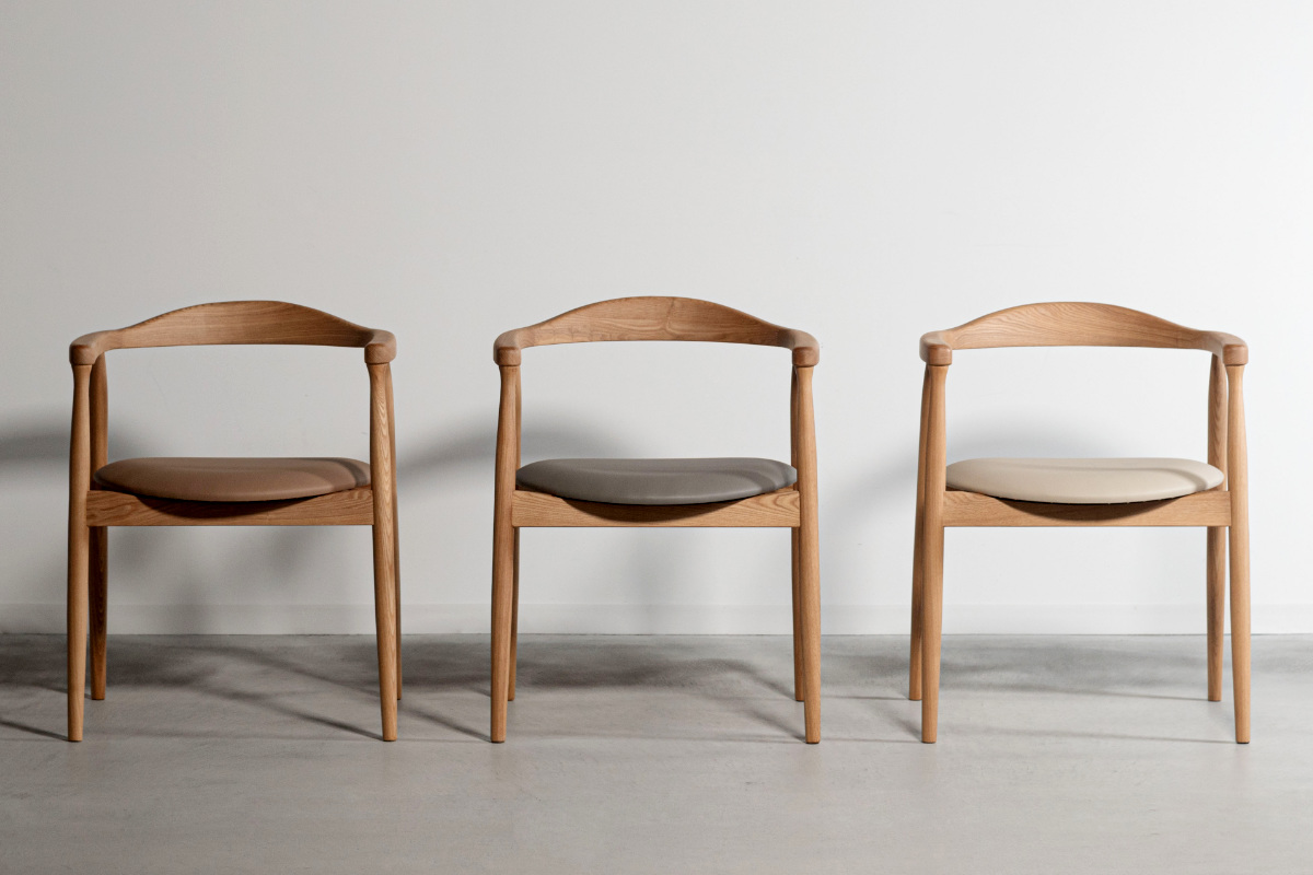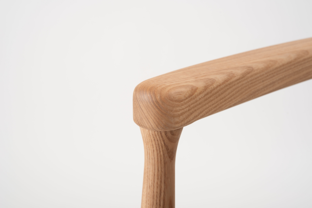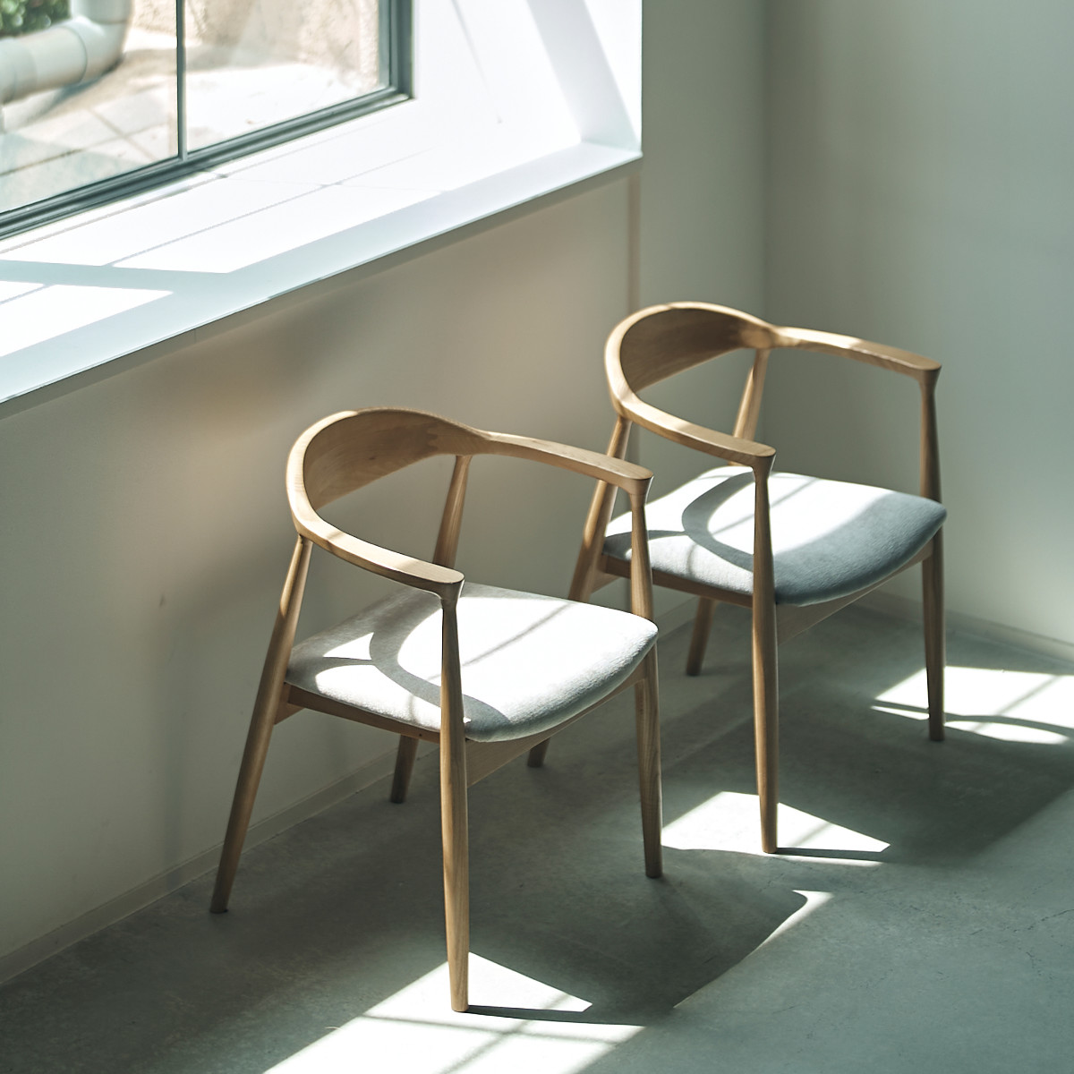 天然木の背もたれとアームは、丸みをもたせつつ細身でシャープなシルエットに。木の温かみある質感にすっきりとした印象を重ね、やさしさと洗練、その両方をあわせもつデザインに仕上げました。