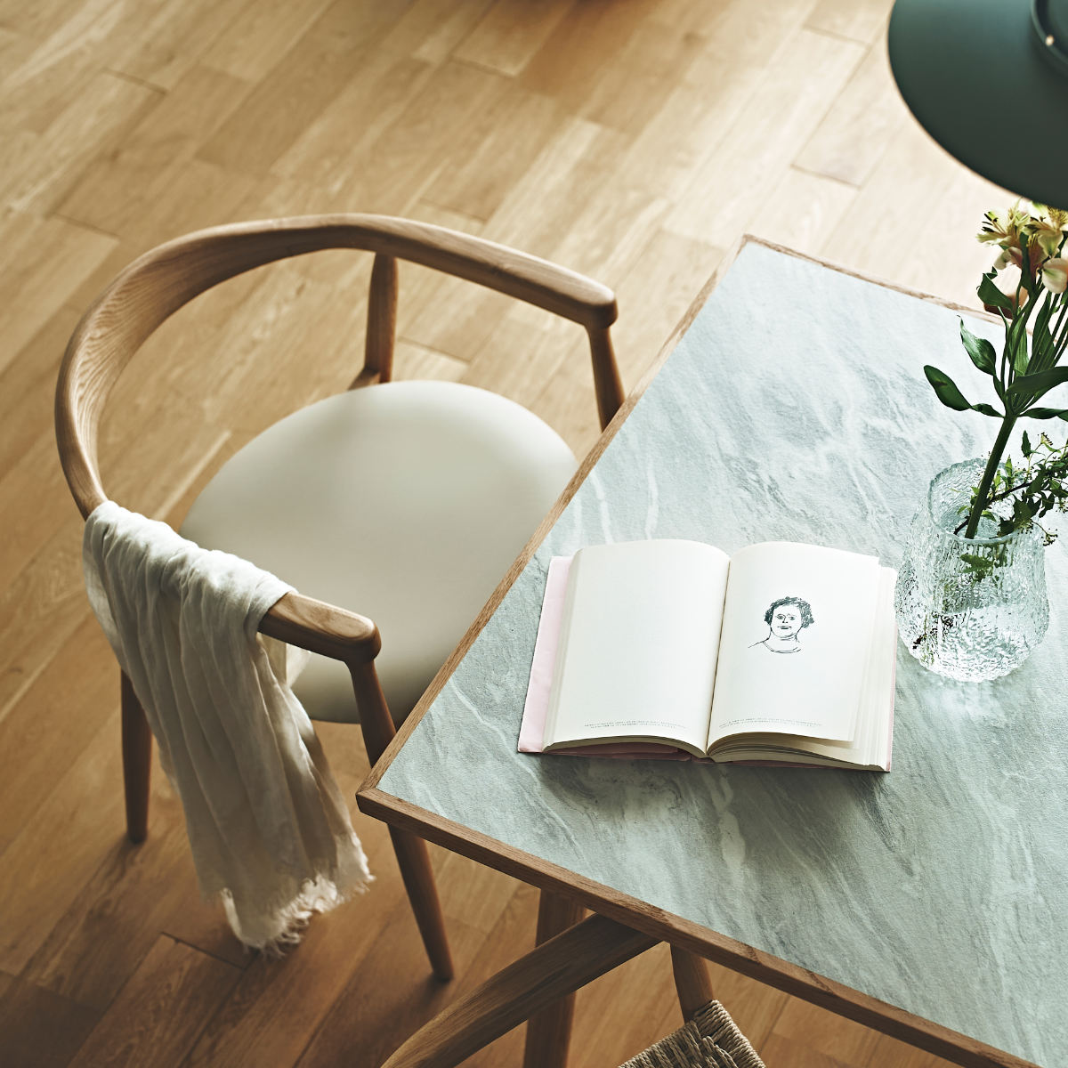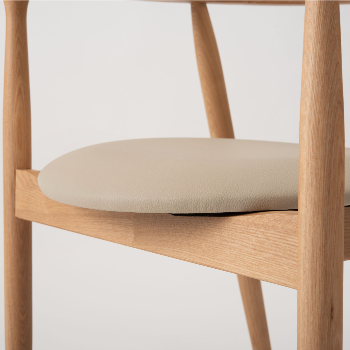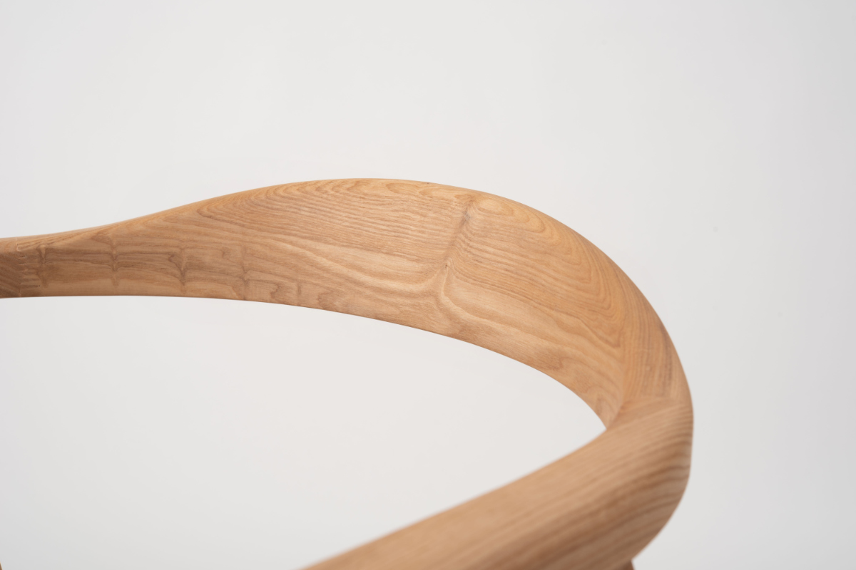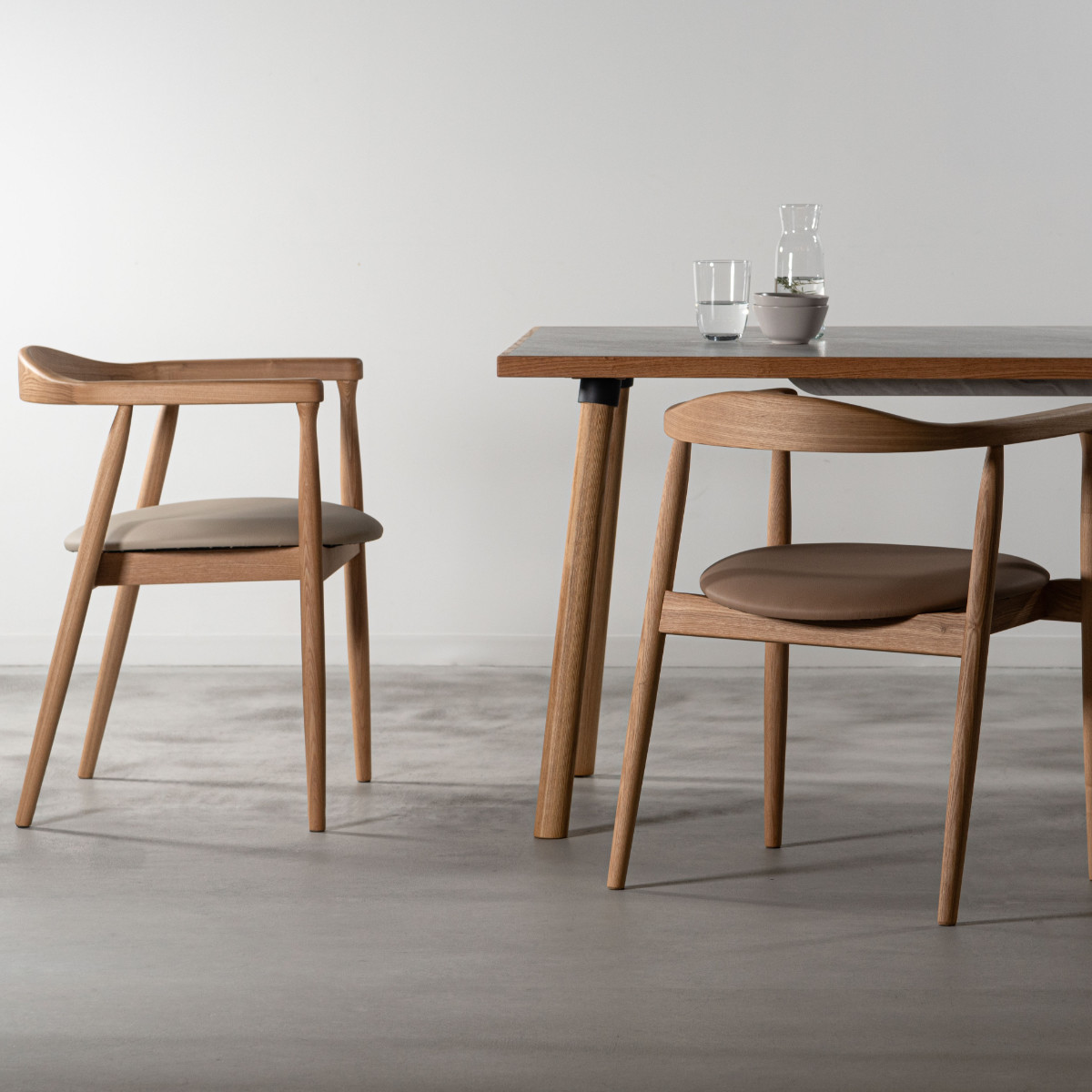 天然木の背もたれとアームは、丸みをもたせつつ細身でシャープなシルエットに。木の温かみある質感にすっきりとした印象を重ね、やさしさと洗練、その両方をあわせもつデザインに仕上げました。