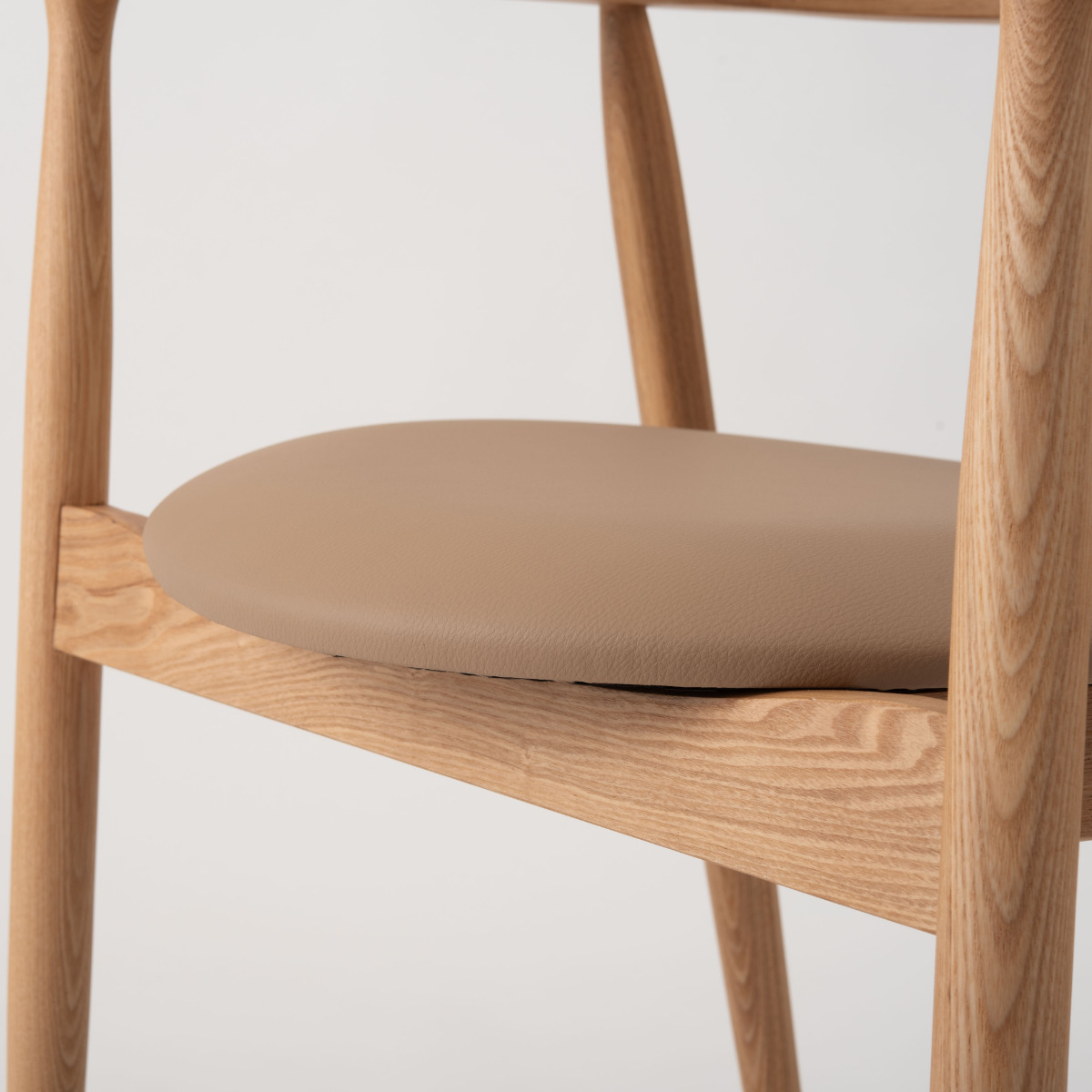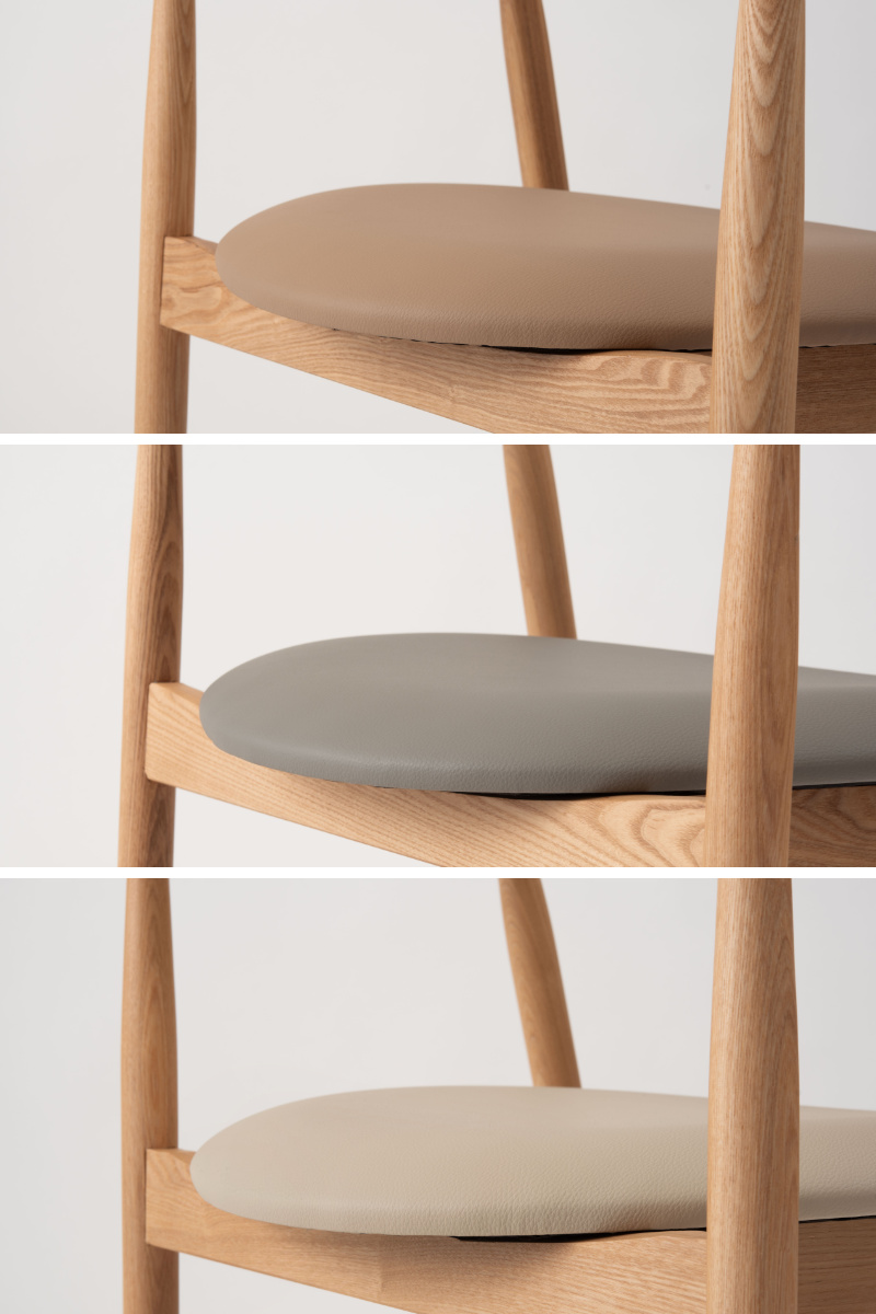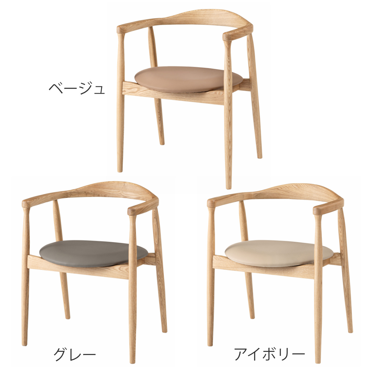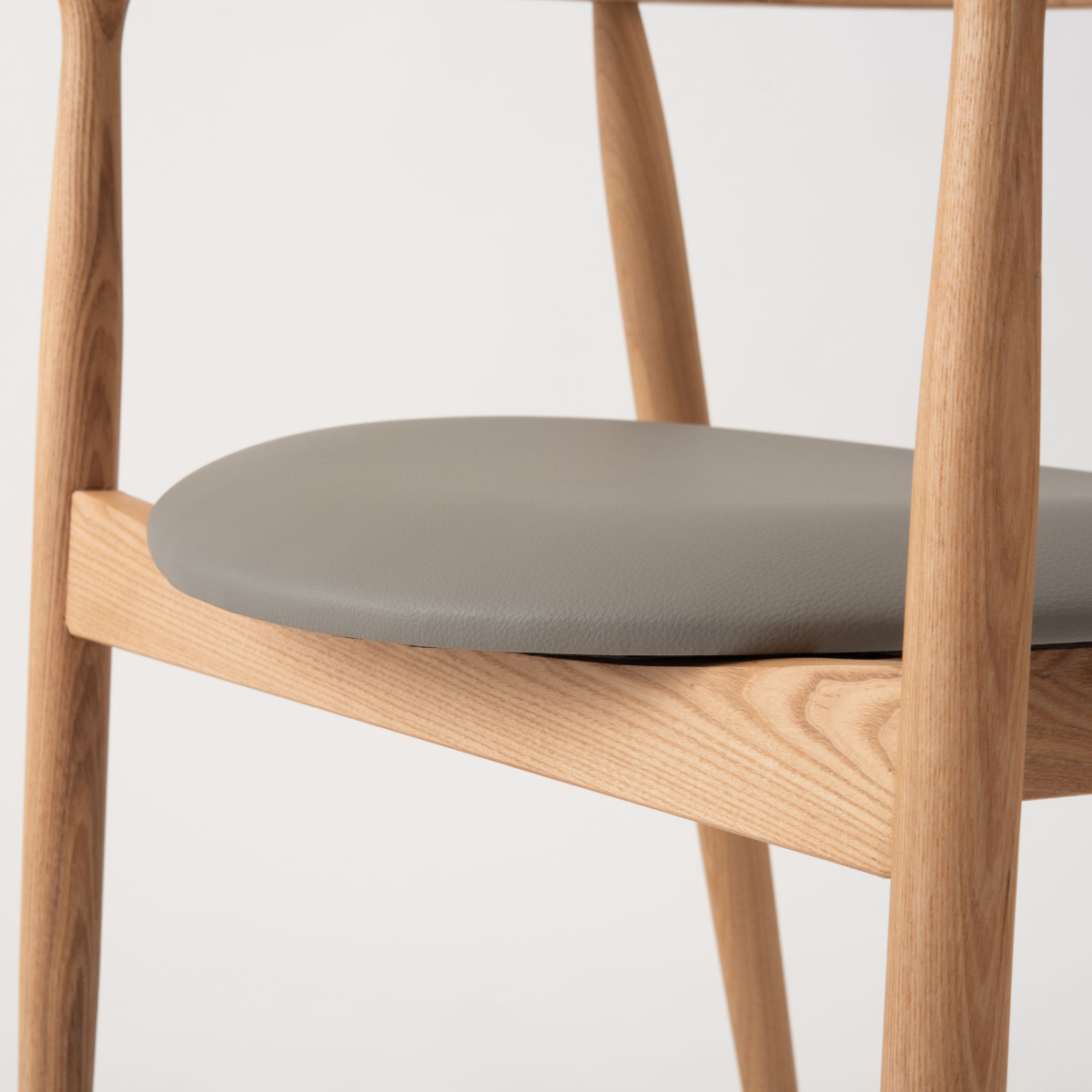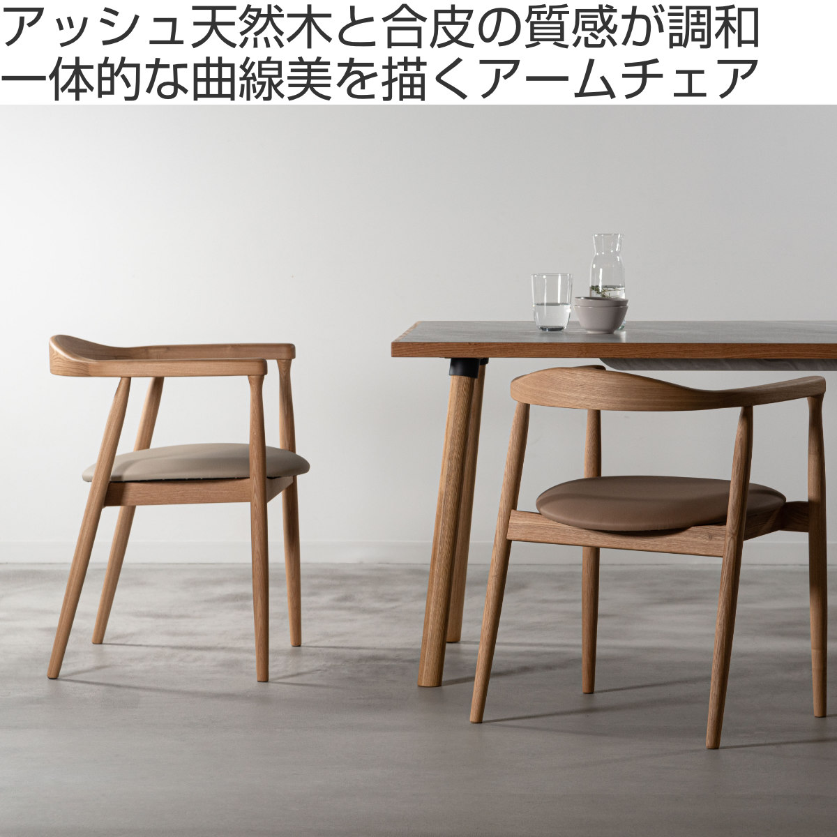 上品な印象の合皮と、アッシュ天然木の木目が美しく調和したダイニングチェアです。背とアームはエッジを落とした曲線仕上げに。丸みを帯びた脚部と相まって、どこから見ても、しなやかなフォルムに仕上げています。