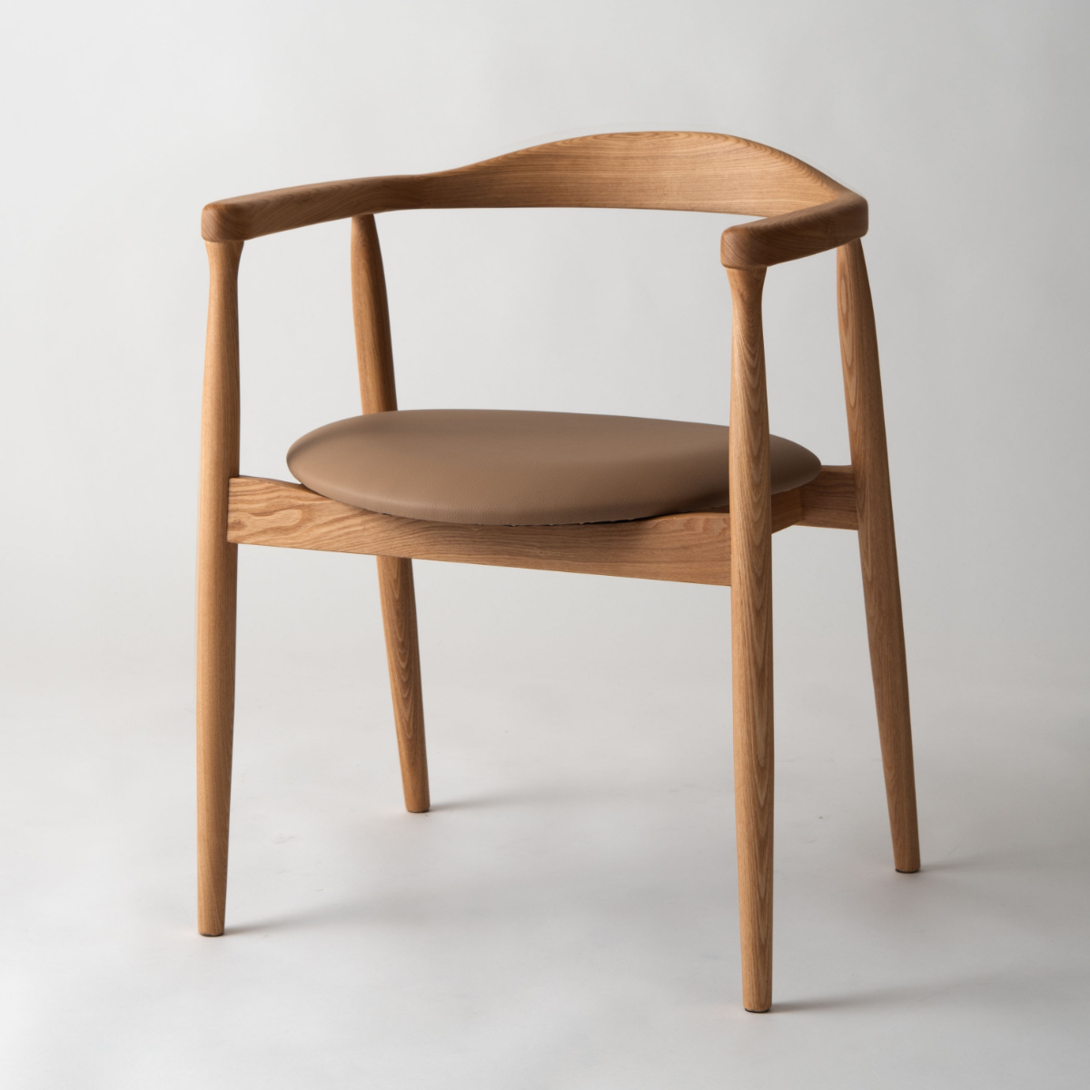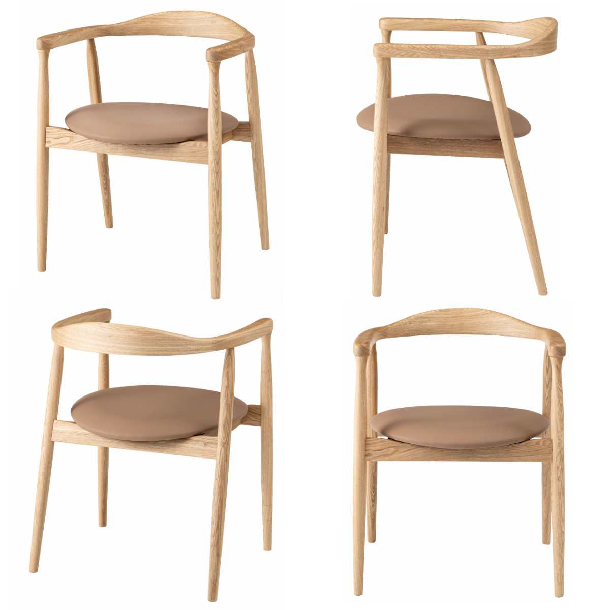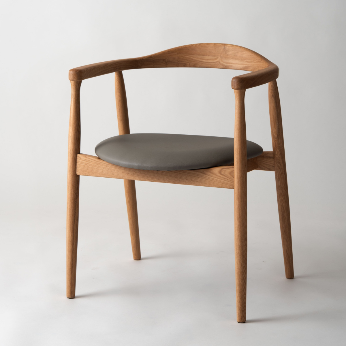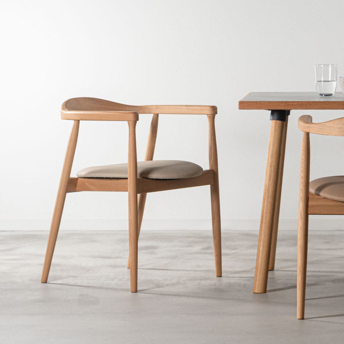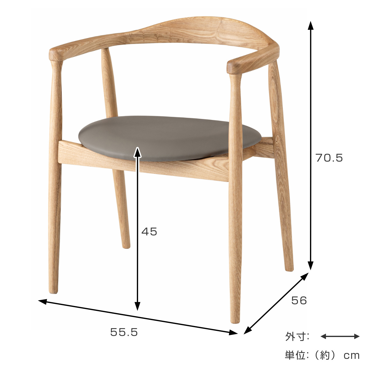 上品な印象の合皮と、アッシュ天然木の木目が美しく調和したダイニングチェアです。背とアームはエッジを落とした曲線仕上げに。丸みを帯びた脚部と相まって、どこから見ても、しなやかなフォルムに仕上げています。